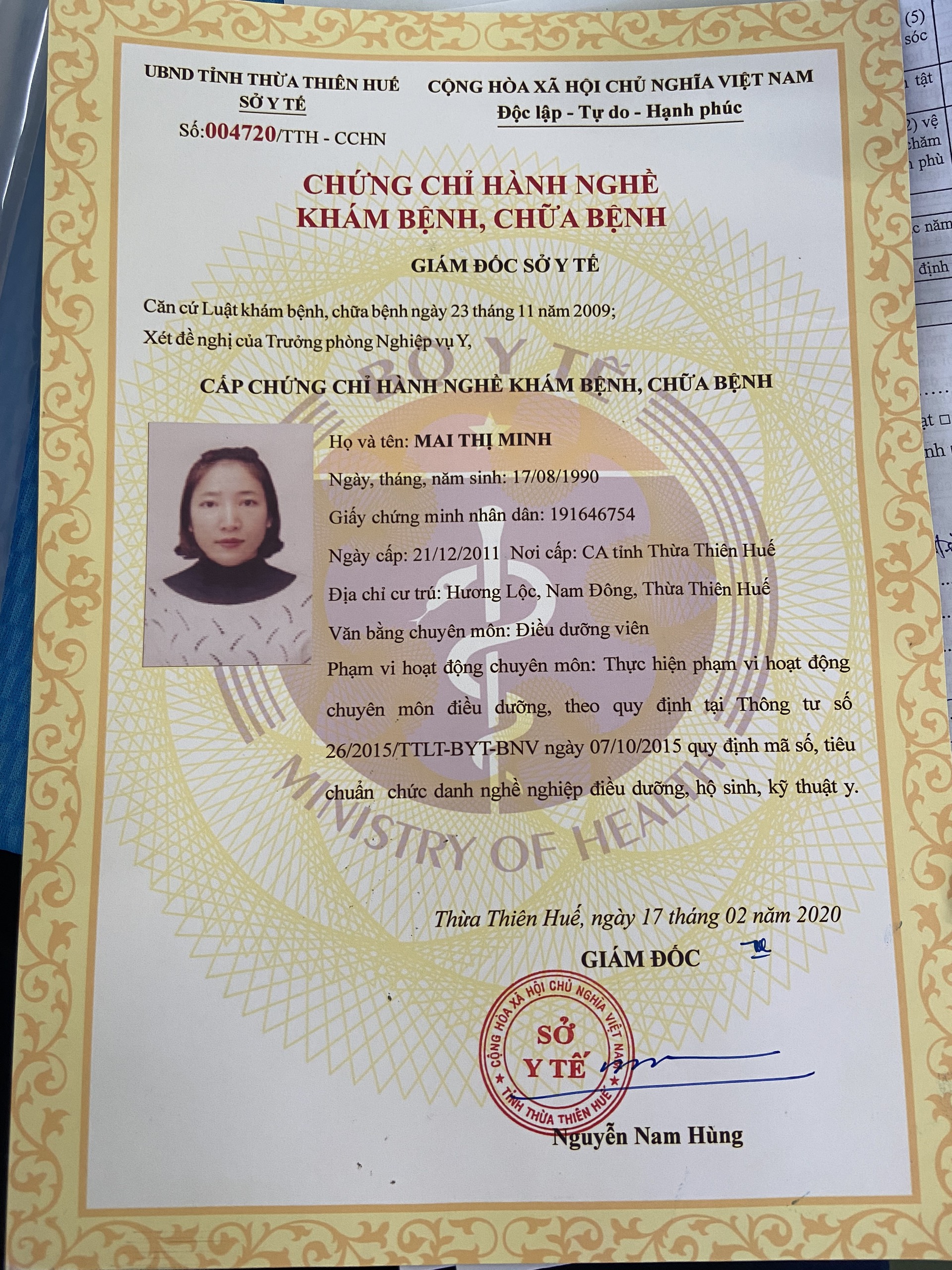 Chứng chỉ hành nghề của cán bộ y tế trường Mầm non Hương Giang