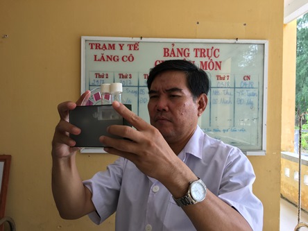 Cán bộ Trung tâm KSBT tỉnh lấy mẫu nước tại TYT thị trấn Lăng Cô