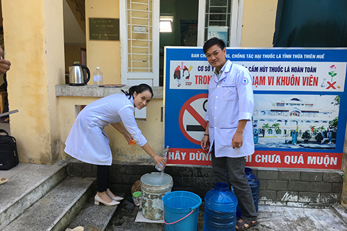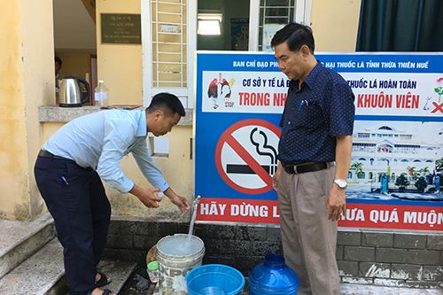 Cán bộ Trung tâm KSBT và nhân viên công ty HUEWACO lấy mẫu nước tại Trạm Y tế Lộc Bình