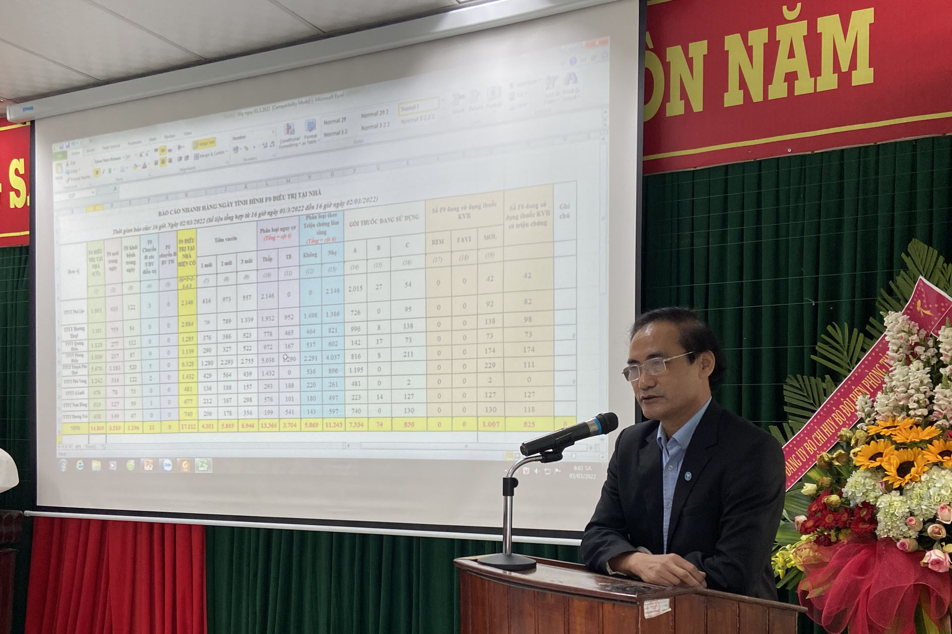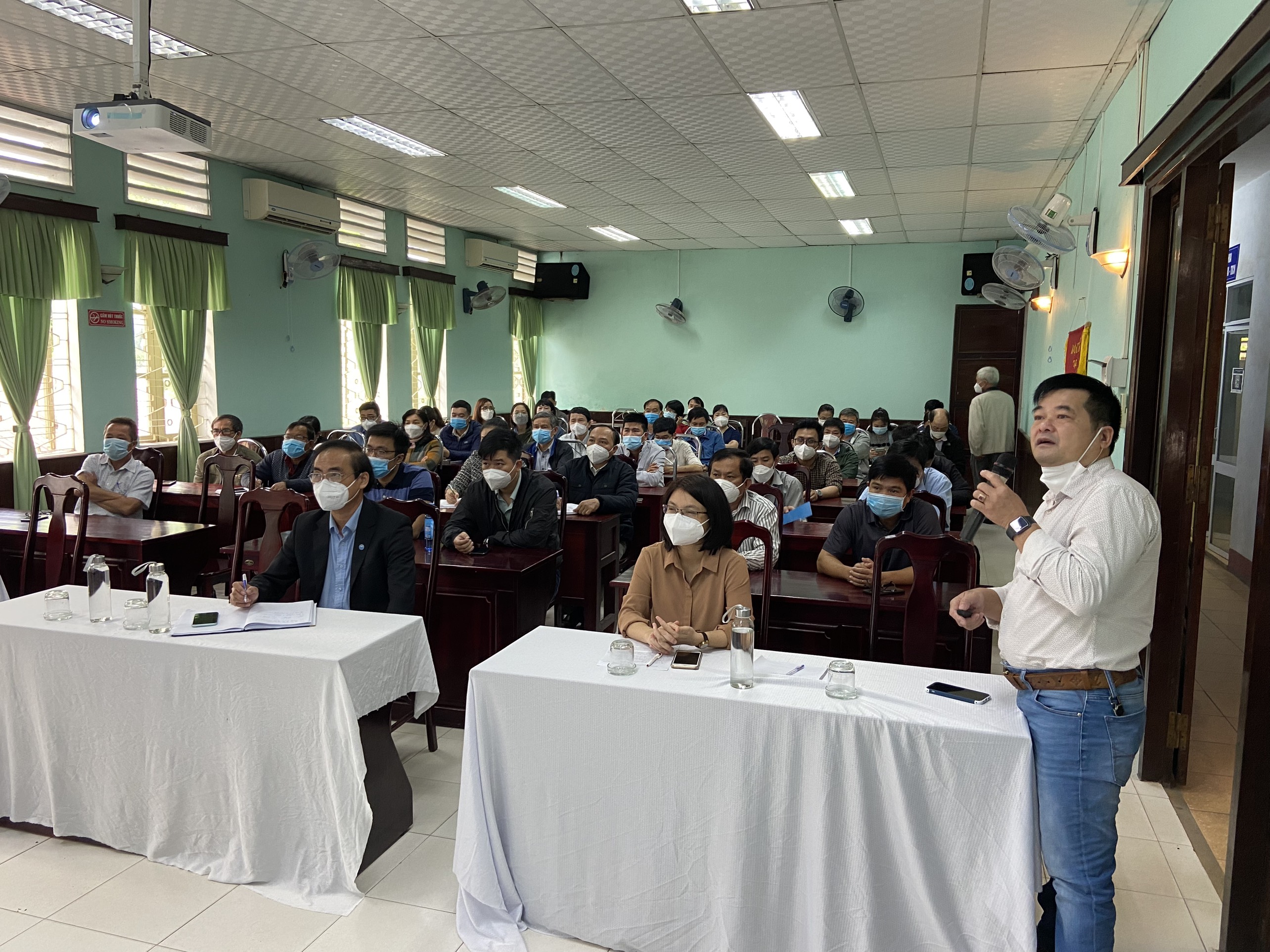 BS.CKII. Hoàng Văn Thám - Phó Giám đốc Trung tâm Kiểm soát bệnh tật phát biểu khai mạc, chỉ đạo lớp tập huấn. Khái quát tình hình dịch bệnh Covid-19 hiện nay trên địa bàn tỉnh, bệnh nhân nhiễm Covid-19 điều trị tại nhà.