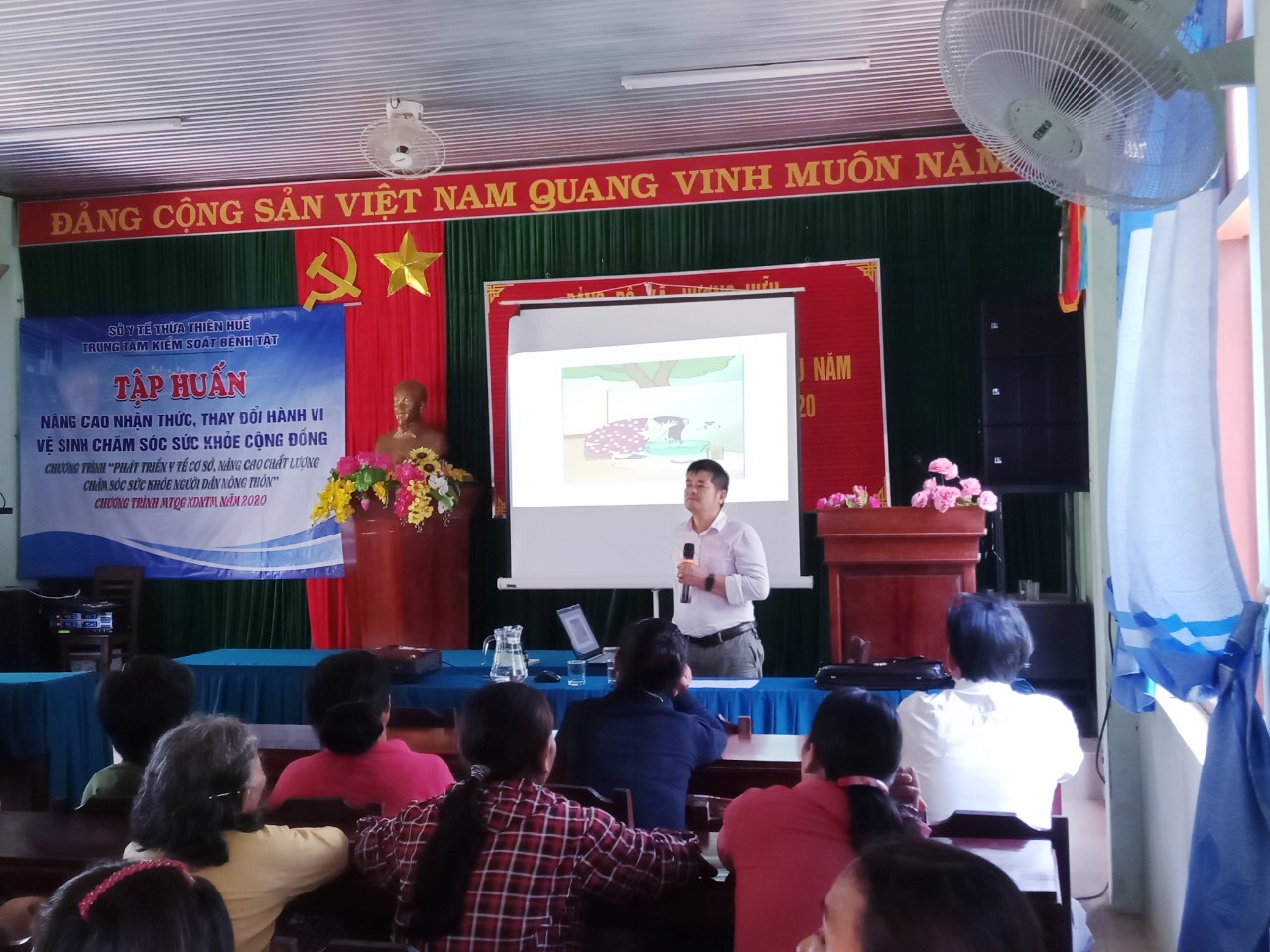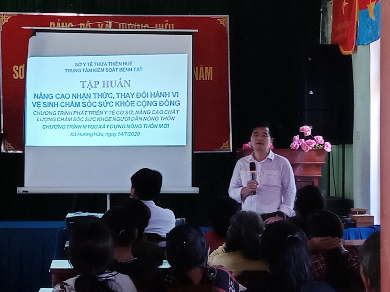 Ngày 14/7/2020<span style="background-image:initial;background-position:initial;background-size: initial; background-repeat:initial;background-attachment:initial;background-origin: initial; background-clip: initial"> Trung tâm Kiểm soát bệnh tật tỉnh tổ chức tập huấn nâng cao nhận thức, thay đổi hành vi vệ sinh, chăm sóc sức khỏe cộng đồng <span style="background-image:initial;background-position:initial;background-size: initial; background-repeat:initial;background-attachment:initial;background-origin: initial; background-clip: initial">cho người dân tại xã Hương Hữu, huyện Nam Đông.