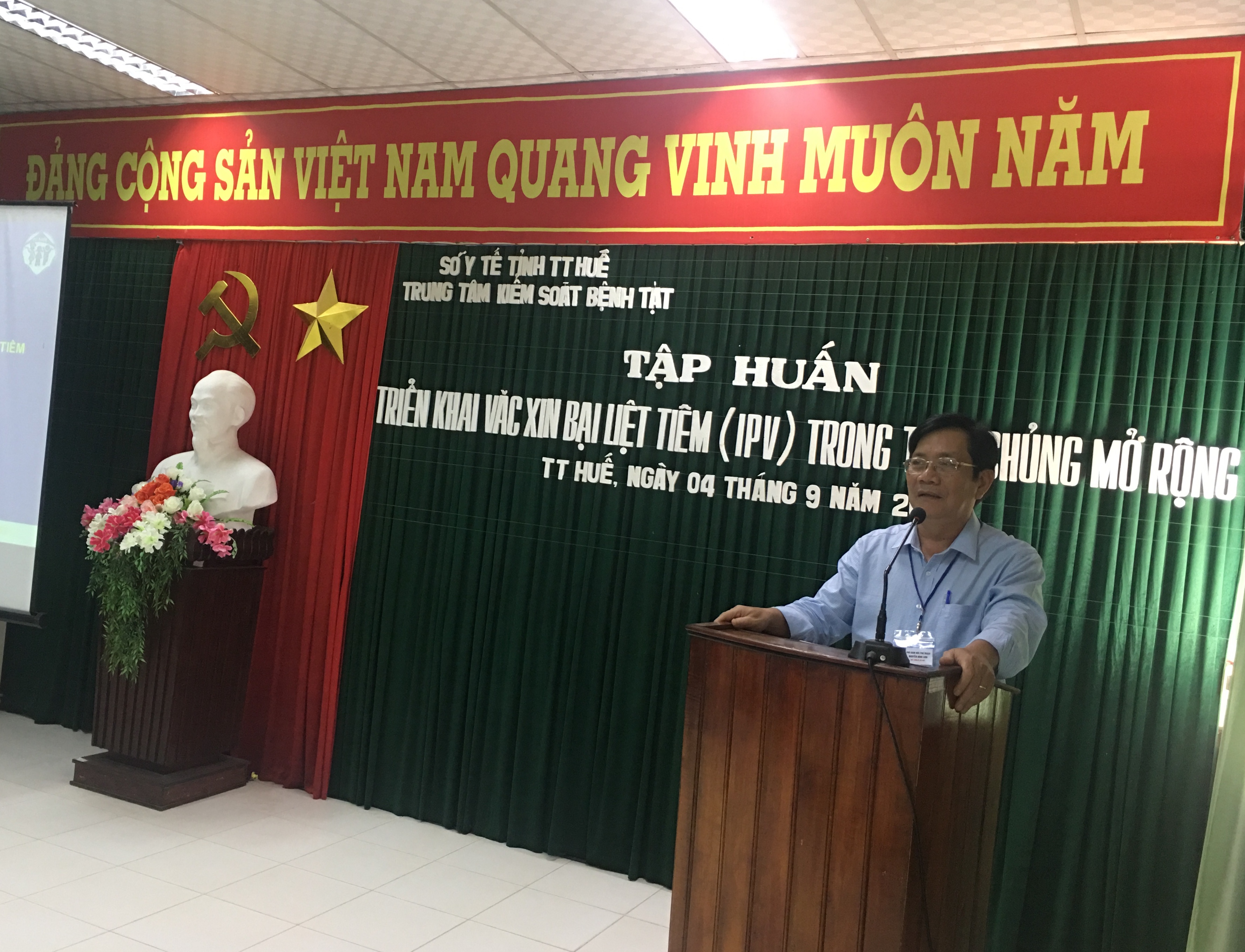 Phát biểu khai mạc lớp tập huấn Pgs.Ts Nguyễn Đình Sơn- Phó giám đốc phụ trách TTKSBT tỉnh đánh giá cao hiệu quả thực hiện chương trình tiêm chủng mở rộng thời gian qua và sự cần thiết của việc triển khai vắc xin IPV trong TCMR nhằm bảo vệ thành quả thanh toán bệnh bại liệt trên toàn thế giới.