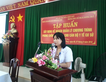 Ngày 06-9-2018, Trung tâm kiểm soát bệnh tật (TT-KSBT) tỉnh Thừa Thiên Huế và TTYT Thị xã Hương Thủy phối hợp tổ chức lớp tập huấn cho 24 cán bộ tại 12 Trạm Y tế xã, phường trên địa bàn Thị xã Hương Thủy về nội dung “Xây dựng kế hoạch quản lý chương trình phòng, chống HIV/AIDS cho cán bộ tuyến y tế cơ sở”.