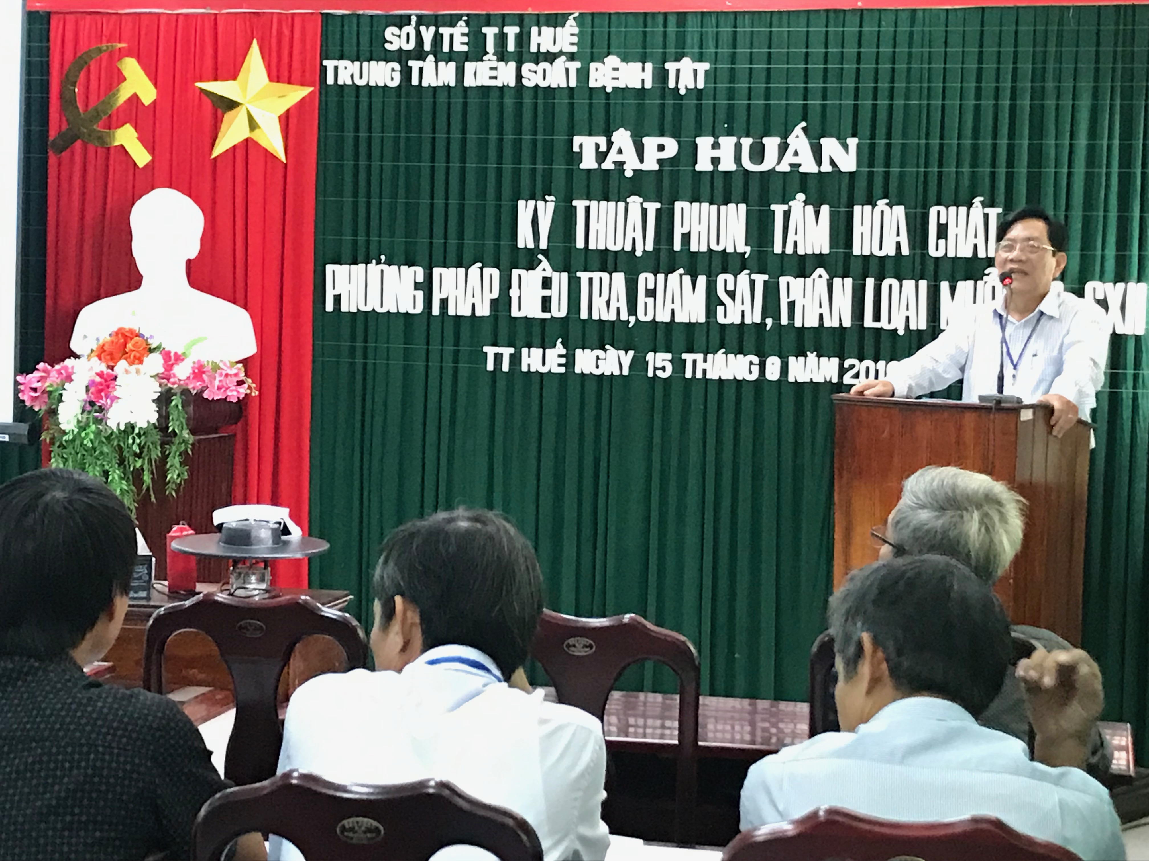 Phát biểu khai mạc lớp tập huấn, PGS.Ts Nguyễn Đình Sơn - Phó giám đốc phụ trách TTKSBT nêu lên sự cần thiết của lớp tập huấn nhằm đào tạo, bồi dưỡng kiến thức chuyên môn cho các cán bộ phụ trách, các cán bộ mới của các huyện/ thị xã/ thành phố để thực hiện đúng, kịp thời các qui trình về điều tra, giám sát và xử lý véc tơ và xử dụng máy phum diệt muỗi truyền bệnh sốt xuất huyết, sốt rét đảm bảo cho công tác PCD bệnh trên địa bàn tỉnh Thừa Thiên Huế.