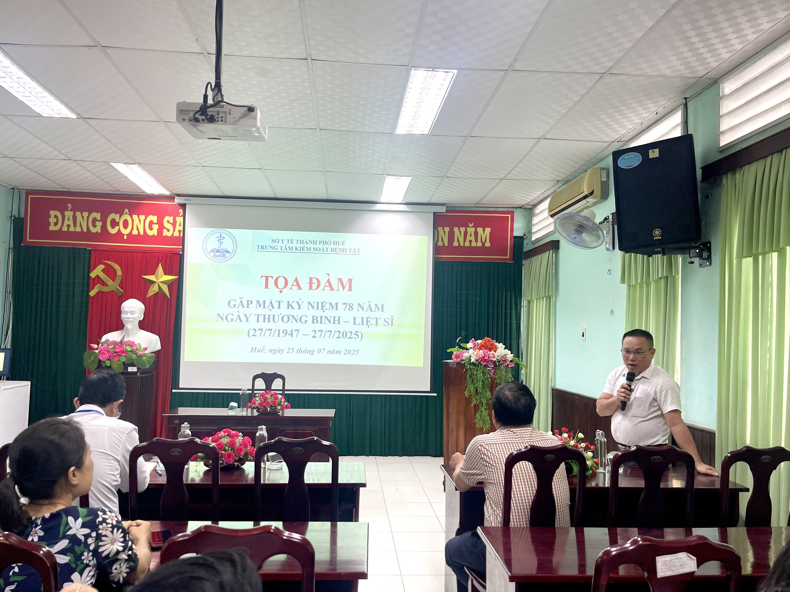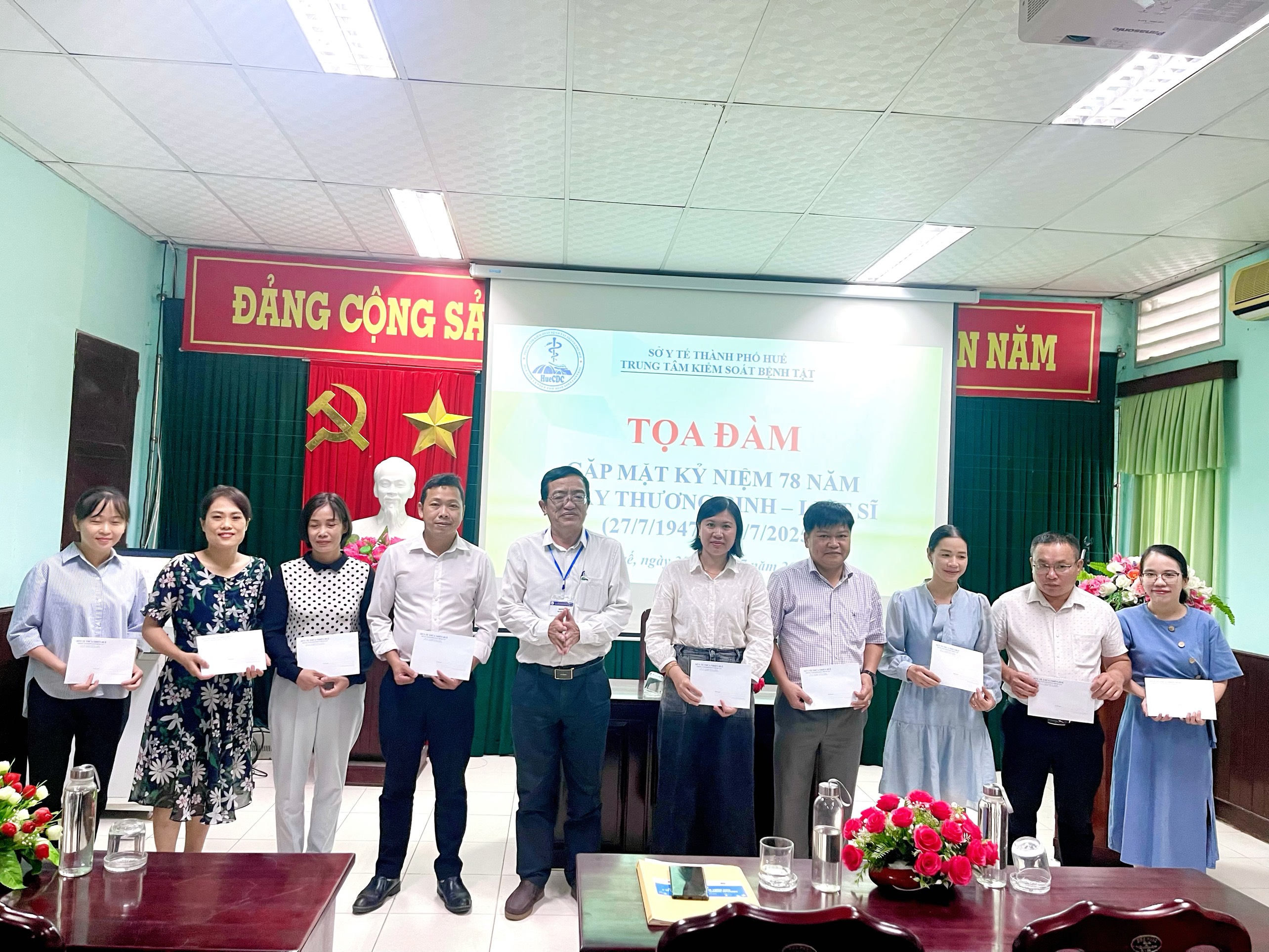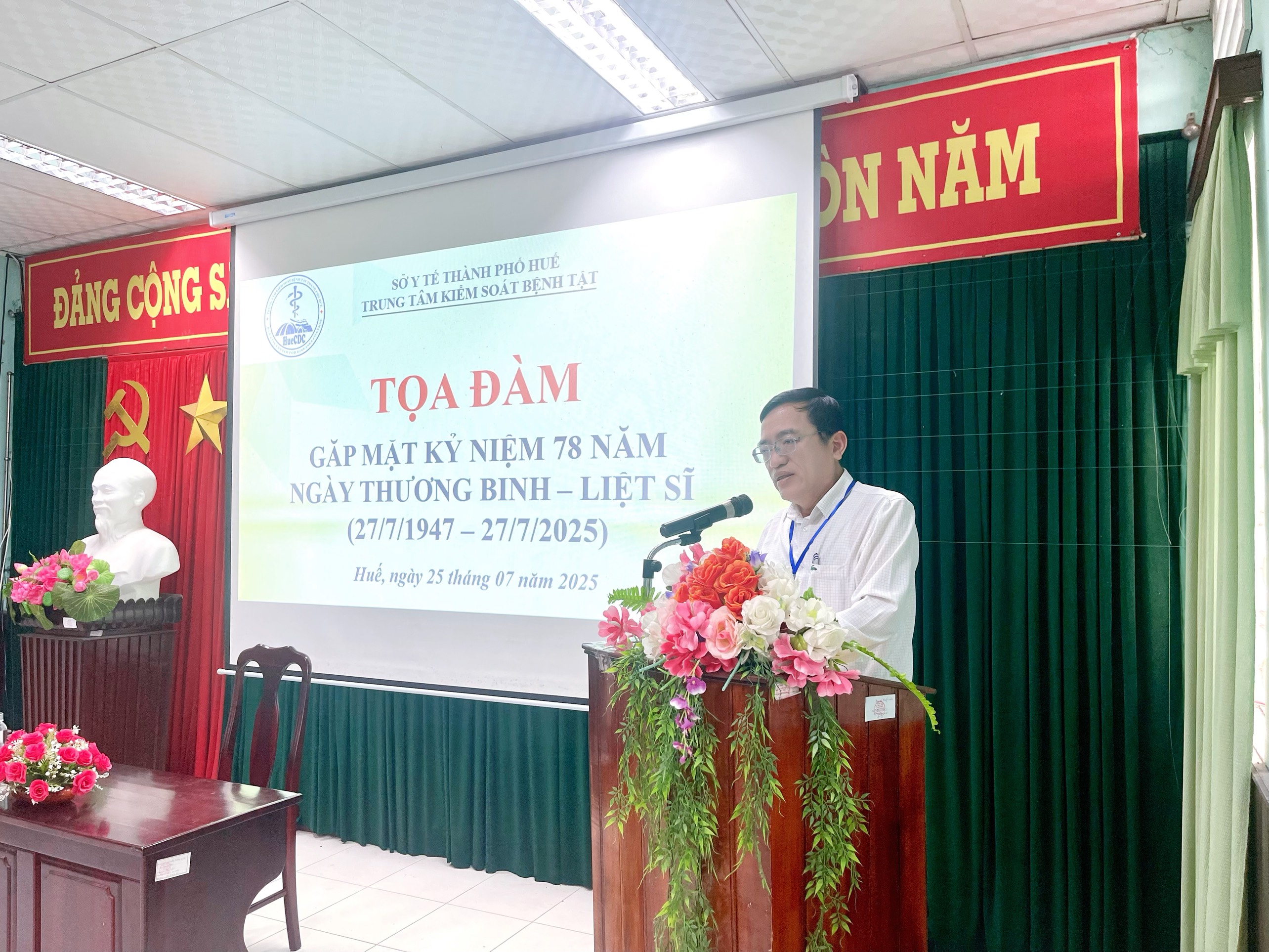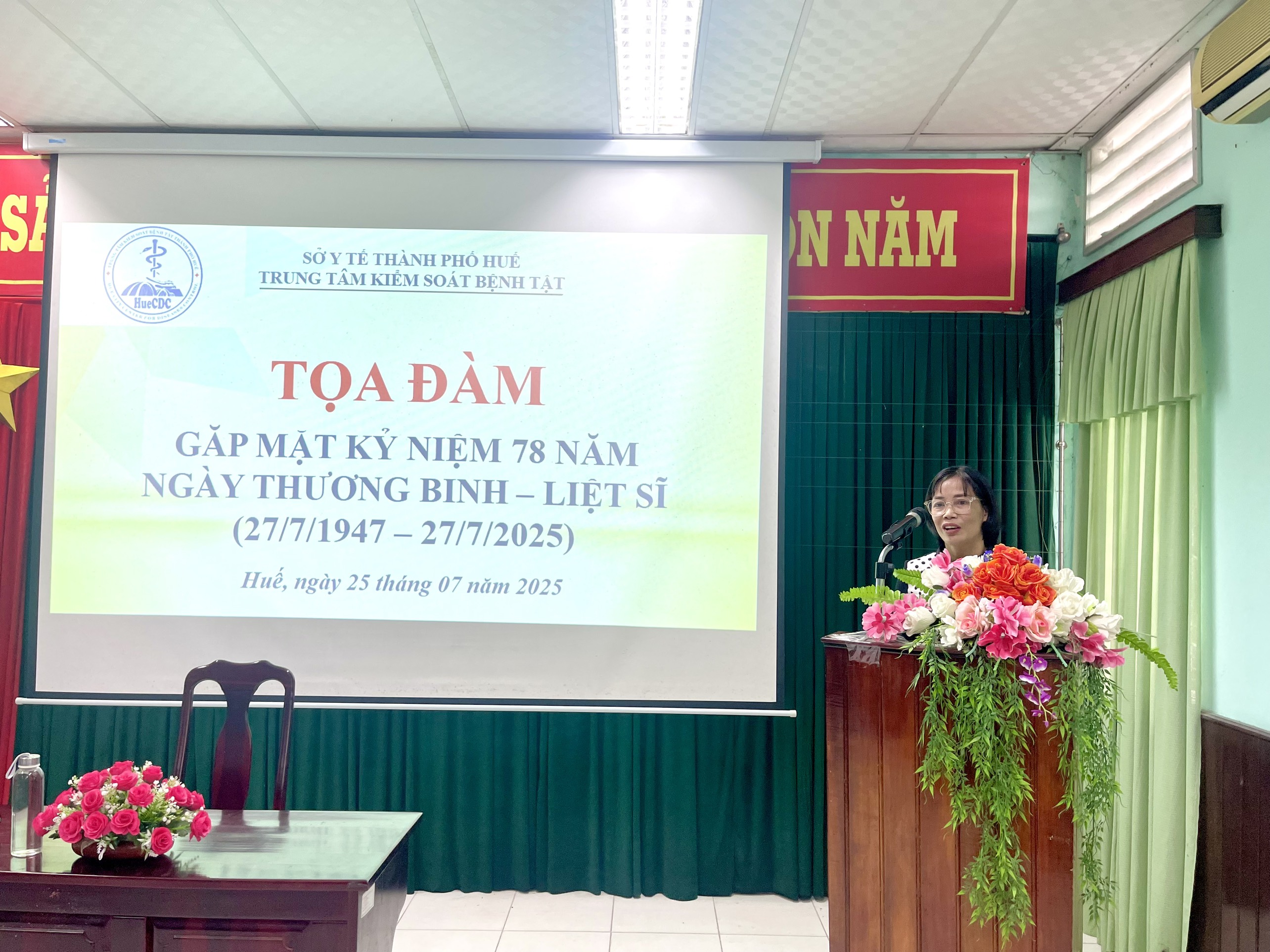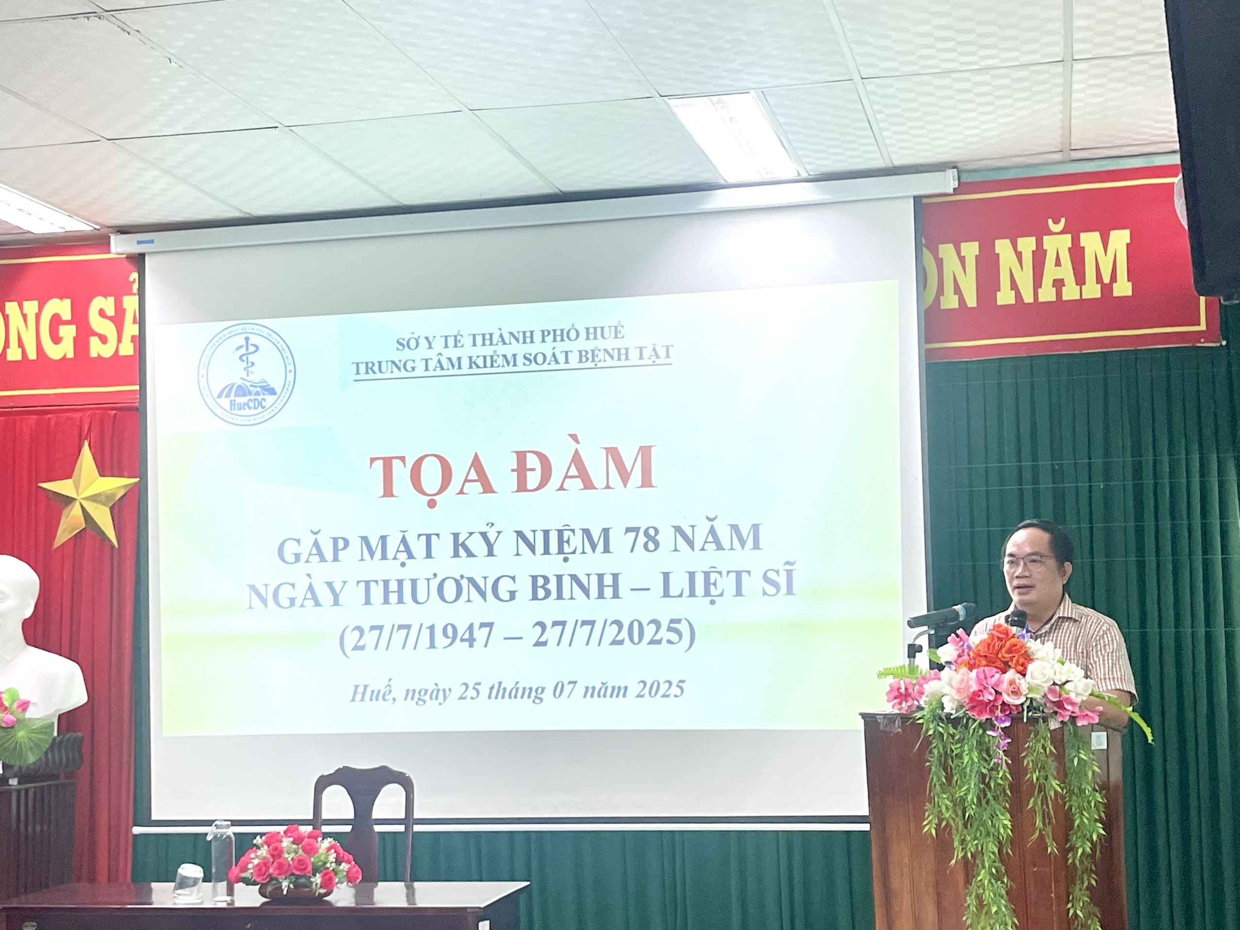 Thực hiện Kế hoạch số 913/KH-KSBT ngày 08 tháng 7 năm 2025 của Trung tâm Kiểm soát bệnh tật thành phố về tổ chức các hoạt động kỷ niệm 78 năm Ngày Thương binh - Liệt sỹ (27/7/1947-27/7/2025). Chiều ngày 25/7/2025, tại Hội trường Trung tâm Kiểm soát bệnh tật thành phố Huế tổ chức tọa đàm, gặp mặt kỷ niệm 78 năm Ngày Thương binh - Liệt sĩ (27/7/1947 - 27/7/2025). Đến tham dự buổi tọa đàm có ThSBSCKII. Nguyễn Lê Tâm - Phó Giám đốc phụ trách Trung tâm Kiểm soát bệnh tật; có đại diện Ban chấp hành Đảng bộ, đại diện Ban chấp hành Công đoàn cơ sở, đại diện Ban chấp hành Đoàn thanh niên, đại diện lãnh đạo các khoa/phòng và cán bộ, viên chức là con liệt sĩ, con thương binh đang công tác tại đơn vị.
