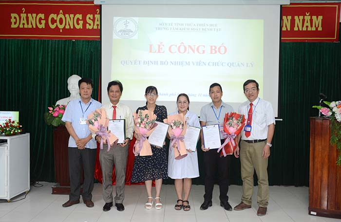 Ban Giám đốc Trung tâm Kiểm soát bệnh tật trao Quyết định và tặng hoa chúc mừng các viên chức được bổ nhiệm quản lý.