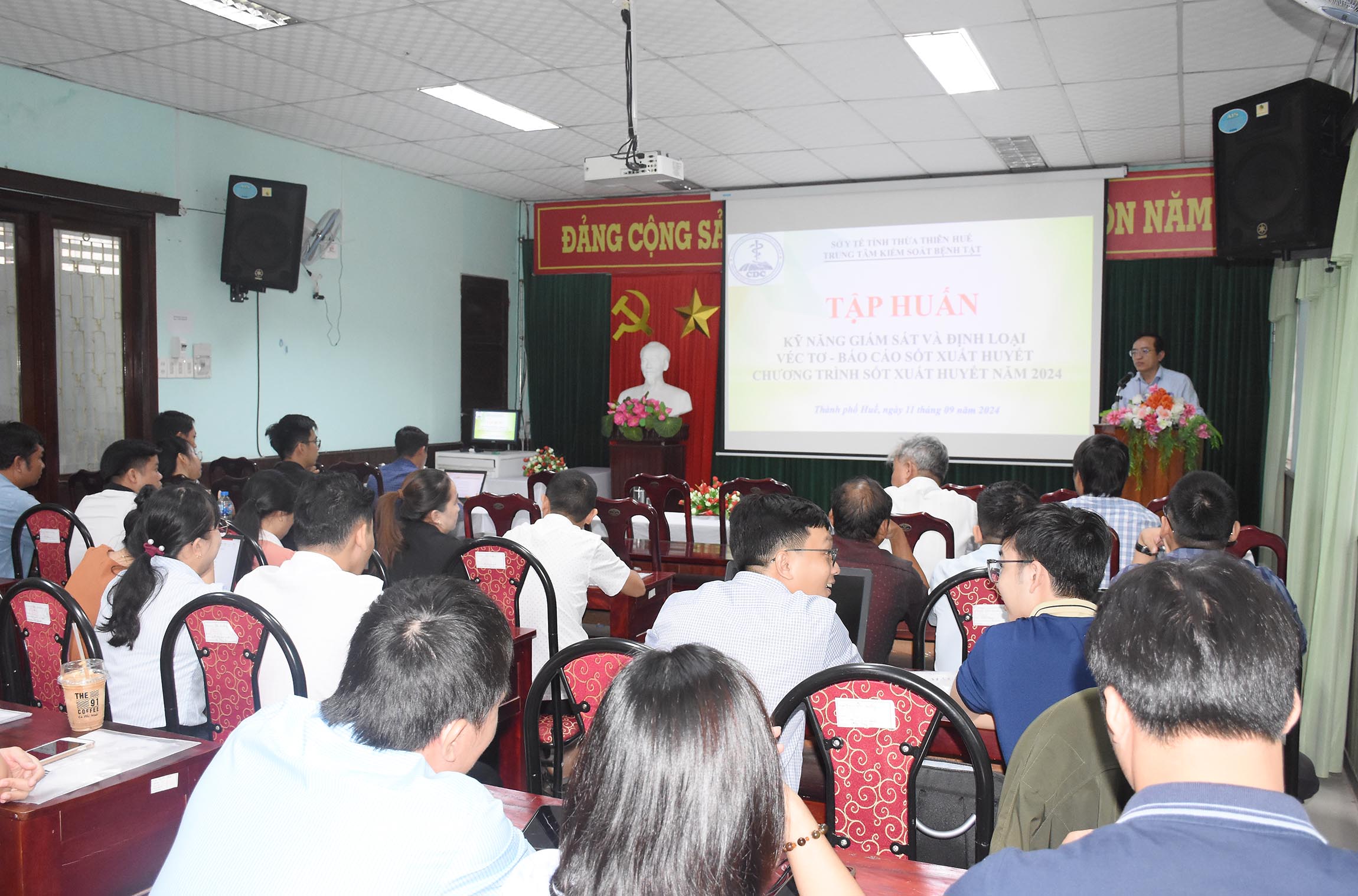 Lớp tập huấn cũng đã hệ thống lại các văn bản chỉ đạo, hướng dẫn của Bộ Y tế, Viện Vệ sinh dịch tễ Trung ương, UBND tỉnh và Sở Y tế Thừa Thiên Huế về việc Hướng dẫn giám sát Phòng, chống bệnh SXHD và đáp ứng với dịch, bệnh truyền nhiễm. Hướng dẫn thực hiện Quy trình giám sát, xử lý dịch và phân tuyến điều trị bệnh SXHD tỉnh Thừa Thiên Huế. Gồm các bước: Xác định ổ dịch; Nơi thông báo ổ dịch, Thời gian thực hiện; Các biện pháp, quy mô xử lý ổ dịch và Trình tự tiến hành xử lý ổ dịch SXHD. Tổ chức phun hóa chất chủ động diệt muỗi kết hợp với chiến dịch diệt lăng quăng/bọ gậy ngay từ đầu nhằm ngăn chặn nguy cơ dịch bùng phát. Hoàn thiện các biểu mẫu, phiếu điều tra véctơ, hồ sơ xử lý dịch theo đúng quy định.../.