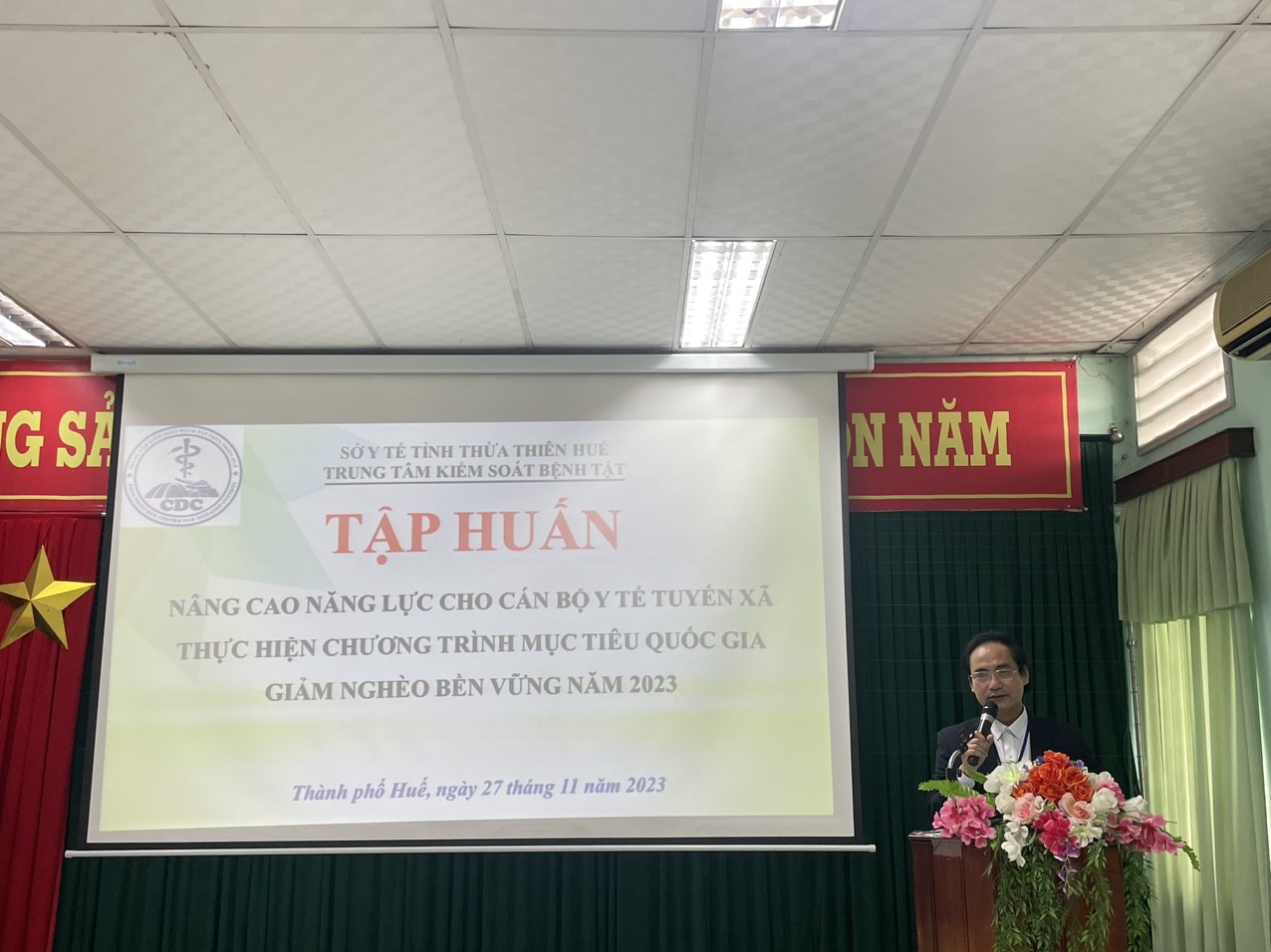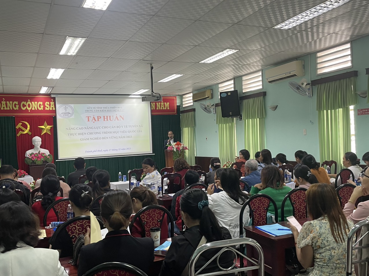 Thực hiện kế hoạch số 121/KH-UBND ngày 25/3/2022 của UBND tỉnh Thừa Thiên Huế về việc thực hiện Chương trình mục tiêu quốc gia giảm nghèo bền vững giai đoạn 2021-2025 trên địa bàn tỉnh Thừa thiên Huế, nhằm cập nhật những kiến thức trong hoạt động phòng chống suy dinh dưỡng trẻ em dưới 16 tuổi, sáng ngày 27/11/2023 Trung tâm kiểm soát bệnh tật tỉnh Thừa Thiên Huế đã tổ chức lớp tập huấn cho 58 cán bộ chuyên trách dinh dưỡng tuyến huyện, xã thuộc 25 xã nghèo, xã đặc biệt khó khăn, vùng bãi ngang, ven biển huyện Phong Điền, huyện Phú Vang, huyện Phú Lộc, huyện A lưới.