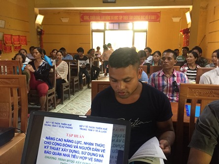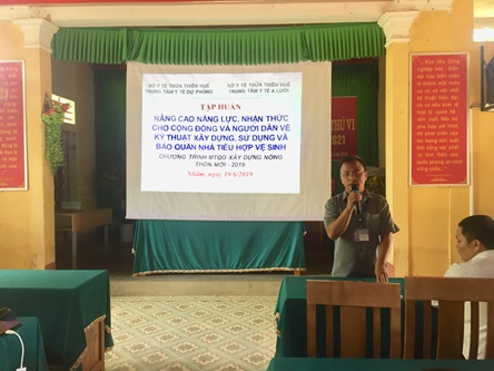 ThS. Trần Bá Thanh – Trưởng khoa Sức khỏe môi trường – Y tế trường học, Trung tâm Kiểm soát bệnh tật tỉnh Thừa Thiên Huế, trình bày các nội dung của lớp tập huấn: Giới thiệu các mô hình nhà tiêu hợp vệ sinh theo quy định của Bộ y tế bao gồm: Nhà tiêu tự hoại, thấm dội nước, hai ngăn sinh thái, chìm có ống thông hơi. Nhân rộng mô hình nhà tiêu hợp vệ sinh trong cộng đồng; Tập huấn kỹ thuật xây dựng, sử dụng và bảo quản các loại nhà tiêu hợp vệ sinh hộ gia đình; Nâng cao nhận thức cho người dân tham gia xây dựng, cải tạo nhà tiêu hợp vệ sinh hộ gia đình, làm giảm tỷ lệ mắc các bệnh lây truyền qua đường tiêu hóa tại các xã triển khai dự án, góp phần nâng cao sức khỏe nhân dân.