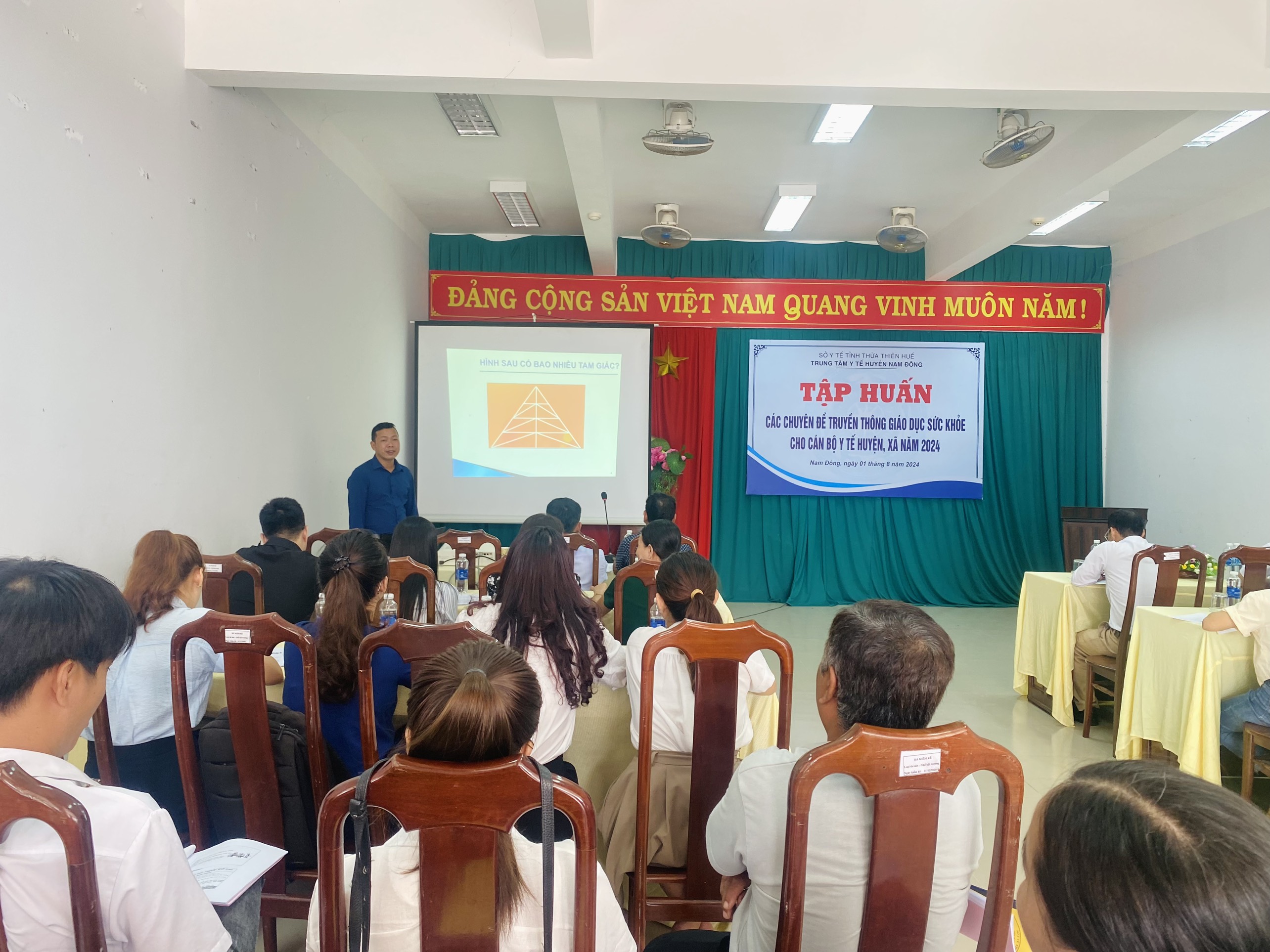 Ngày 01/8/2024, Trung tâm Y tế huyện Nam Đông tổ chức tập huấn các chuyên đề truyền thông giáo dục sức khỏe năm 2024 cho cán bộ y tế huyện, xã thuộc huyện Nam Đông. Đến tham dự lớp tập huấn, về phía Trung Kiểm soát bệnh tật tỉnh có ThS. Nguyễn Văn Cương - Trưởng khoa Truyền thông giáo dục sức khỏe; về phía Trung tâm Y tế huyện Nam Đông có BSCKI. Nguyễn Ngọc Thích - Phó Giám đốc và 52 học viên là đại diện cán bộ y tế các Khoa, phòng, cán bộ thuộc 10 Trạm Y tế xã, thị trấn của Trung tâm Y tế.