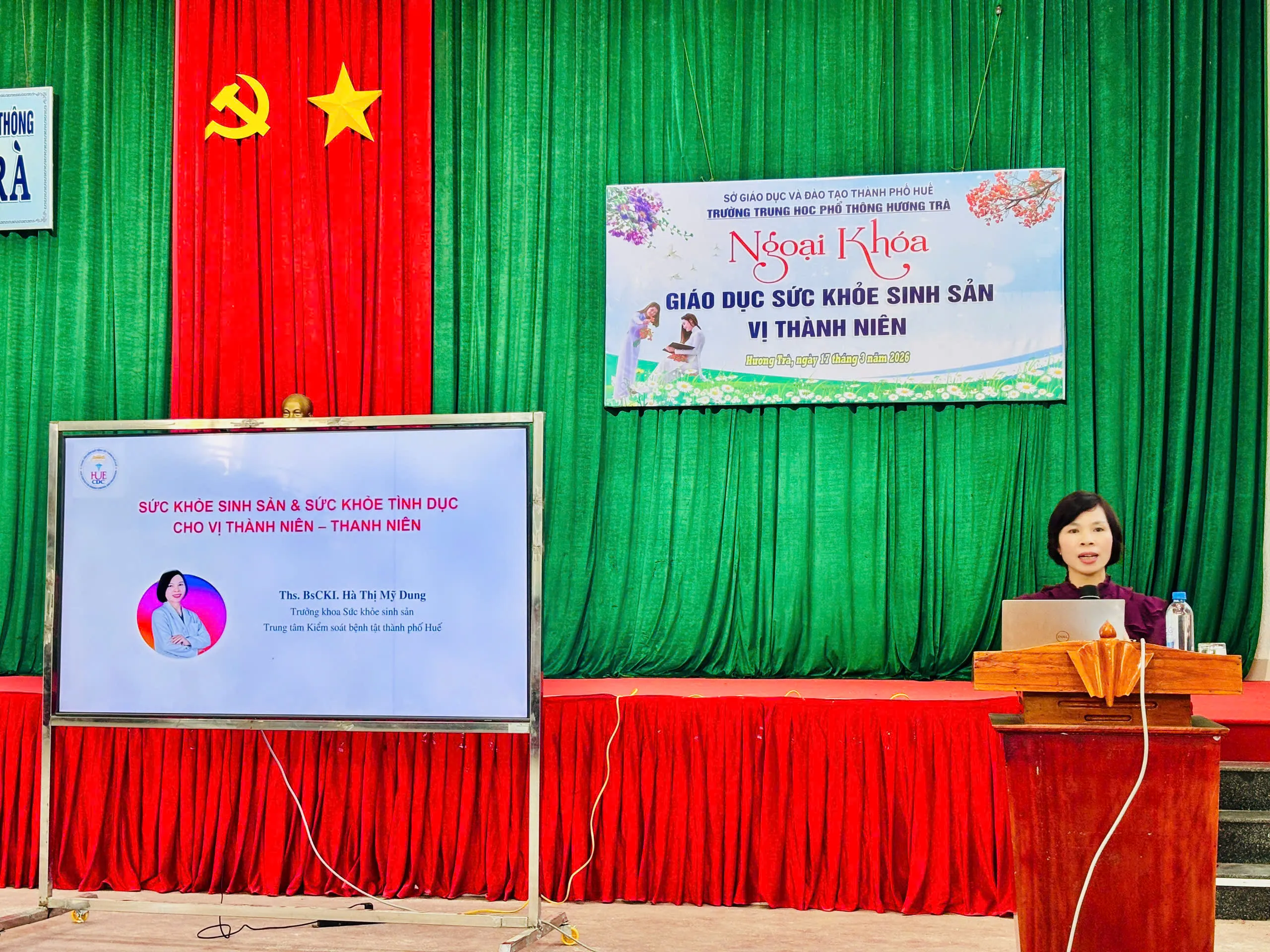 Tham dự buổi truyền thông có ThS.BS.CKI Hà Thị Mỹ Dung - Trưởng khoa Sức khỏe sinh sản, Trung tâm Kiểm soát bệnh tật thành phố Huế; đại diện Ban Giám hiệu nhà trường, giáo viên chủ nhiệm và đông đảo học sinh các khối lớp.