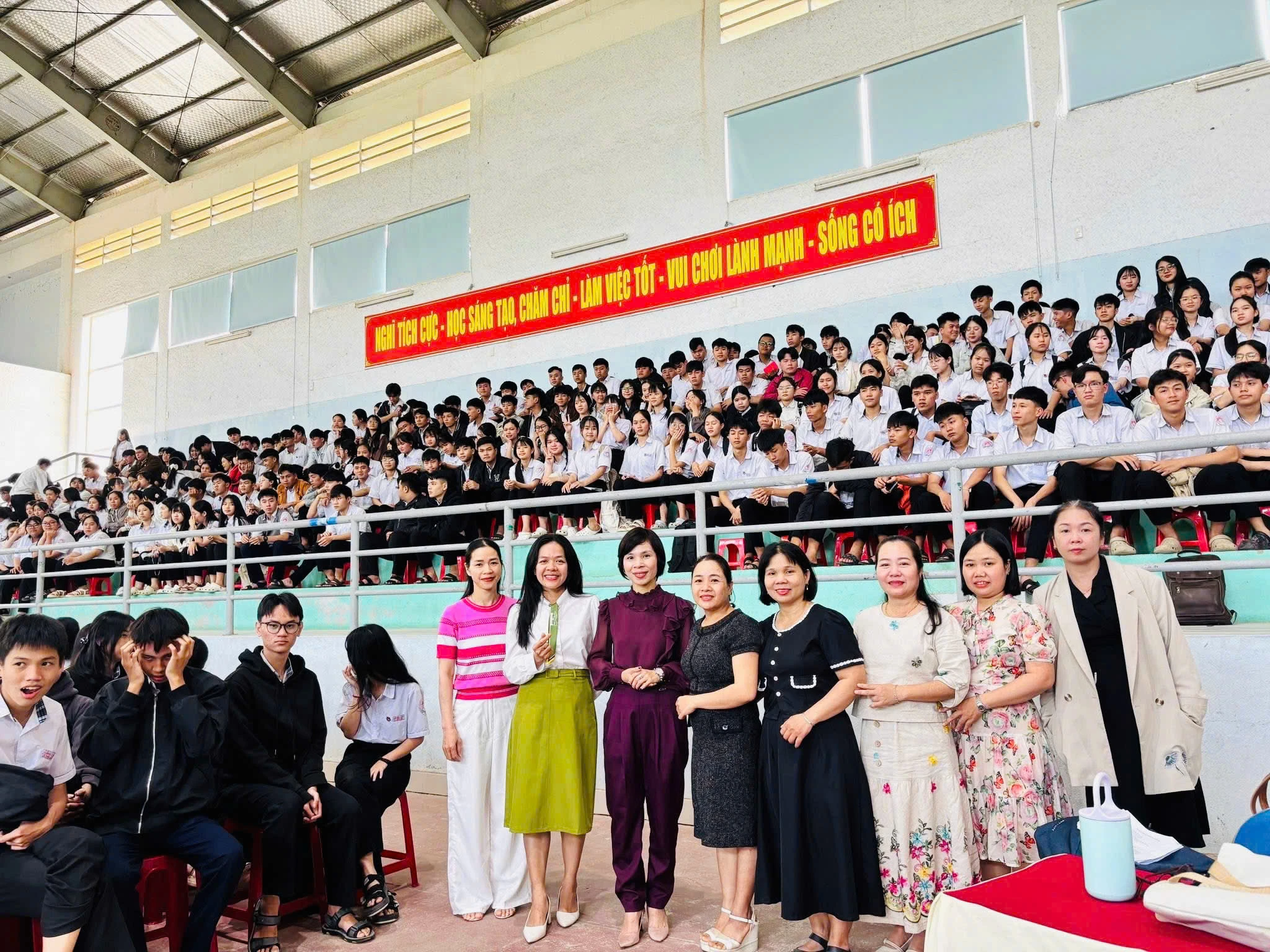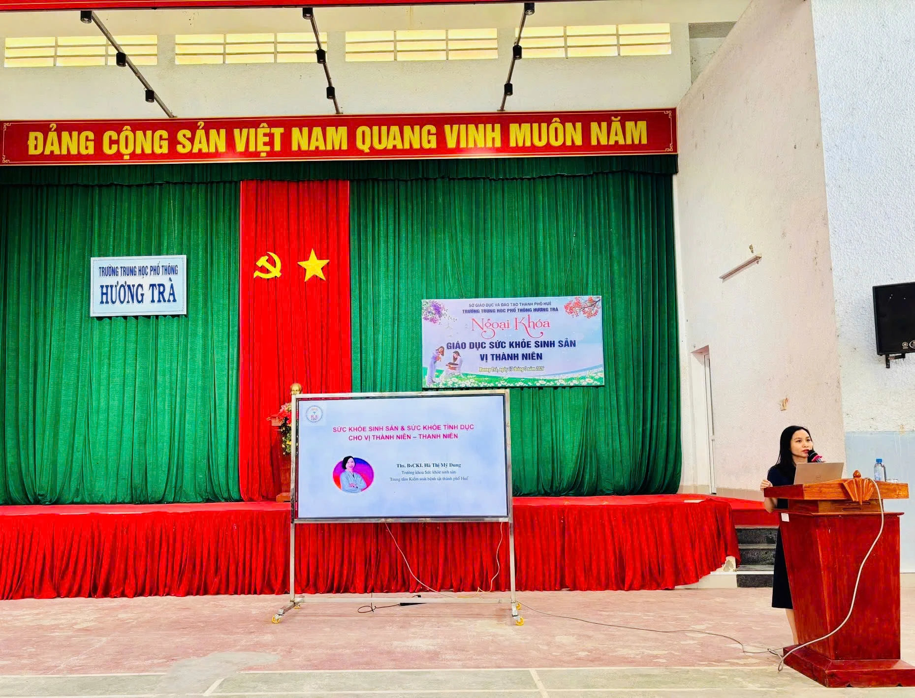 Thực hiện Giấy mời của Trường THPT Hương Trà, Khoa Sức khỏe sinh sản - Trung tâm Kiểm soát bệnh tật thành phố Huế và trường THPT Hương Trà phối hợp tổ chức buổi truyền thông giáo dục sức khỏe sinh sản (SKSS), sức khỏe tình dục (SKTD) cho học sinh tại Nhà đa năng của trường.