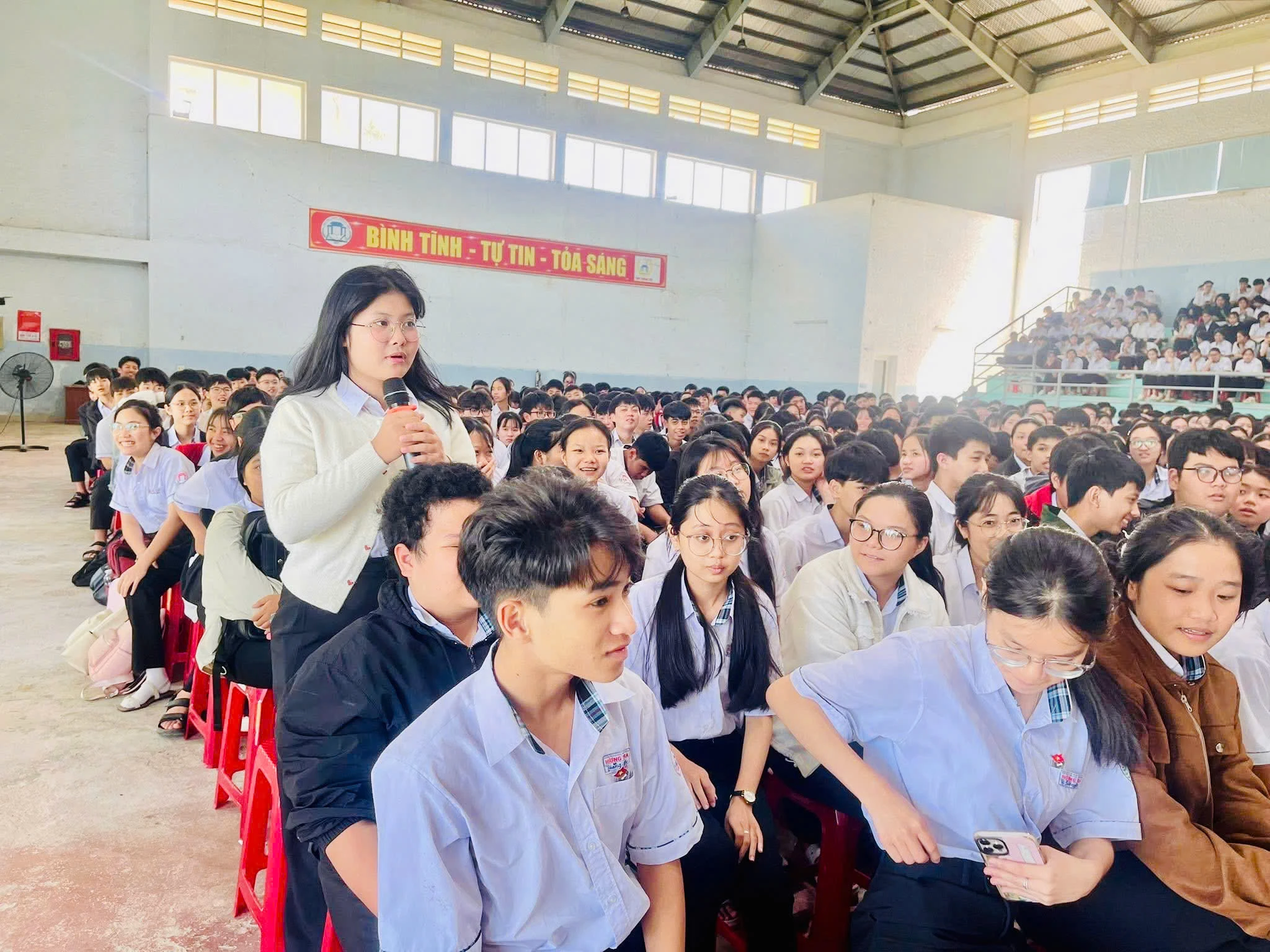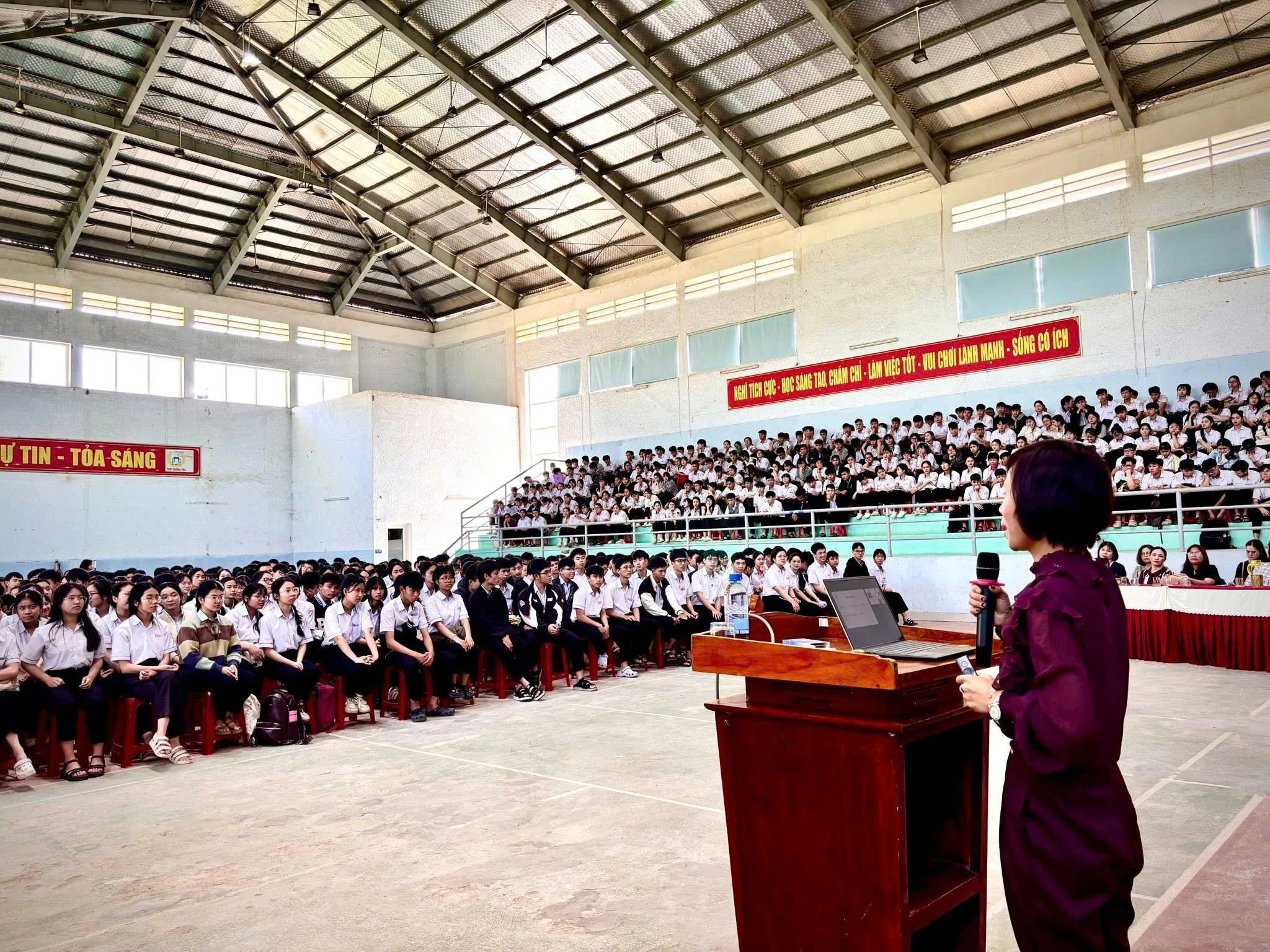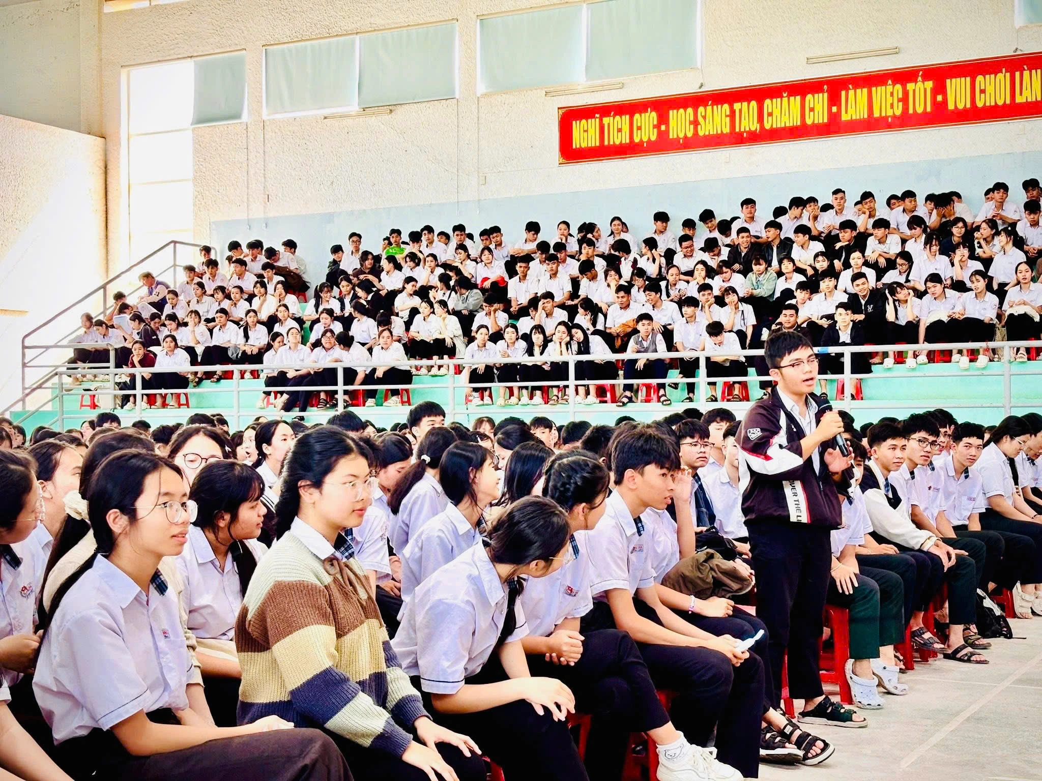 Buổi truyền thông được tổ chức với hình thức trao đổi trực tiếp, kết hợp hỏi - đáp, thảo luận, tạo không khí cởi mở, giúp học sinh dễ dàng tiếp cận và tiếp thu nội dung.