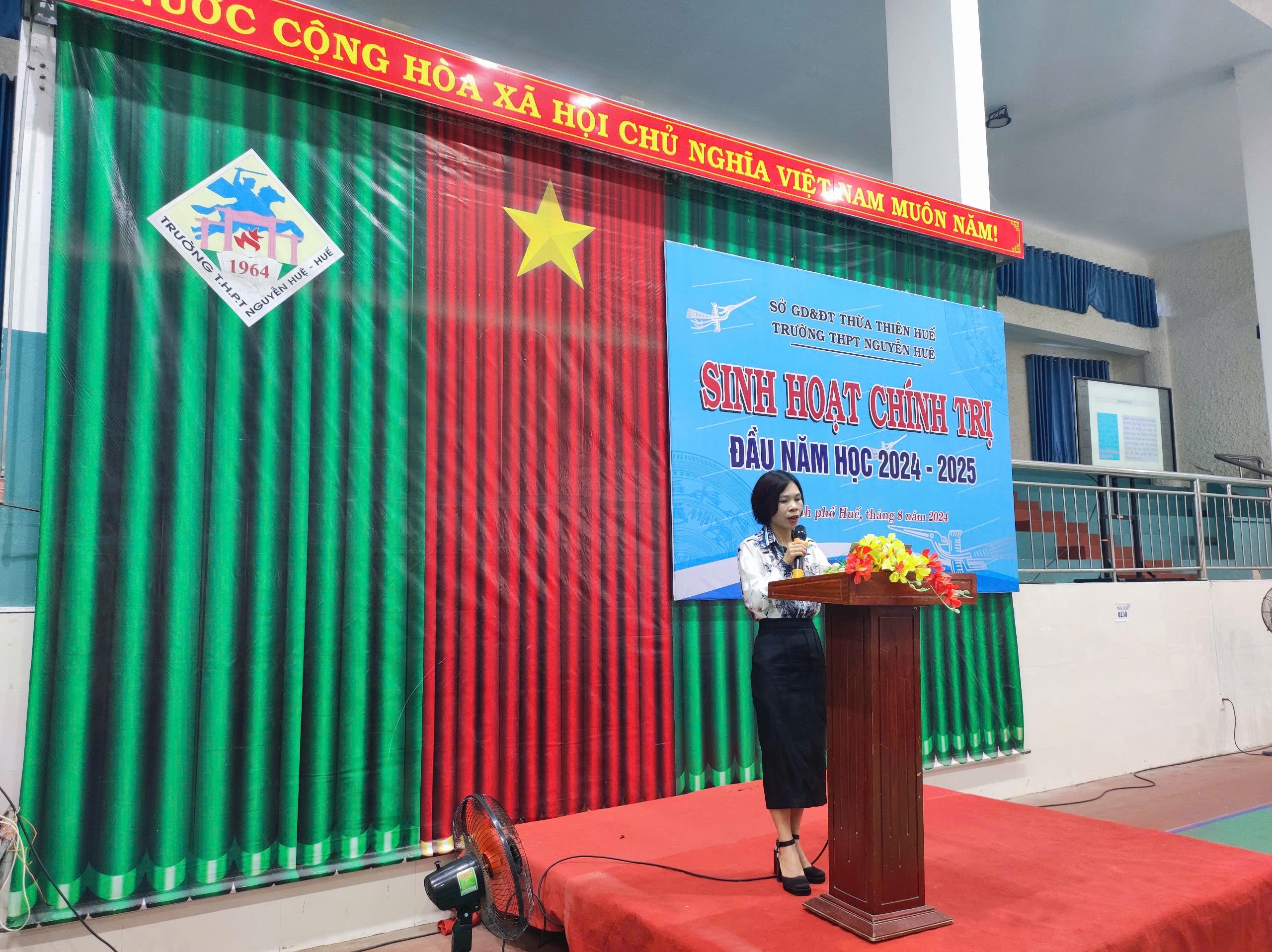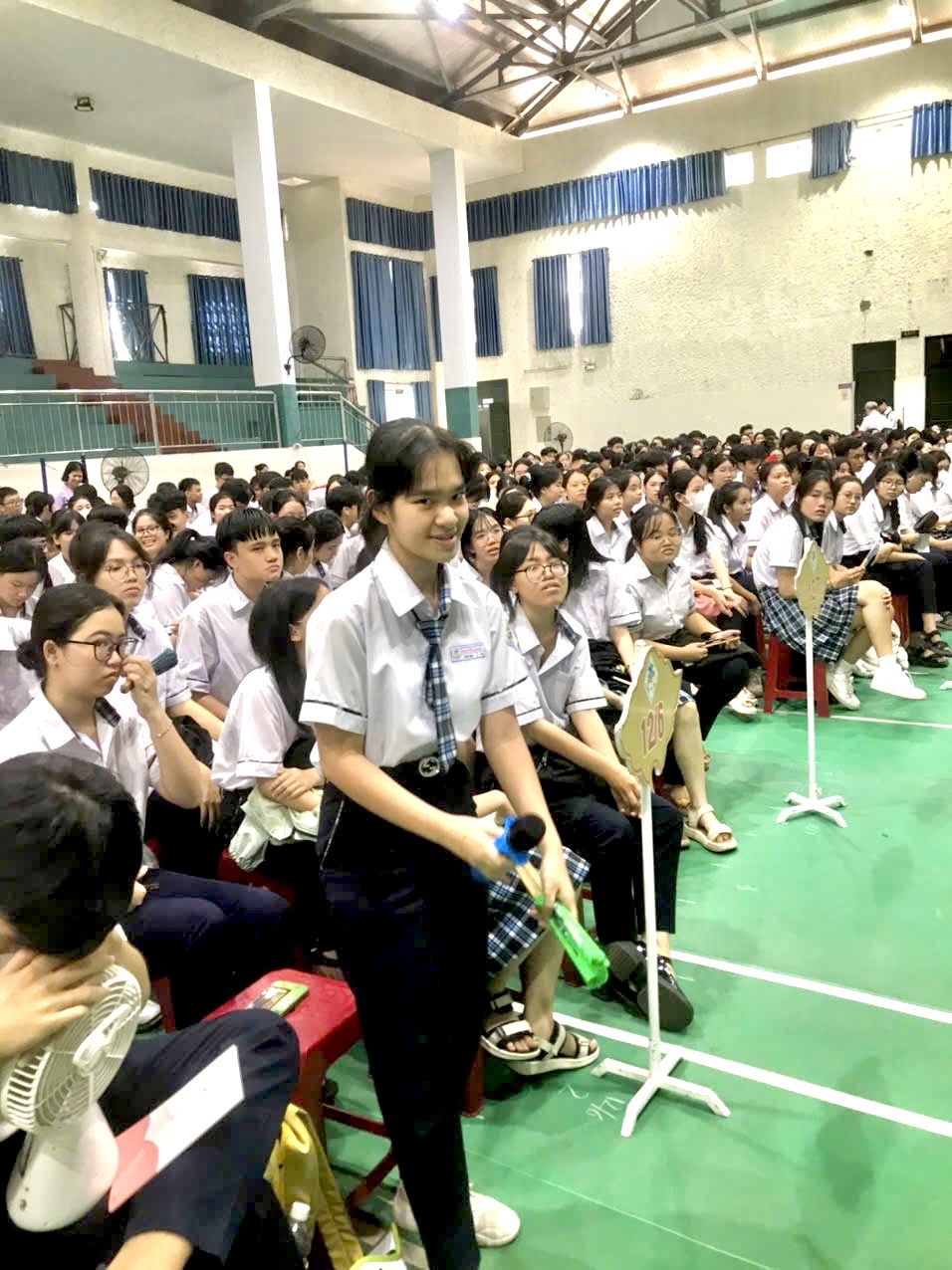 Tham dự buổi truyền thông có các Thầy cô trong Ban giám hiệu nhà trường, giáo viên và hơn 600 em học sinh Khối 12 của Trường THPT Nguyễn Huệ.