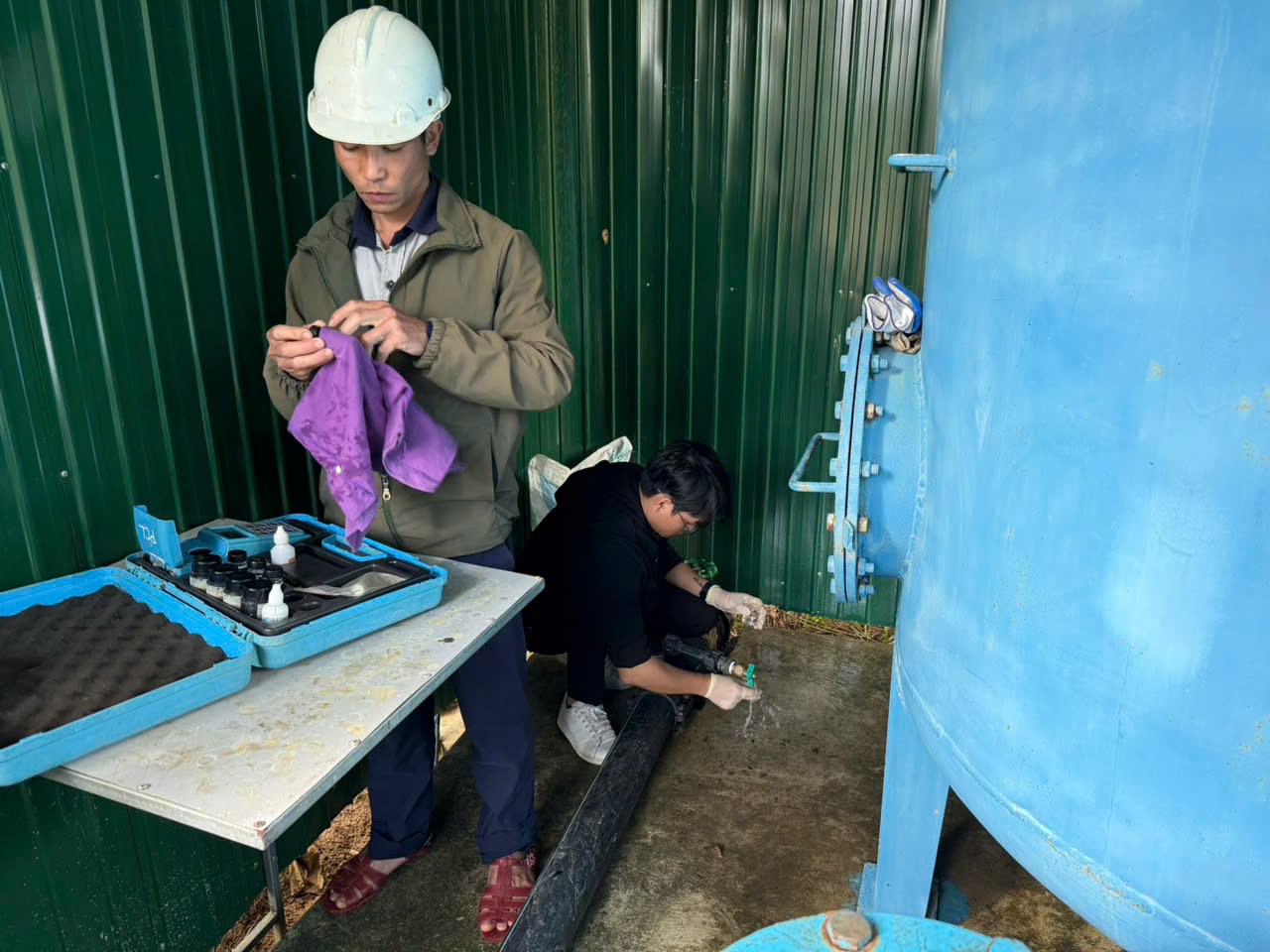 Cán bộ công ty TSL cùng với cán bộ công ty cổ phần cấp nước đo độ đục tại hiện trường