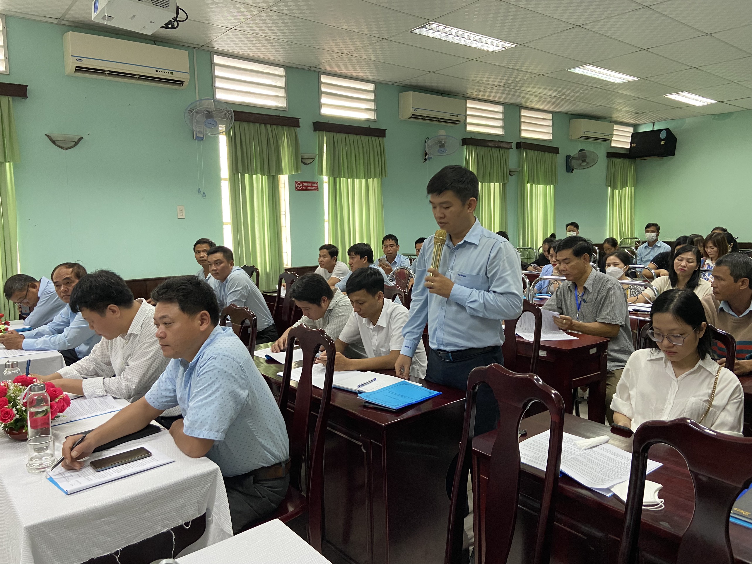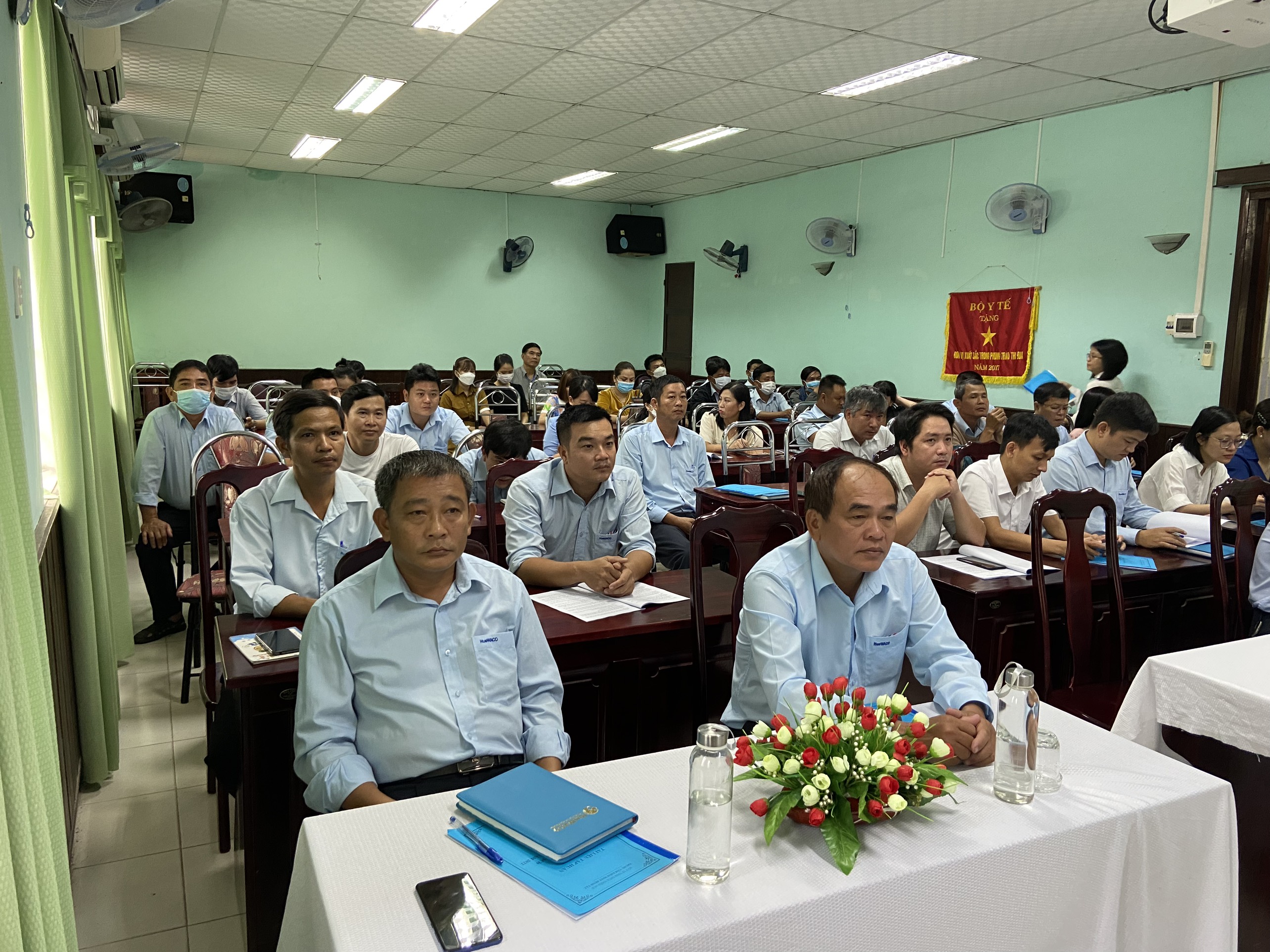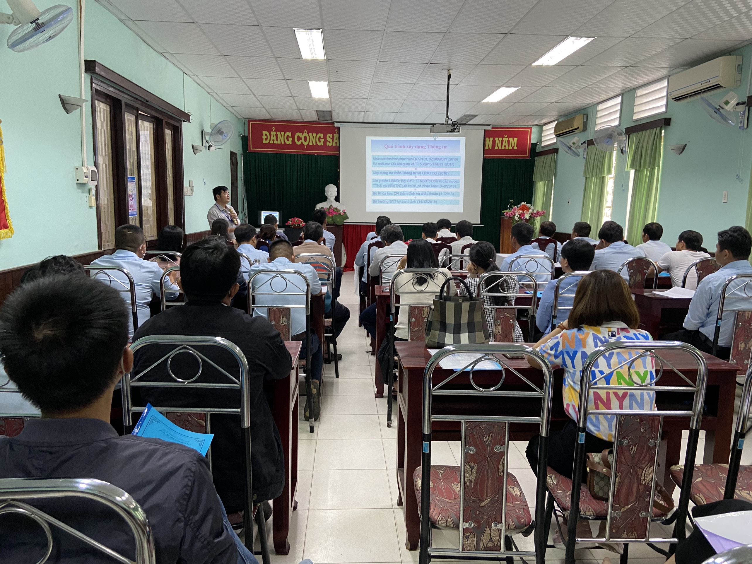 Nội dung buổi tập huấn: Trình bày Thông tư số 41/2018/TT-BYT ngày 14/12/1018 của Bộ Y tế về việc ban hành Quy chuẩn kỹ thuật Quốc gia và quy định kiểm tra, giám sát chất lượng nước sạch sử dụng cho mục đích sinh hoạt; QCĐP về chất lượng nước sạch sử dụng cho mục đích sinh hoạt trên địa bàn tỉnh Thừa Thiên Huế; Thông tư 26/TT-BYT ngày 15/12/2021 của Bộ Y tế và Quyết định 22/2021/QĐ-UBND ngày 31/8/2022 của Ủy ban nhân dân tỉnh Thừa Thiên Huế ban hành Quy chuẩn kỹ thuật địa phương về chất lượng nước sạch trên địa bàn tỉnh Thừa Thiên Huế - QCĐP 01:2022-Tt-H.