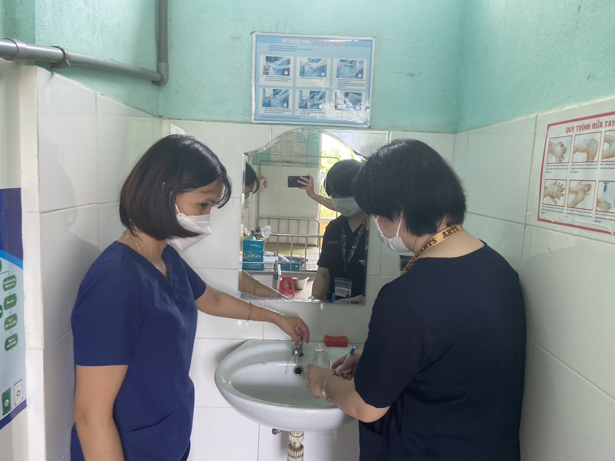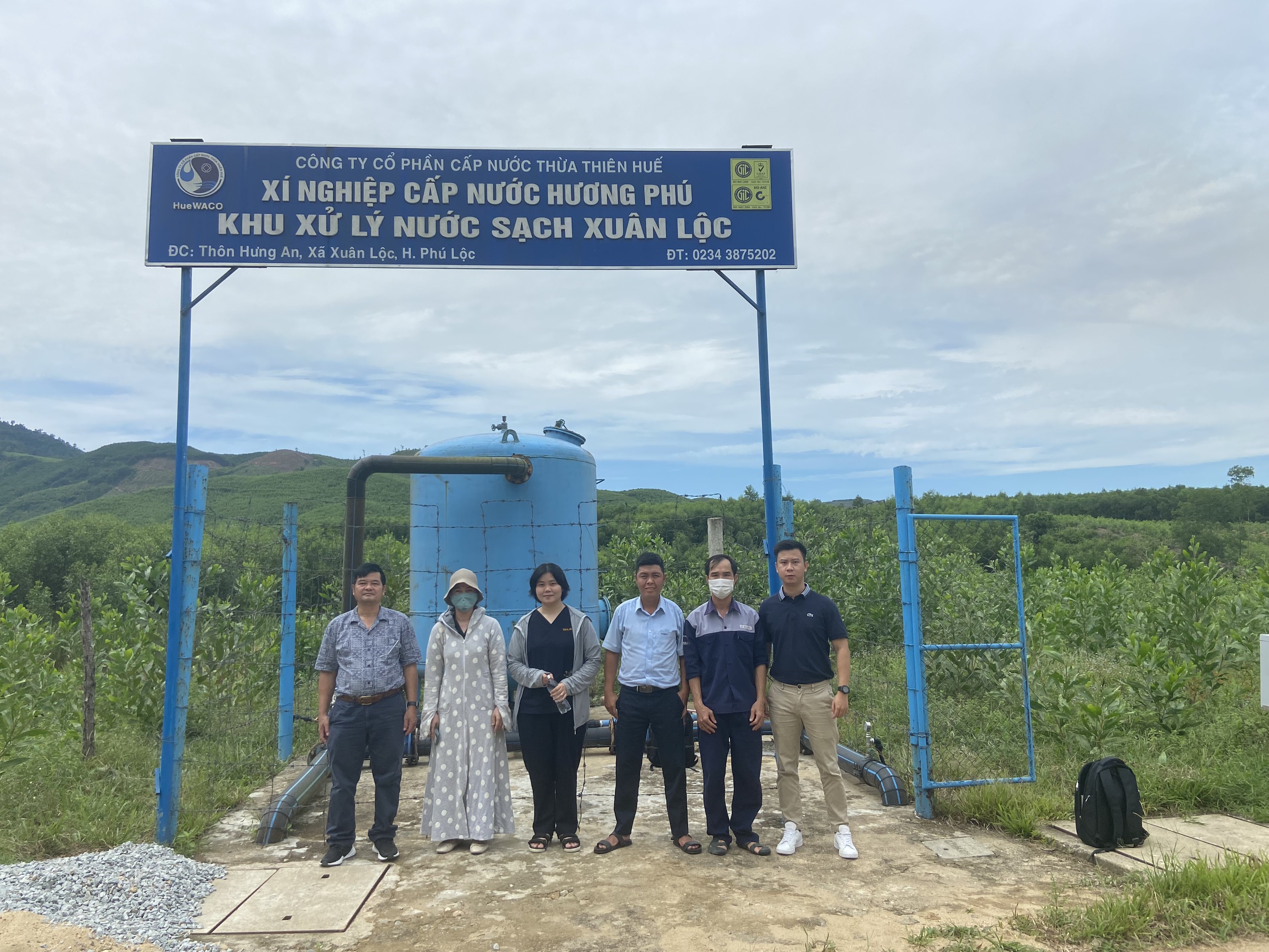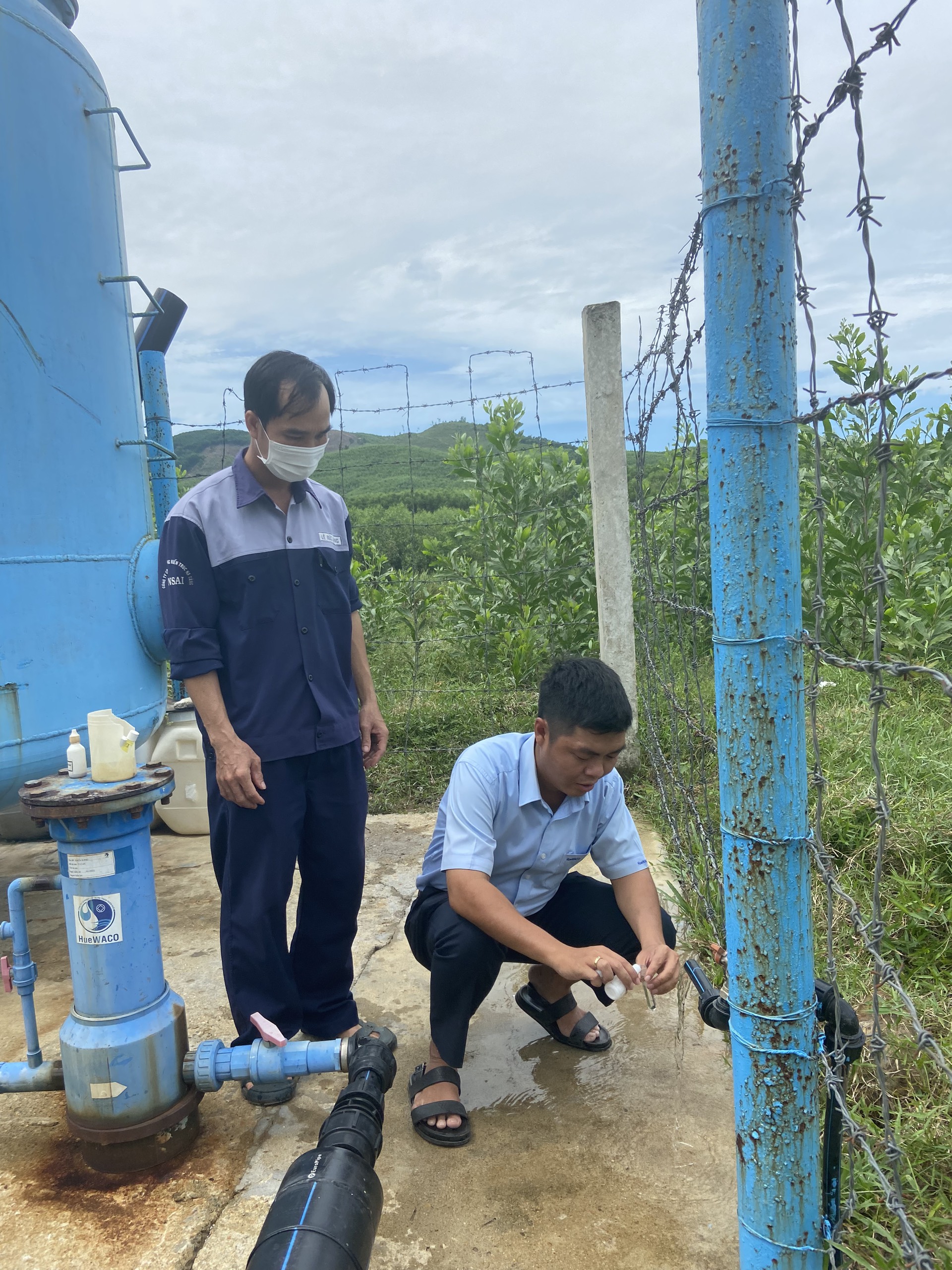 Cán bộ Khoa Xét nghiệm và cán bộ HueWACO lấy mẫu tại khu xử lý nước sạch Xuân Lộc.