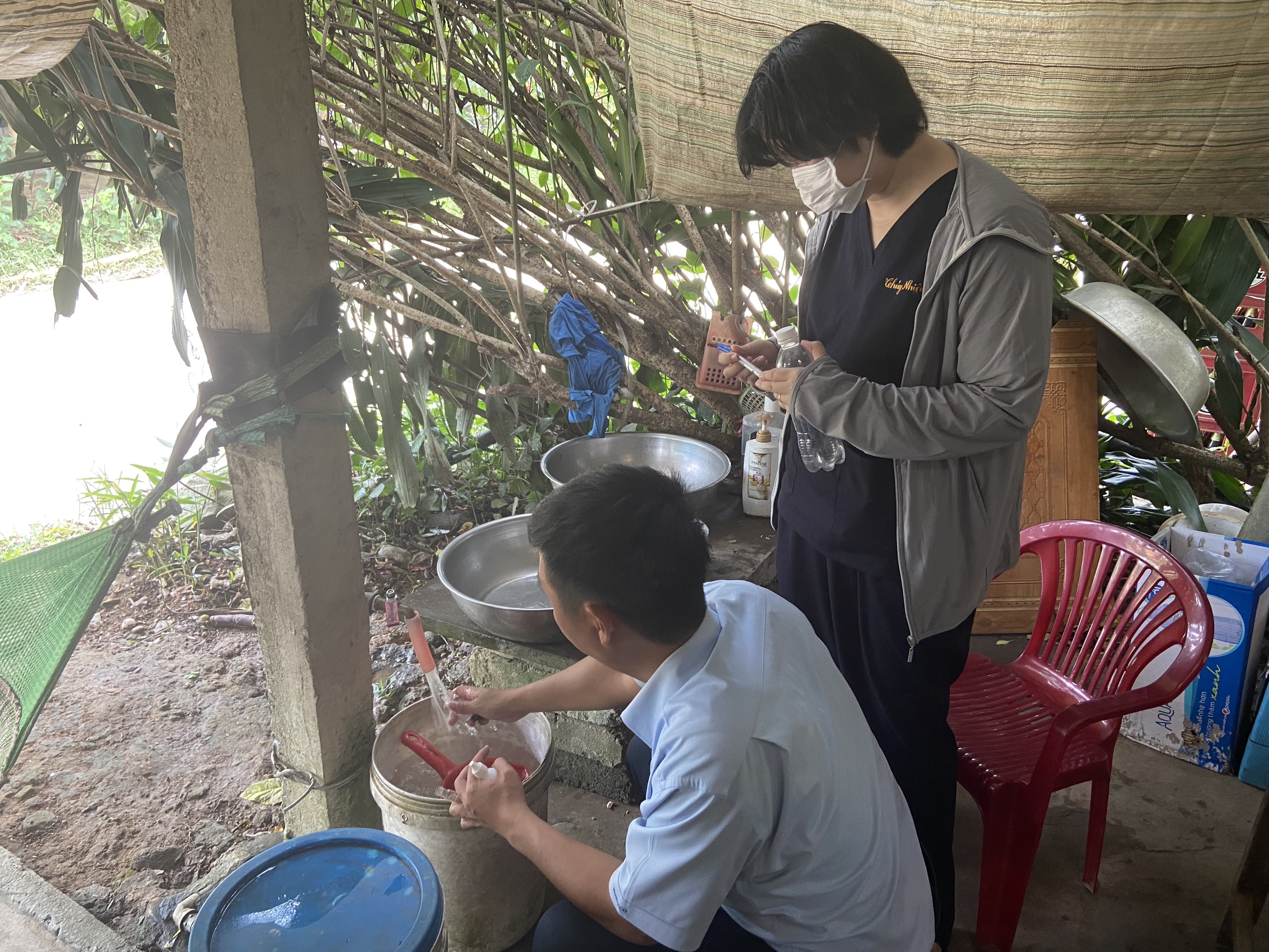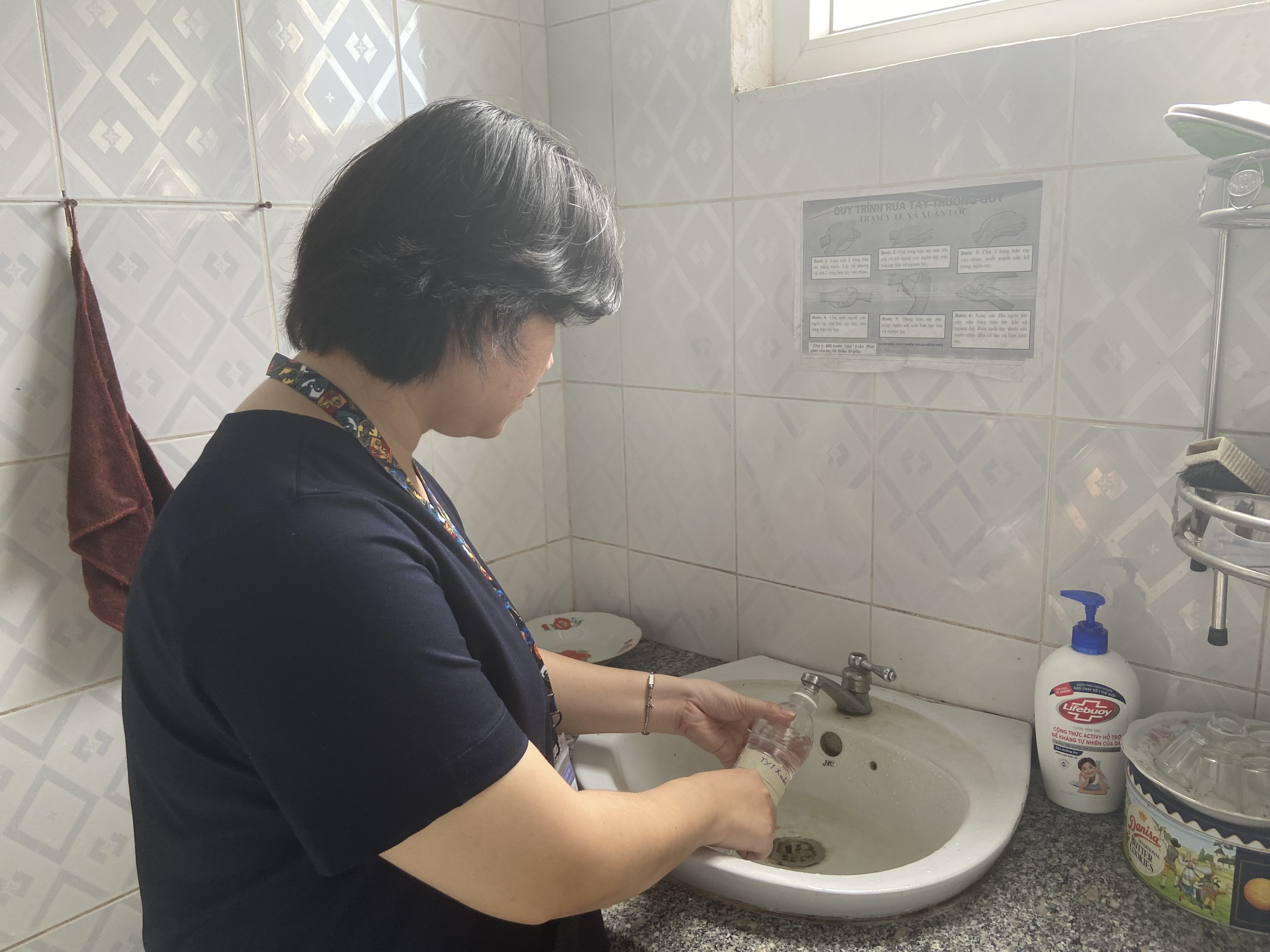 Cán bộ Khoa Xét nghiệm và cán bộ HueWACO lấy mẫu tại hộ Bà Hoàng Thị Hiến.