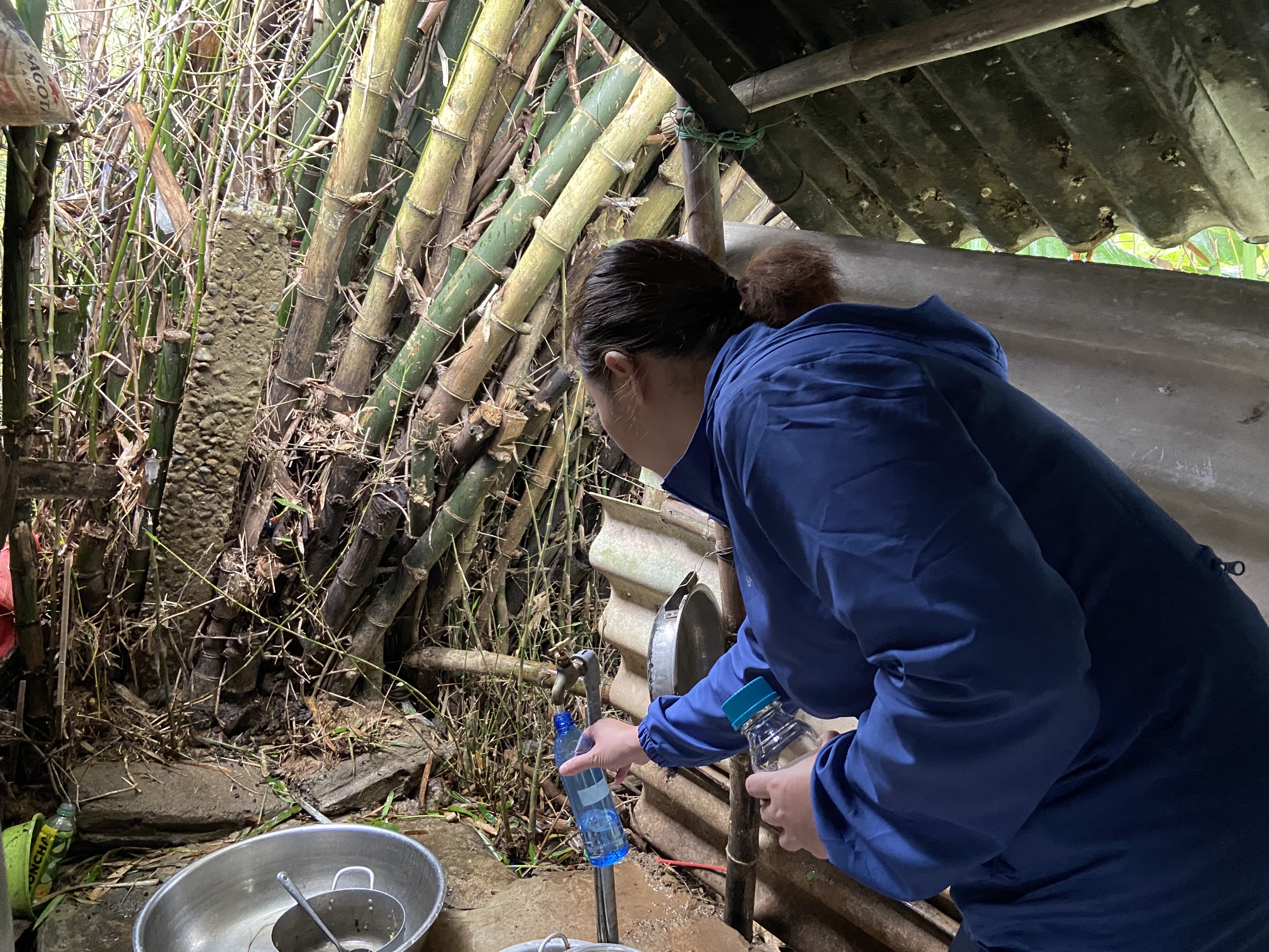 Cán bộ HueWACO lấy mẫu tại hộ bà Trương Thị Huệ, thôn Nam Phước, xã Lộc An, huyện Phú Lộc