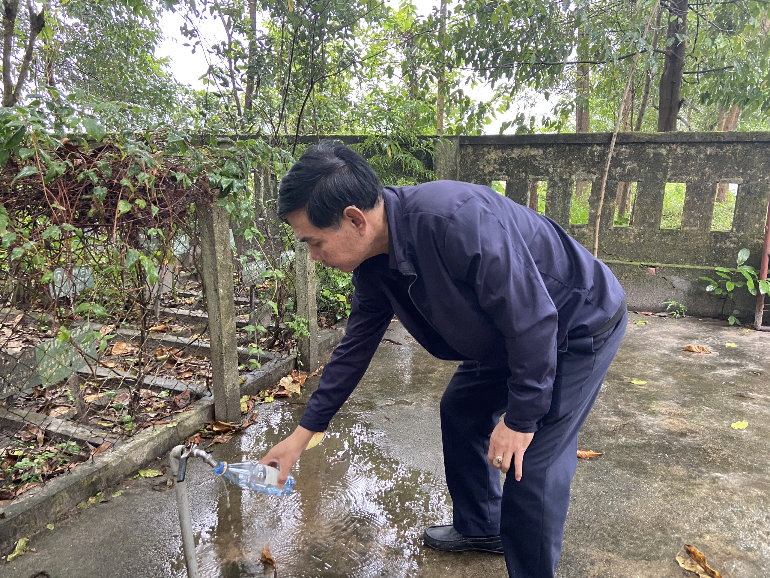 Cán bộ Khoa Xét nghiệm đo Clo dư hiện trường tại hộ bà Trương Thị Huệ, thôn Nam Phước, xã Lộc An, huyện Phú Lộc
