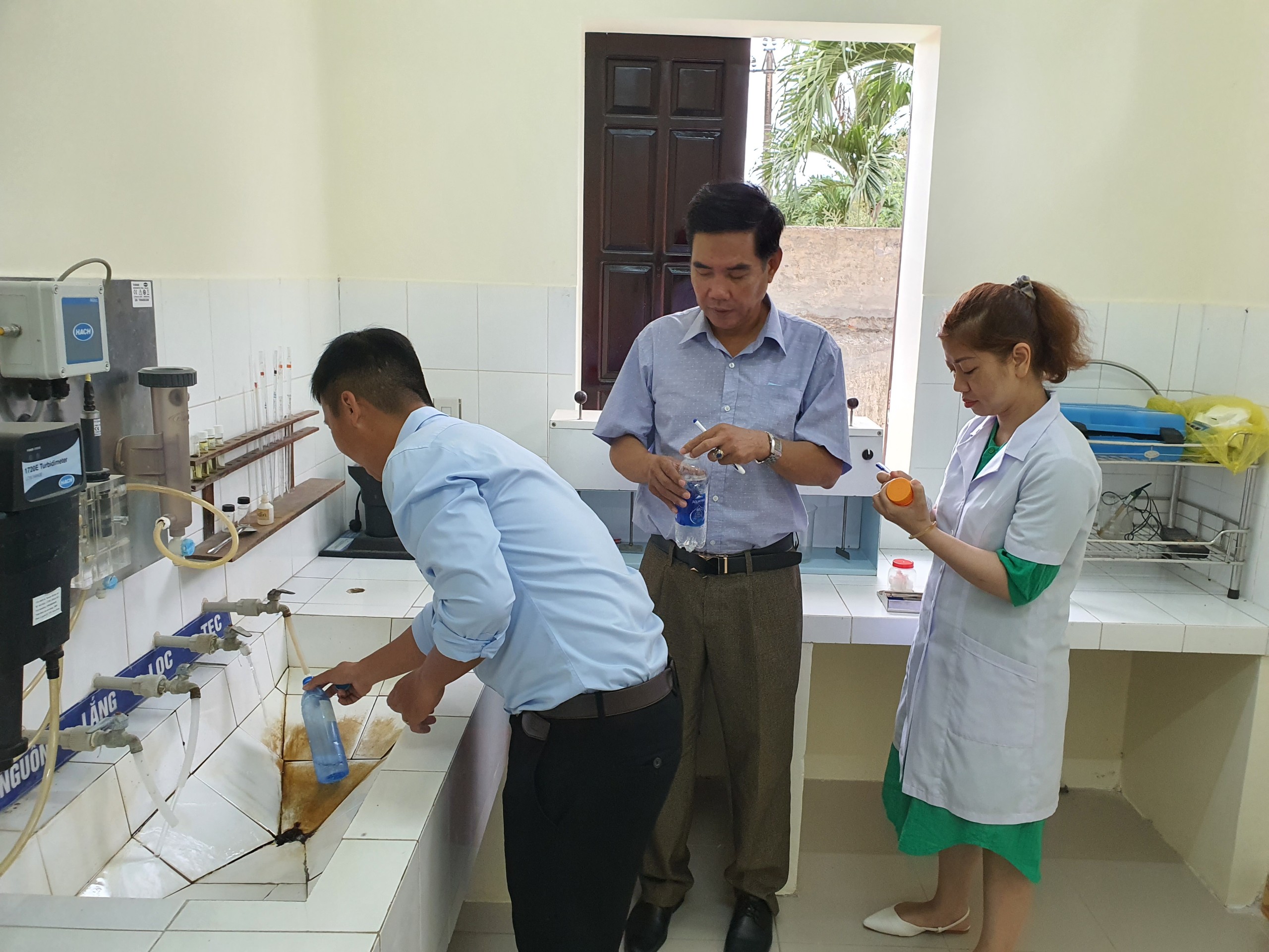 Cán bộ Khoa Xét nghiệm và Cán bộ HueWACO lấy mẫu tại Nhà máy nước Nam Đông