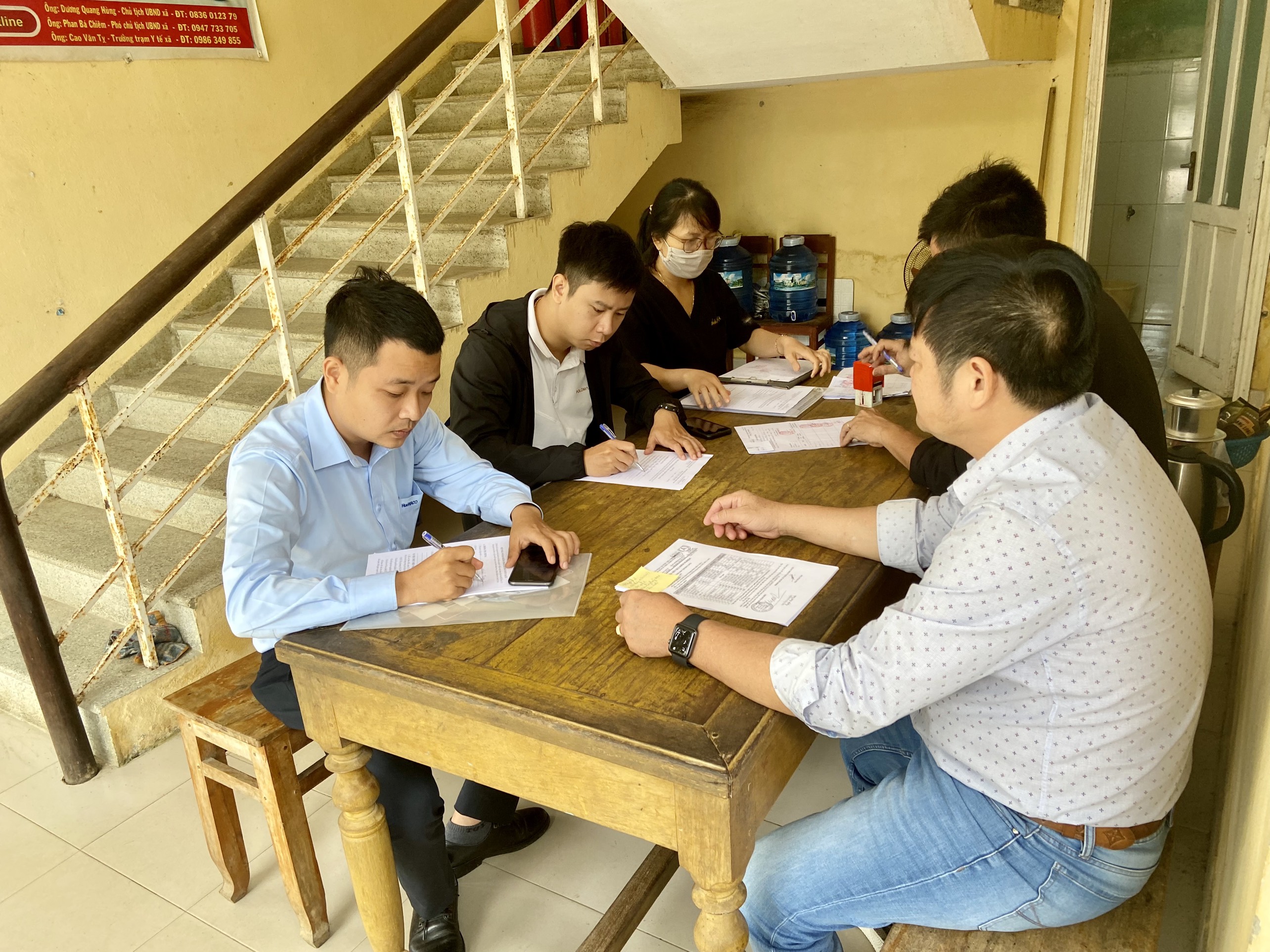 Cán bộ Khoa Xét nghiệm và cán bộ HueWACO lấy mẫu tại Trạm Y tế Thượng Long