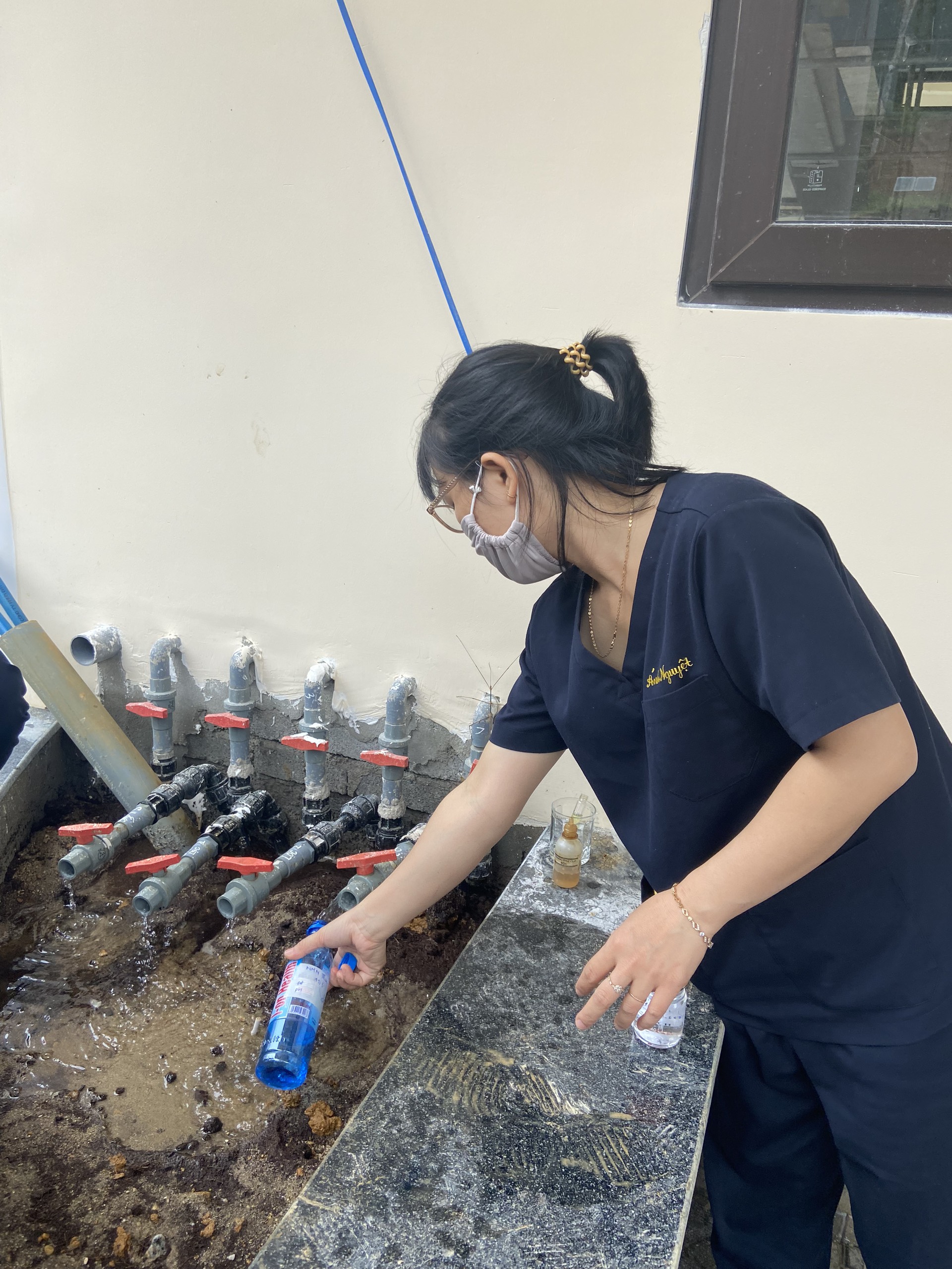 Cán bộ Khoa Xét nghiệm lấy mẫu tại Nhà máy nước Thượng Long, huyện Nam Đông
