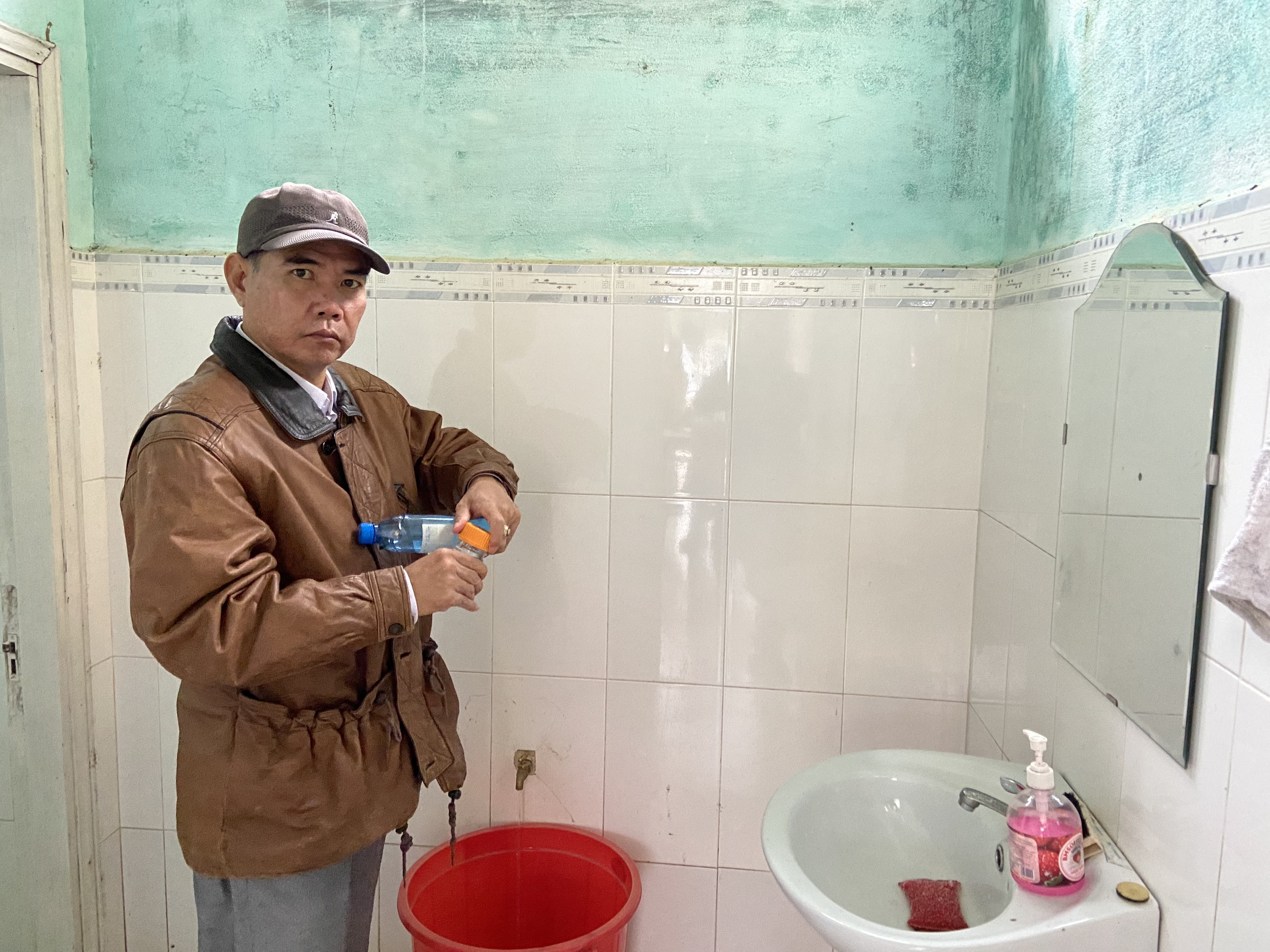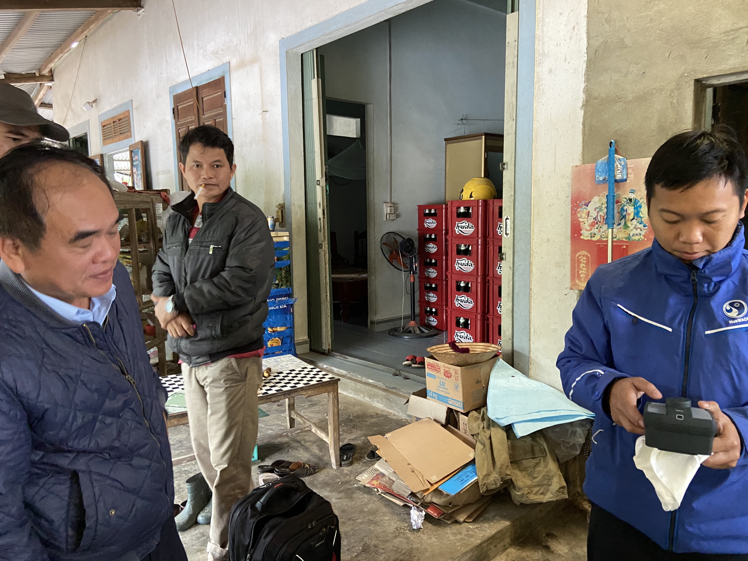 Cán bộ HueWACO tiến hành đo độ đục mẫu nước tại hộ gia đình Ông Trần Đình Nhự, thôn Hưng Lộc, xã Xuân Lộc