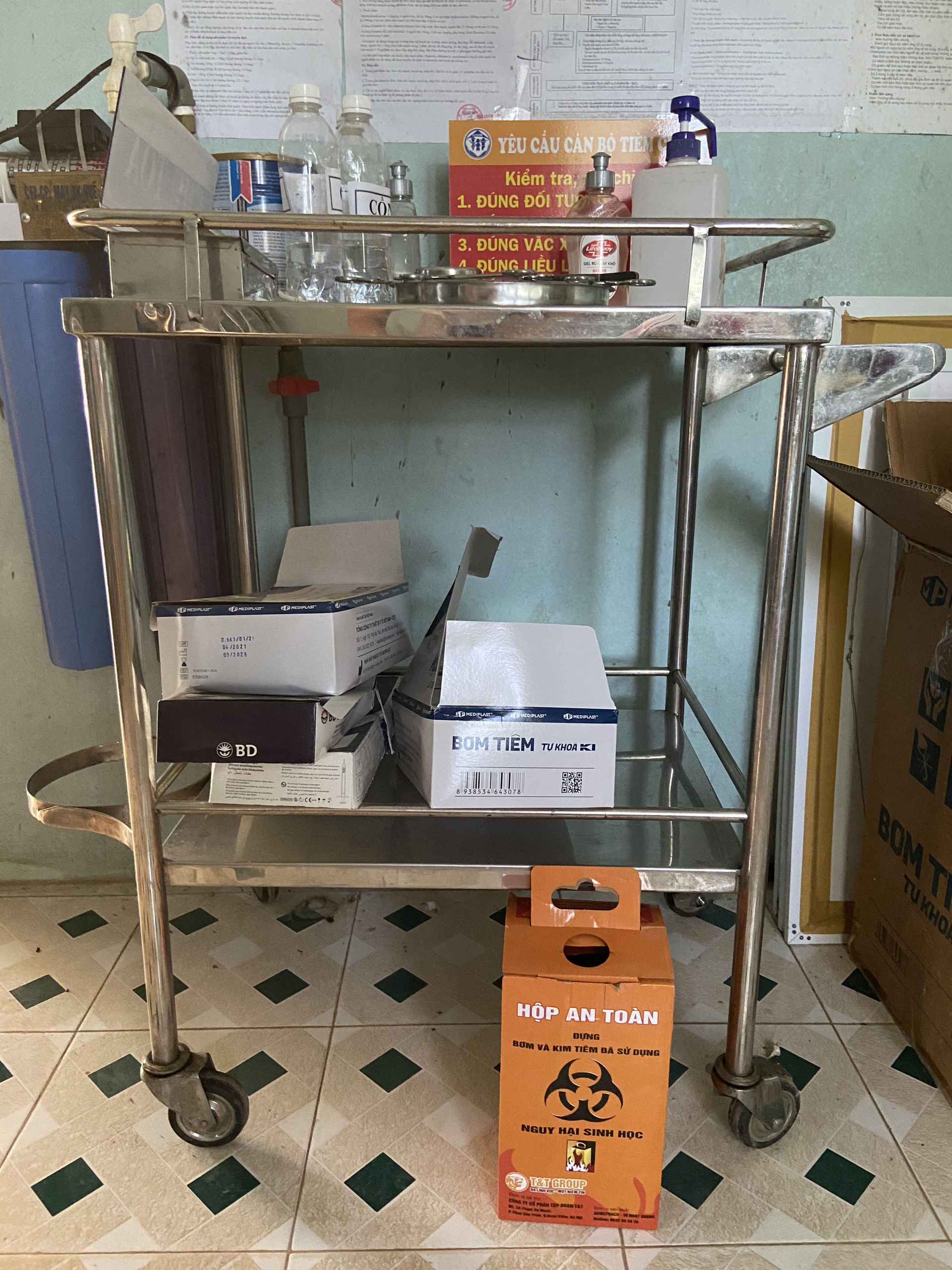 Qua kiểm tra, đoàn kiến nghị Trạm Y tế bố trí khu vực lưu giữ chất thải y tế, biển cảnh báo theo định, trang bị đầy đủ thùng chưa chất thải y tế. Thực hiện công tác quản lý chất thải y tế theo Thông tư 20/2021/TT-BYT ngày 26/11/2021.