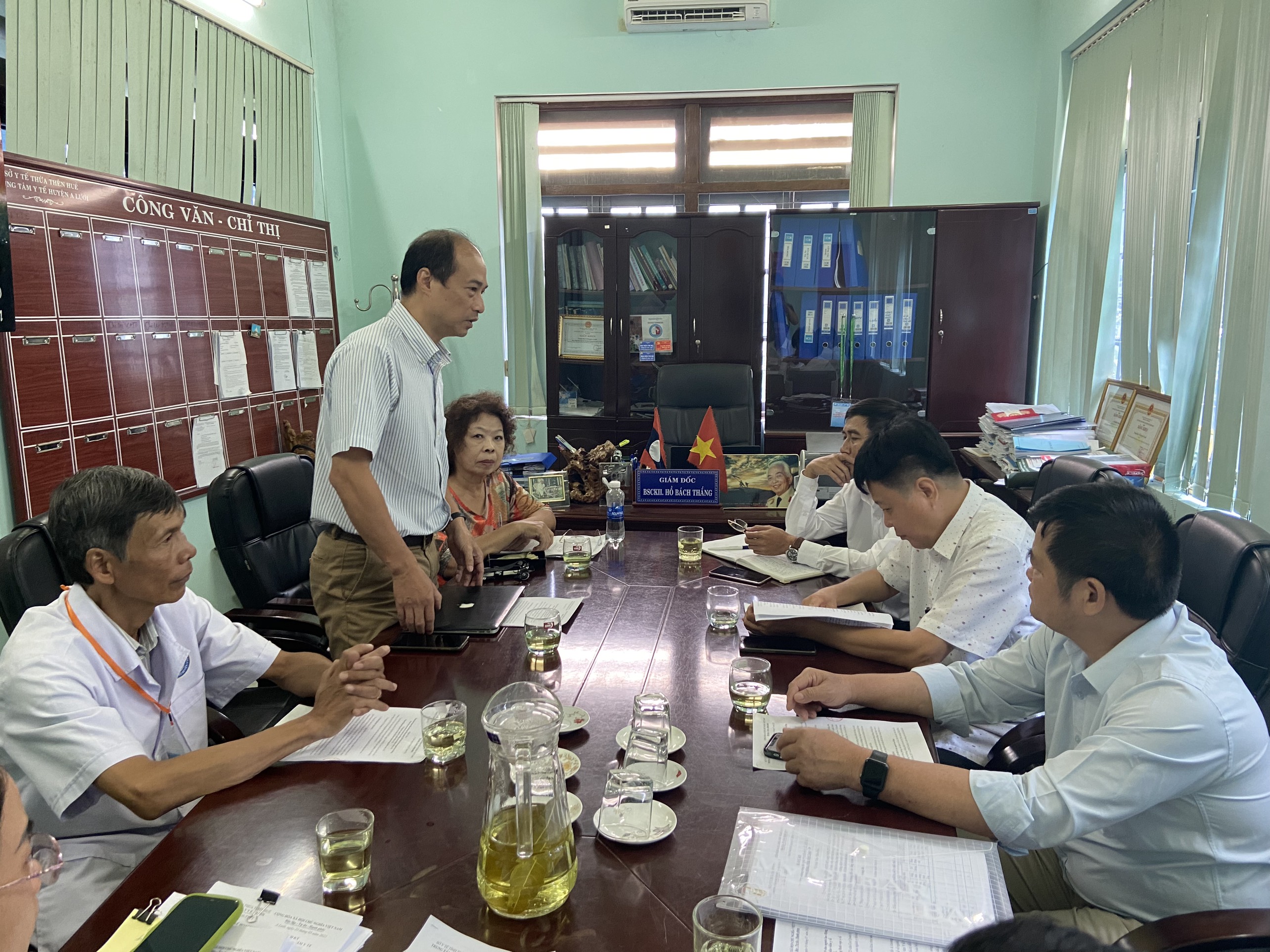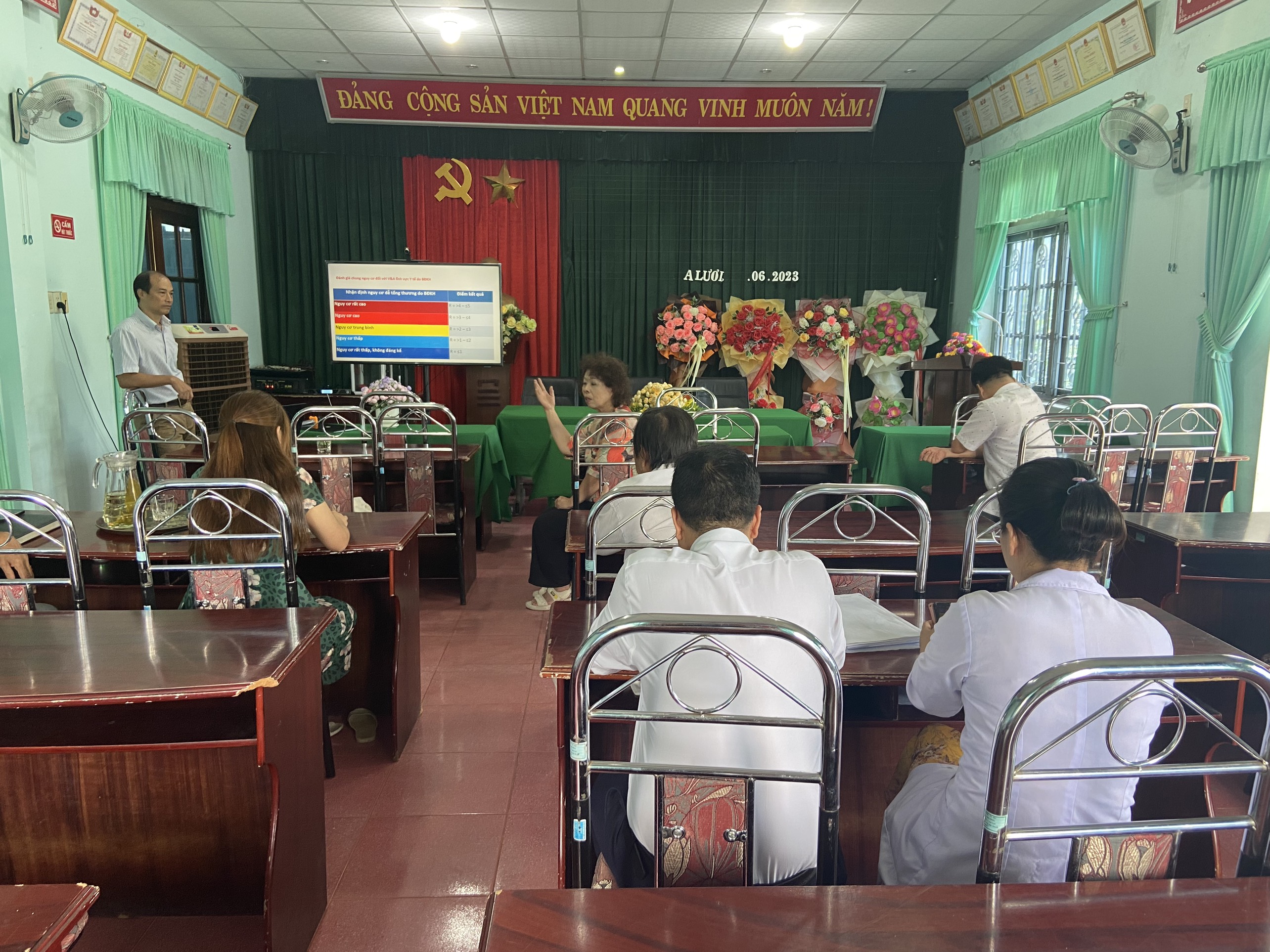 Thực hiện Công văn số 302/MT-SKHC ngày 14/6/2023 của Cục Quản lý Môi trường y tế về thực hiện kế hoạch ứng phó với BĐKH của ngành y tế và đánh giá công tác ATVSLĐ trong phòng chống dịch COVID-19. Ngày 03/7/2023, Trung tâm Kiểm soát bệnh tật tỉnh phối hợp cùng đoàn cán bộ Cục Quản lý môi trường y tế thực hiện kế hoạch ứng phó với BĐKH của ngành y tế và đánh giá công tác ATVSLĐ trong phòng chống dịch Covid-19 tại Trung tâm y tế huyện A Lưới.