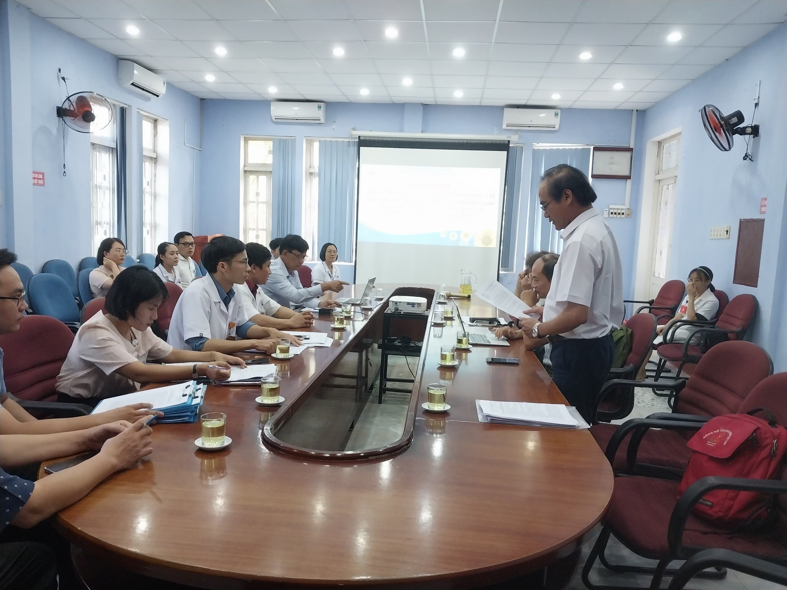 Tại buổi làm việc, BS. Trương Như Sơn - Giám đốc Trung tâm y tế huyện Phú Vang báo cáo thực hiện kế hoạch ứng phó với BĐKH của ngành y tế và đánh giá công tác ATVSLĐ trong phòng chống dịch Covid-19 của đơn vị.