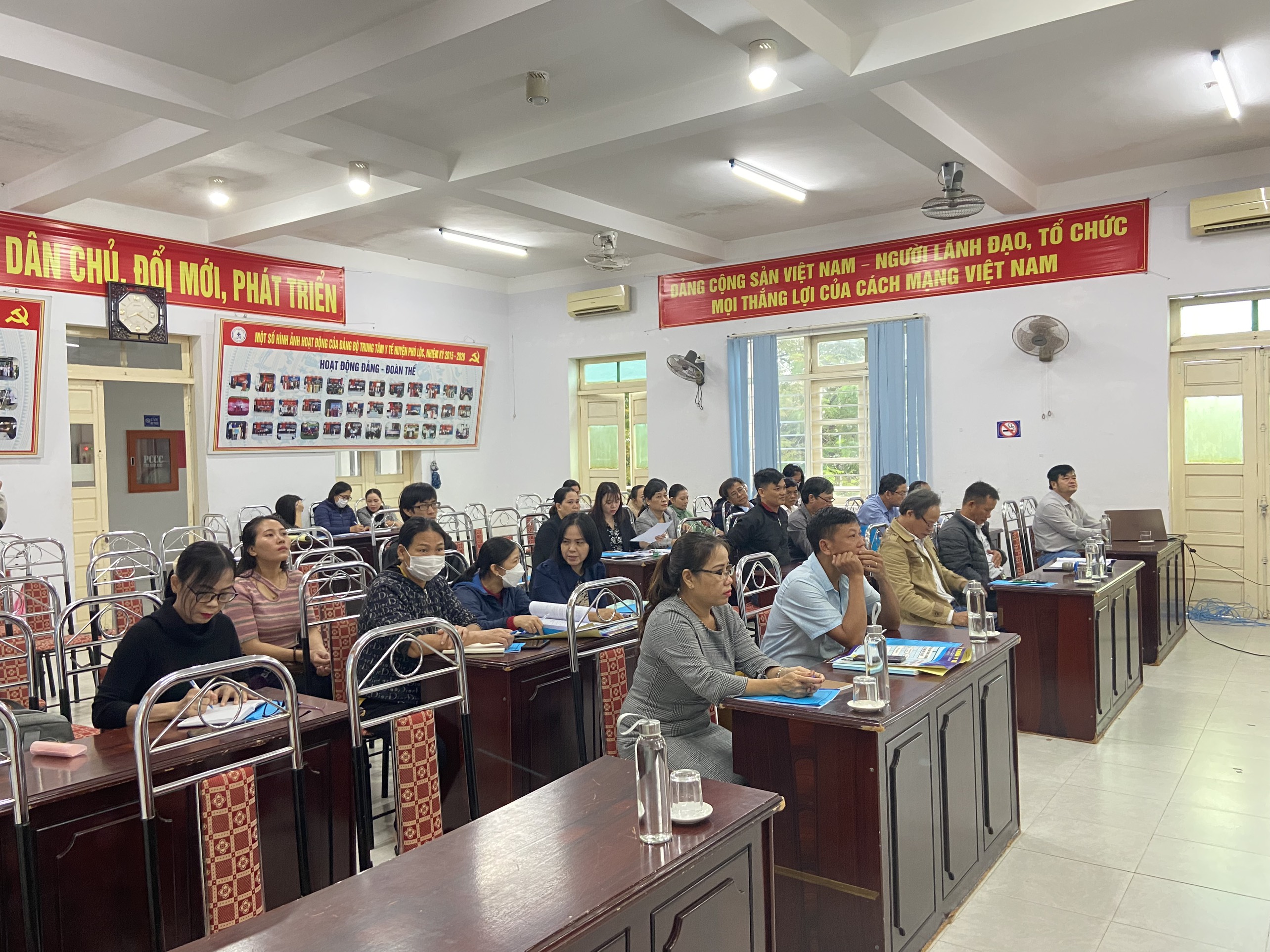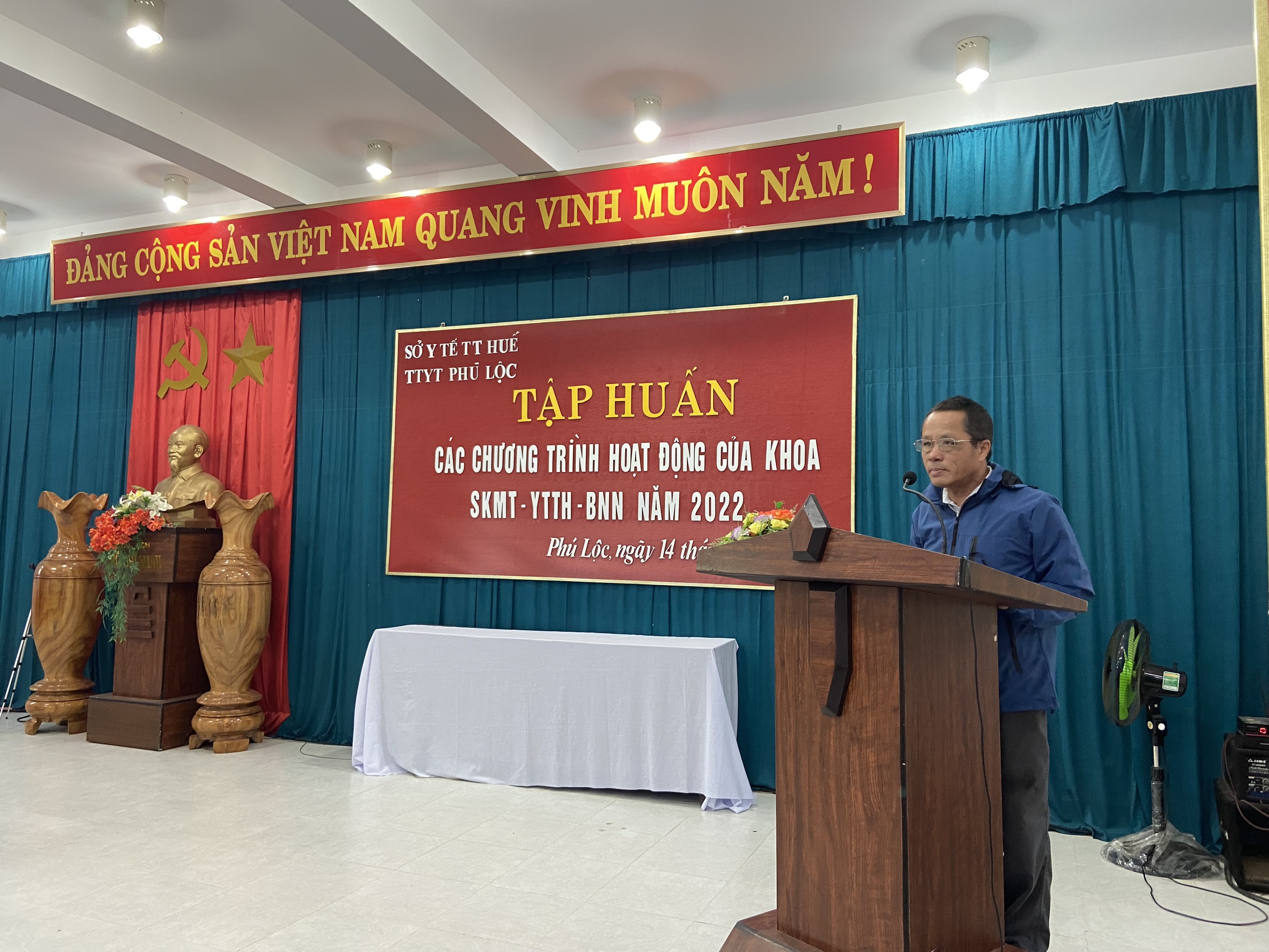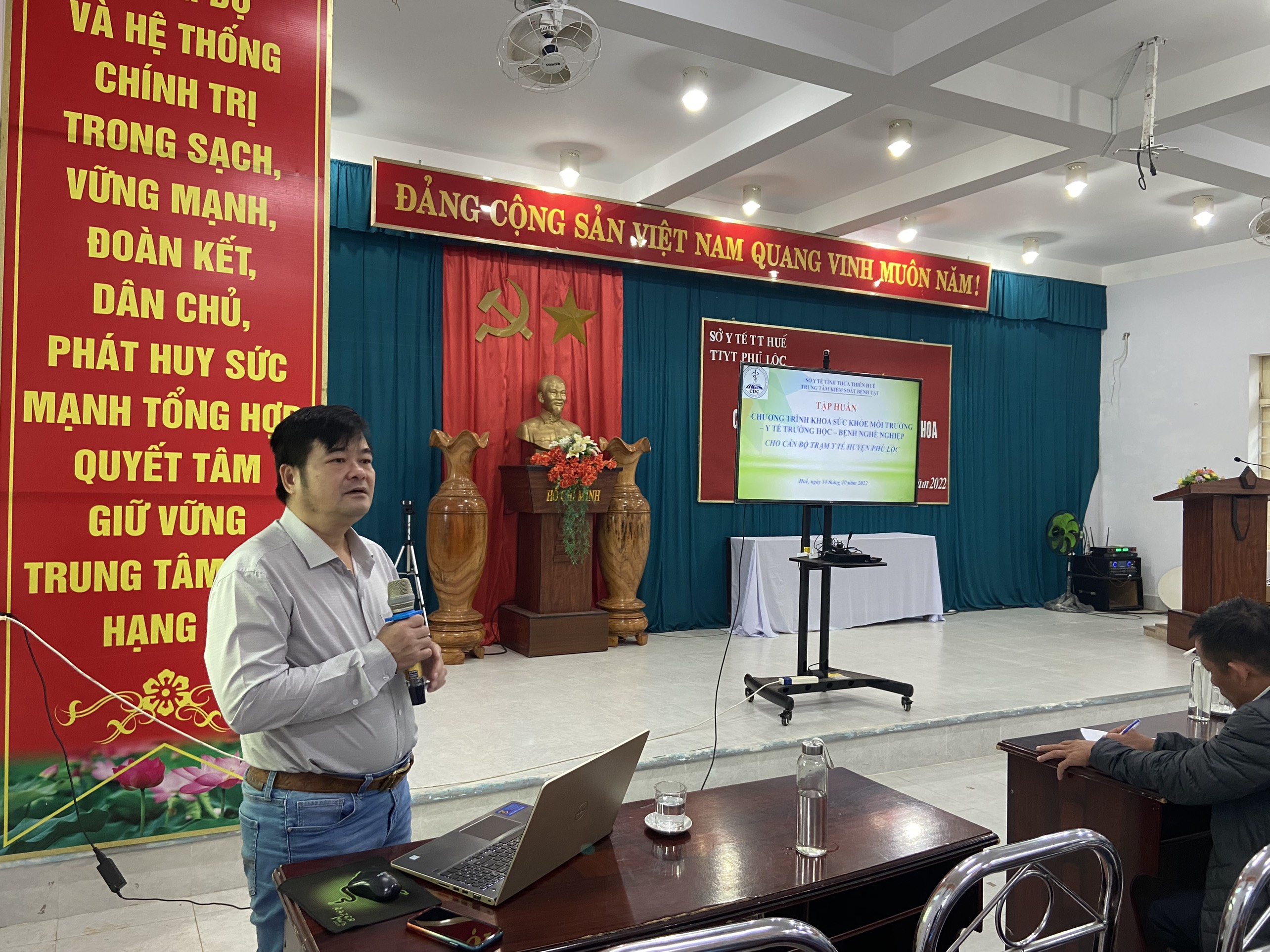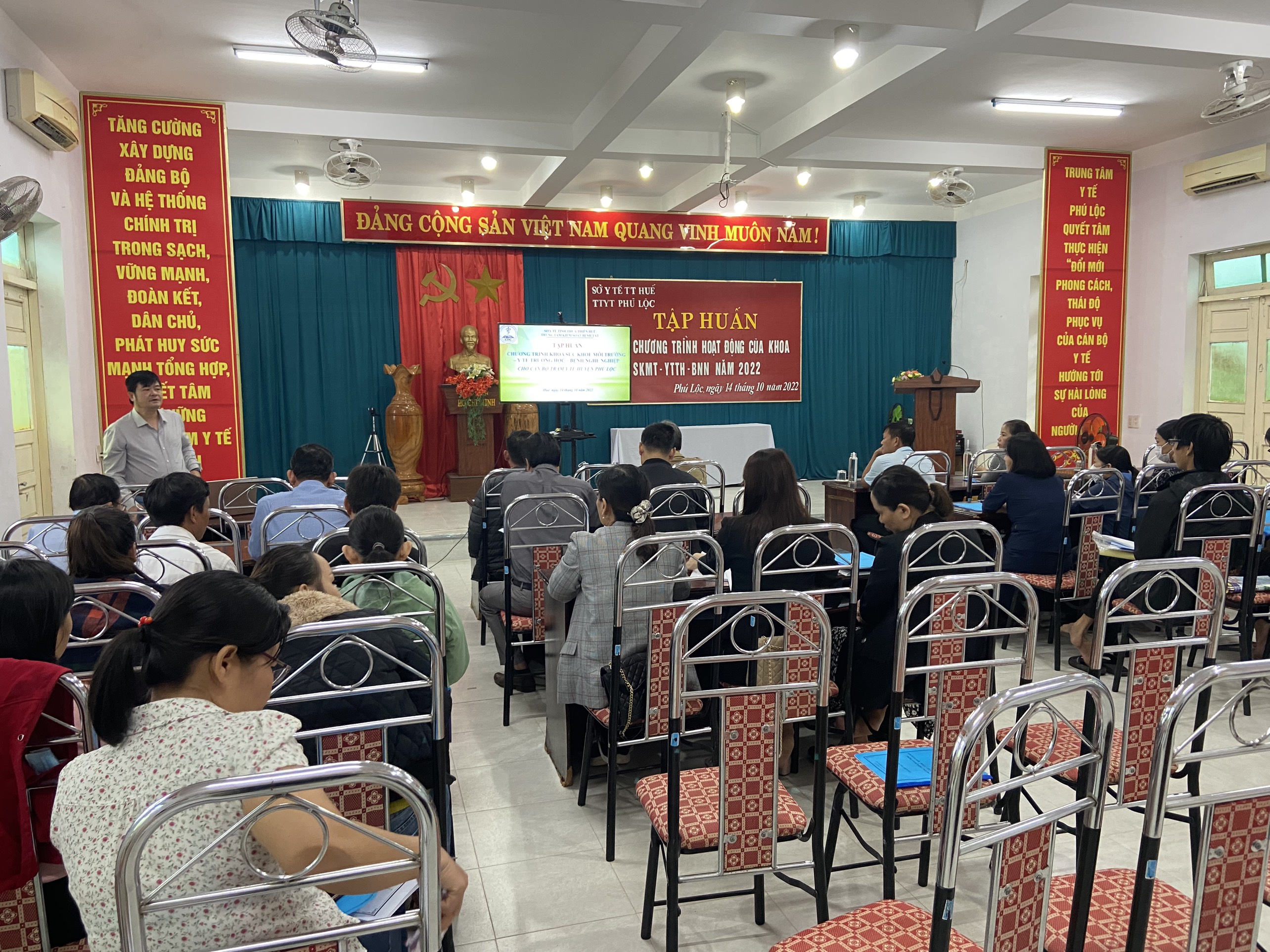 Thực hiện kế hoạch hoạt động năm 2022, ngày 14/10/2022, tại Hội trường TTYT huyện Phú Lộc, Khoa Sức khỏe môi trường - Y tế trường học - Bệnh nghề nghiệp, TTKSBT tỉnh phối hợp với TTYT huyện Phú Lộc tổ chức tập huấn các chương trình Vệ sinh môi trường, Y tế trường học, Quản lý chất thải y tế, Phòng chống thiên tai, Xử lý nước và vệ sinh môi trường trong mùa bão lụt cho cán bộ Trạm y tế. Tăng cường công tác giữ gìn vệ sinh môi trường, vệ sinh cá nhân phòng, chống dịch, tăng cường xử lý nước và vệ sinh môi trường trong mùa bão lụt.