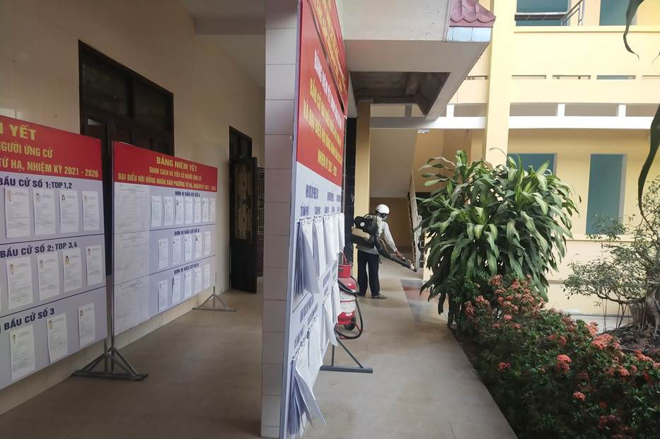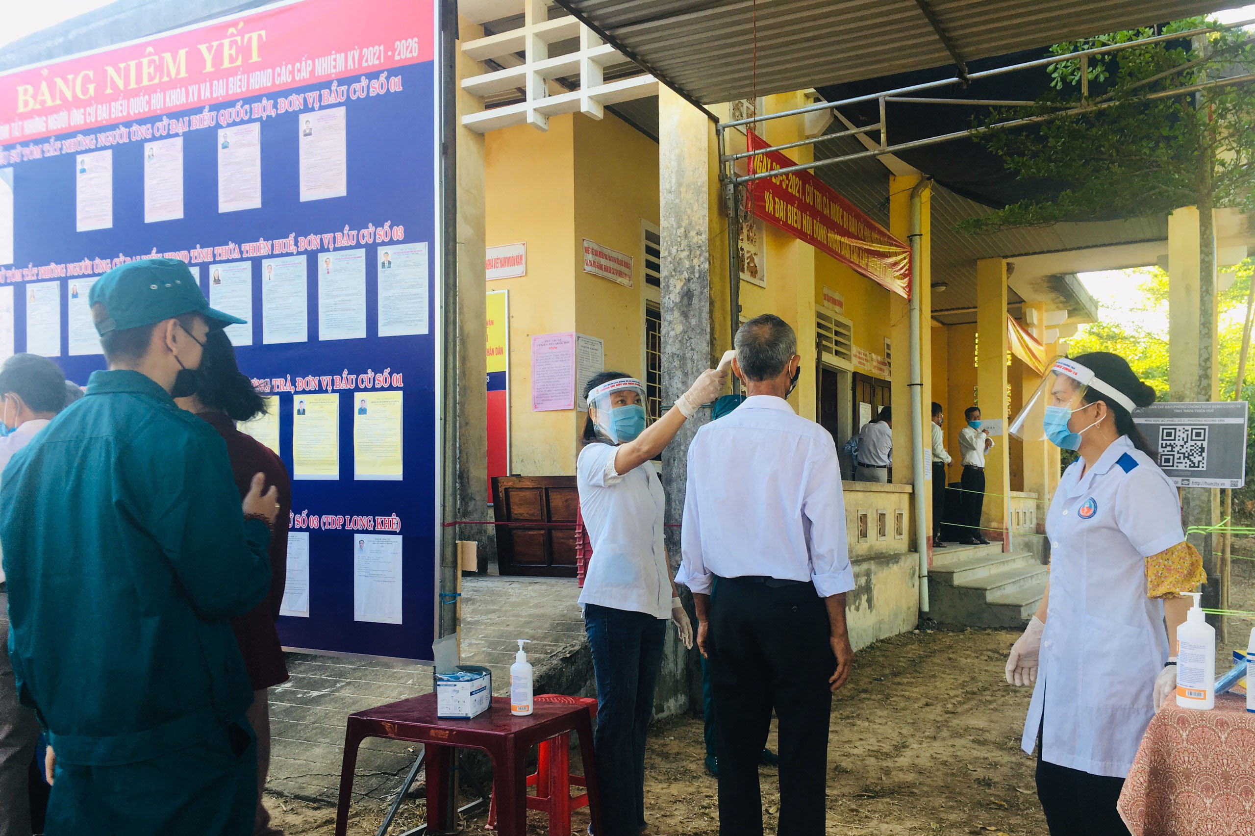 Ngày bầu cử diễn ra, tại mỗi điểm bỏ phiếu đều có 02 cán bộ y tế làm nhiệm vụ đo thân nhiệt và phục vụ bầu cử như: hướng dẫn thực hiện 5K, lối đi theo hướng một chiều, có khu vực riêng cho những công dân có biểu hiện về hô hấp, nếu có biêu hiện nghi ngờ báo ngay cho hai đội đáp ứng nhanh của Trung tâm Y tế nhằm xử lý kịp thời...