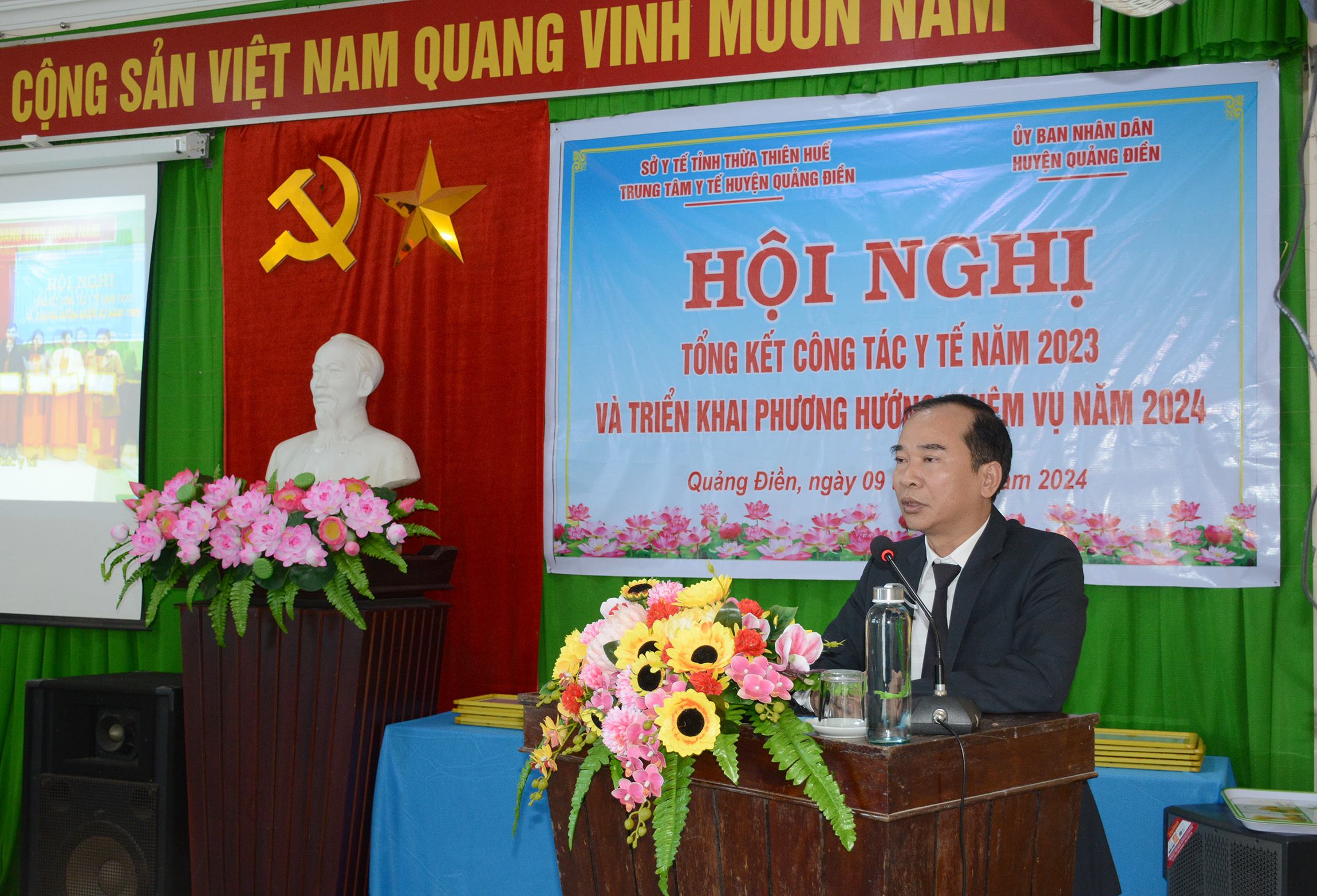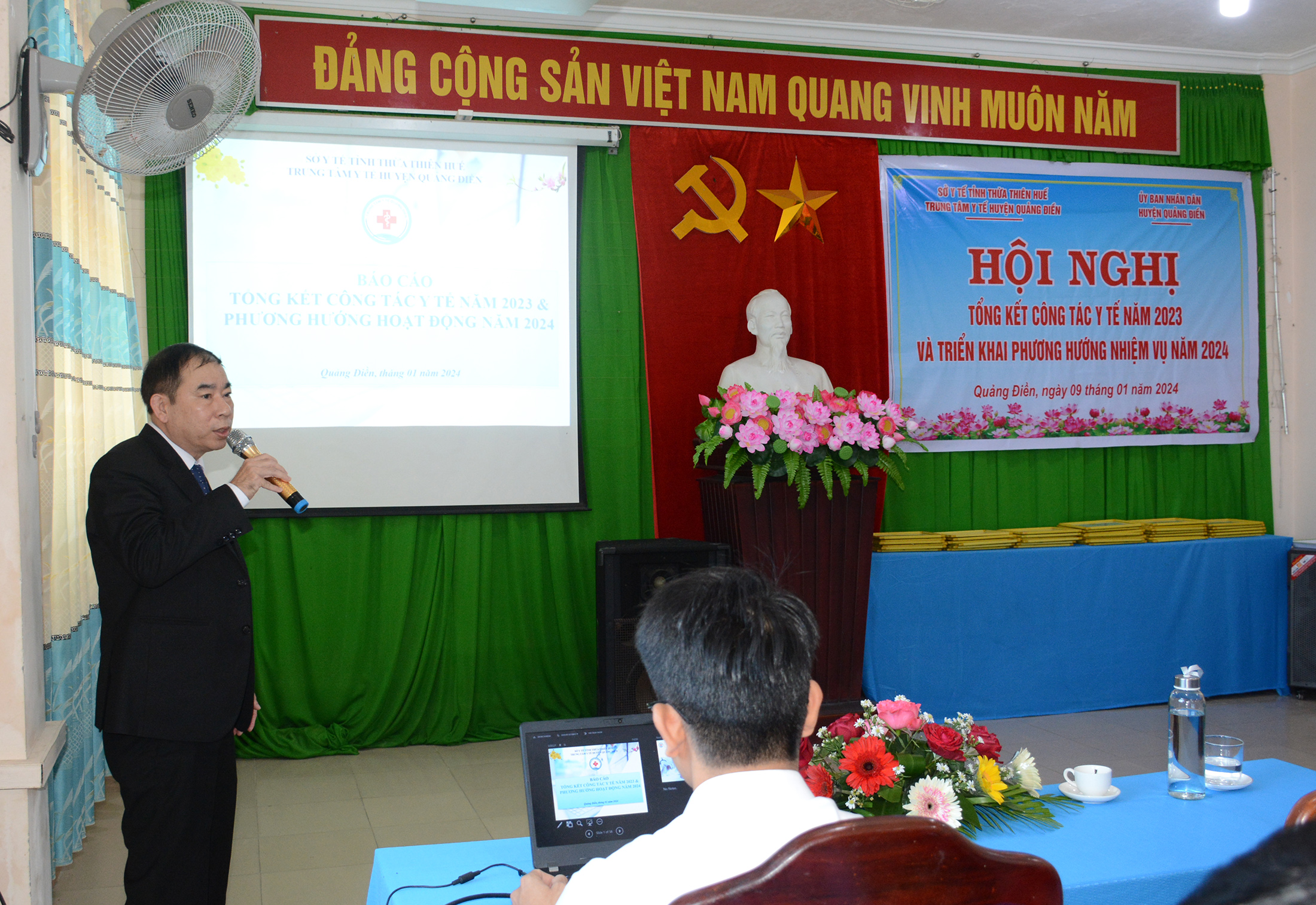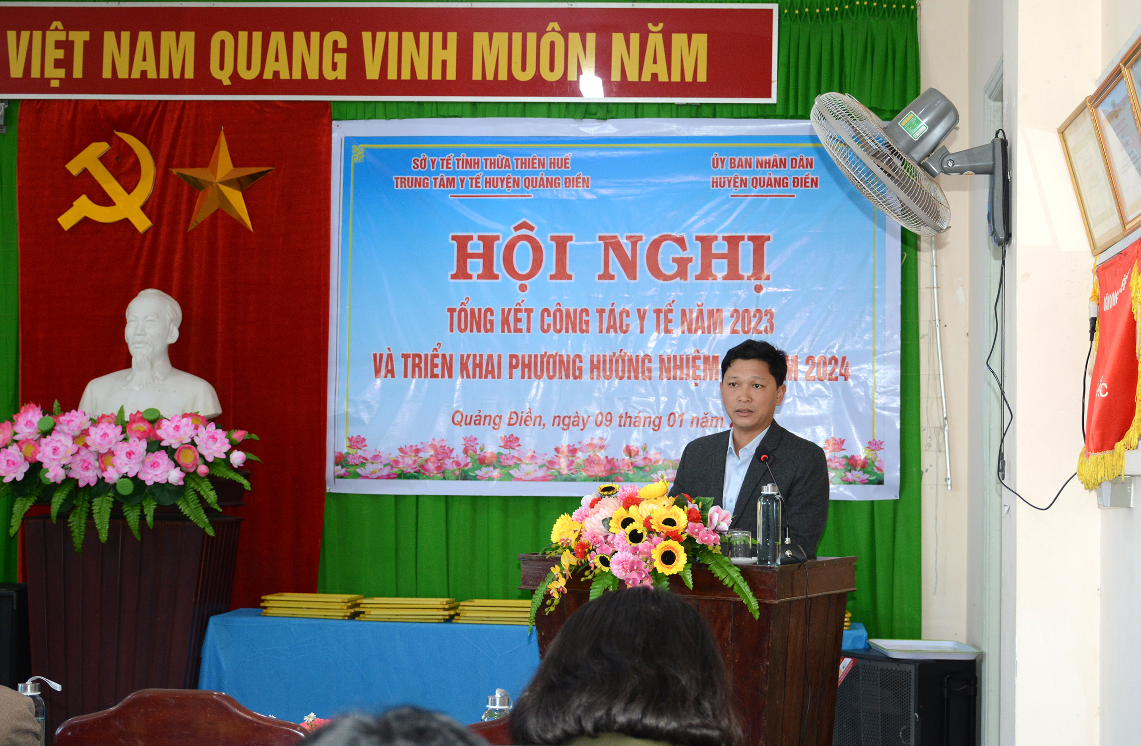 Chiều ngày 09/01/2023, TTYT huyện Quảng Điền tổ chức Hội nghị Tổng kết công tác Y tế năm 2023 và triển khai nhiệm vụ năm 2024. Tham dự hội nghị có đại diện lãnh đạo Thường vụ huyện ủy, Thường trực HĐND, UBND, UBMTTQVN, các Ban/ngành, đơn vị của huyện Quảng Điền; đại diện lãnh đạo/chuyên viên các Phòng thuộc Sở Y tế, các đơn vị trực thuộc/bệnh viện chuyên khoa tuyến tỉnh; Cấp ủy, Ban lãnh đạo, các đoàn thể, các khoa/phòng TTYT và lãnh đạo UBND, Trạm Y tế 11 xã/thị trấn thuộc huyện Quảng Điền. ThS.BSCKII Nguyễn Mậu Duyên - Trưởng Phòng Nghiệp vụ Y được sự ủy quyền của Giám đốc Sở Y tế dự và đồng chí Nguyễn Tuấn Anh - Phó Chủ tịch UBND huyện Quảng Điền cùng chỉ đạo hội nghị.