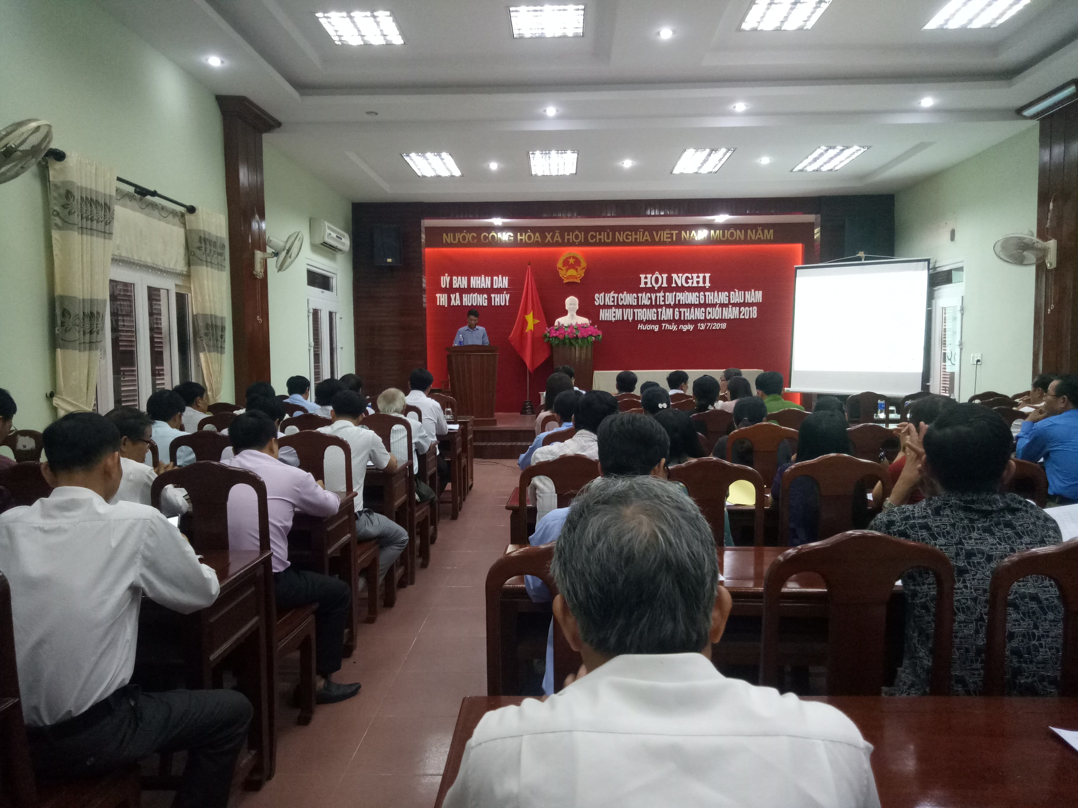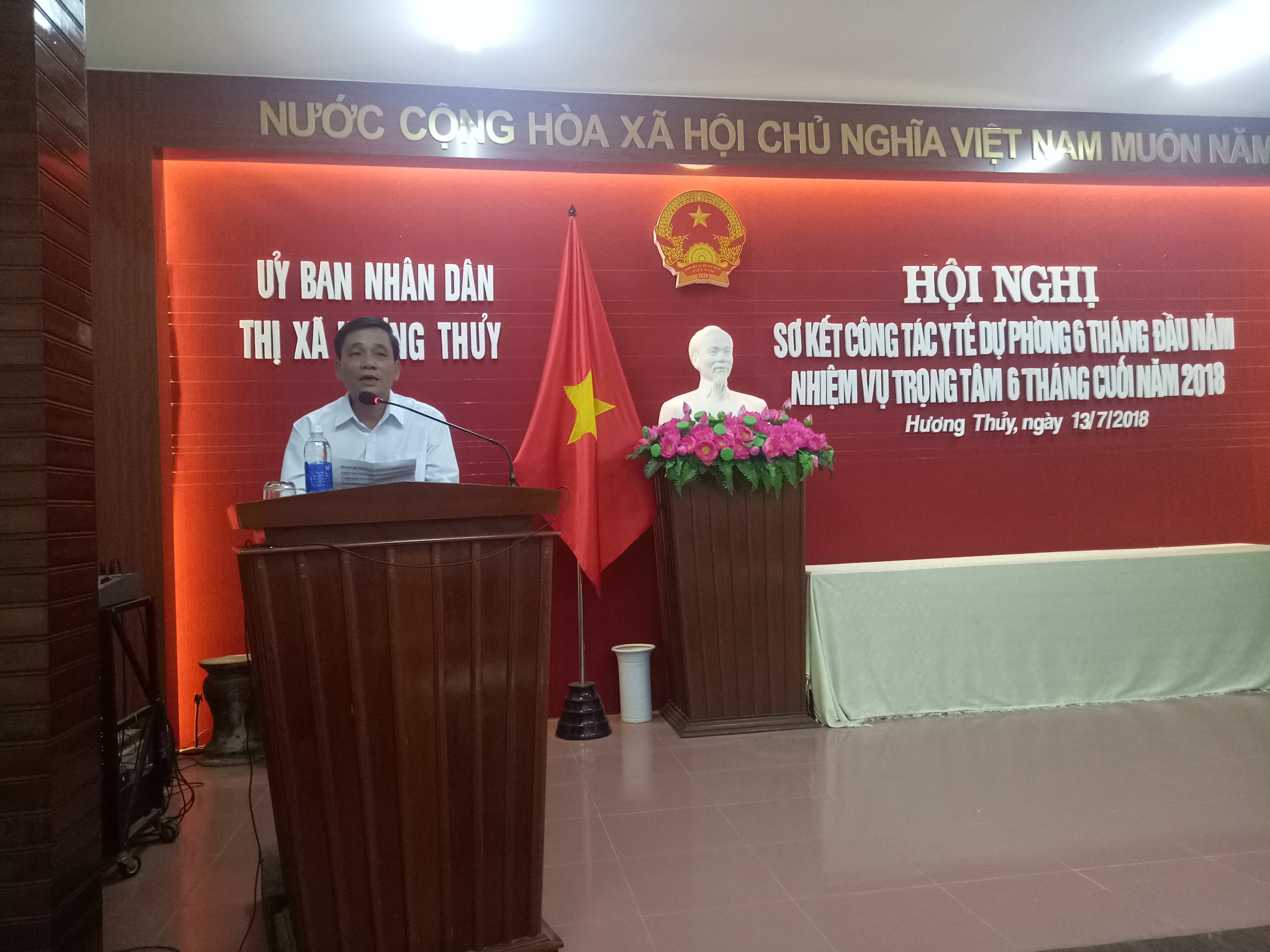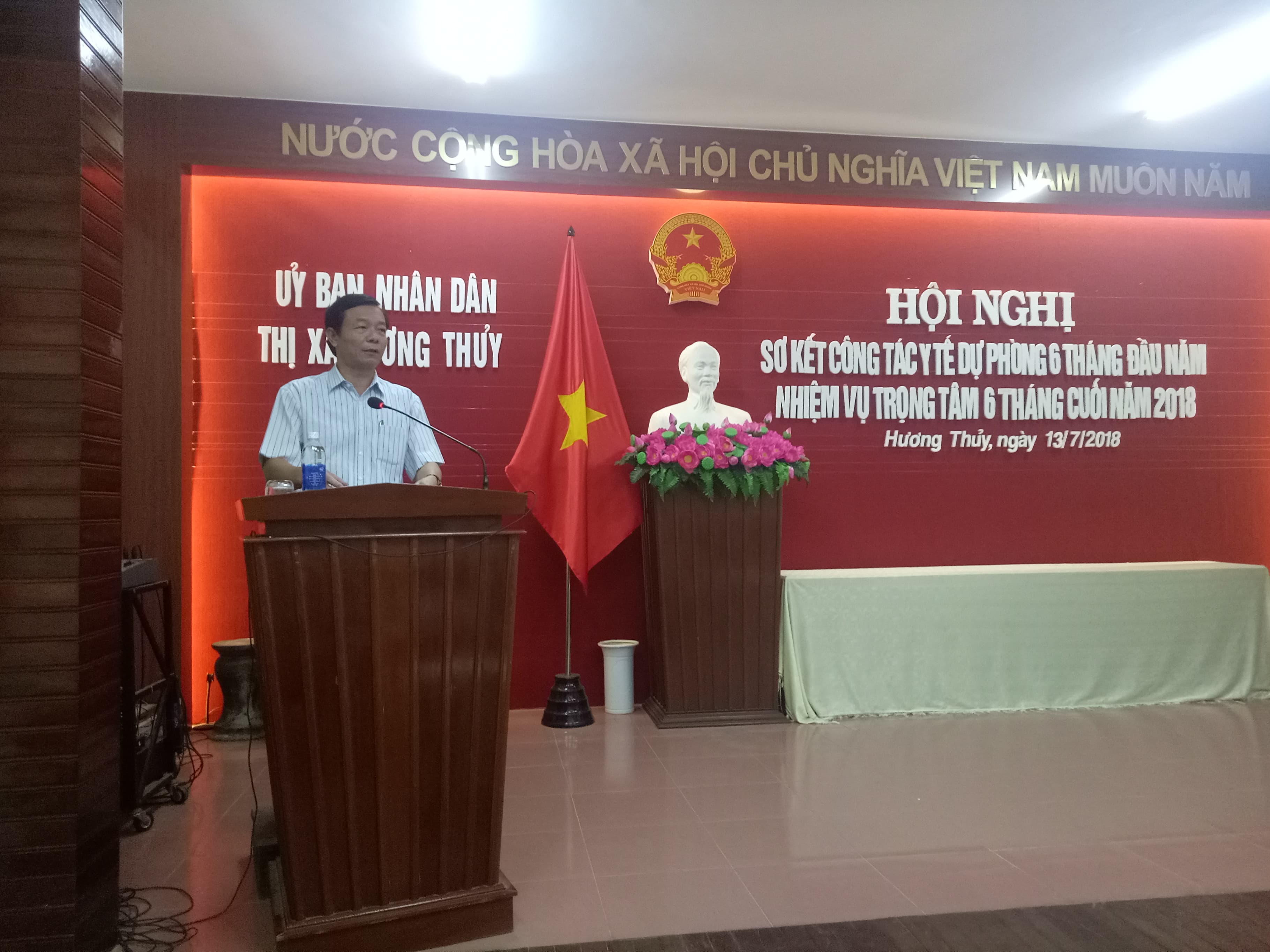 Sáng ngày 13 tháng 7 năm 2018, tại hội trường UBND thị xã Hương Thủy đã diễn ra Hội nghị sơ kết công tác Y tế dự phòng 6 tháng đầu năm và triển khai nhiệm vụ trọng tâm 6 tháng cuối năm 2018. Chủ trì Hội nghị là đồng chí Đỗ Xuân Giao – Phó chủ tịch UBND, trưởng Ban chỉ đạo liên ngành Bảo vệ, chăm sóc và nâng cao sức khỏe nhân dân thị xã Hương Thủy. Đến tham dự Hội nghị, cấp tỉnh có Ths.Bs. Phan Đăng Tâm – Phó giám đốc Trung tâm Kiểm soát bệnh tật Tỉnh Thừa Thiên Huế; cấp thị xã có Đại diện Thường trực Thị Ủy, đại diện thường trực Hội đồng nhân dân, Đại diện lãnh đạo: Ban Tuyên giáo Thị ủy, Văn phòng Thị ủy, Đại diện lãnh đạo Ban của HĐND thị xã, Đại diện lãnh đạo các phòng, ban, đoàn thể thị xã, Lãnh đạo TTYT thị xã, các thành viên Ban chỉ đạo liên ngành BV, CS và nâng cao sức khỏe nhân dân, BCĐ Phòng chống dịch bệnh, BCĐ liên ngành công tác VSATTP thị xã cùng Đại diện lãnh đạo UBND và Trưởng Trạm Y tế 12 xã, phường.