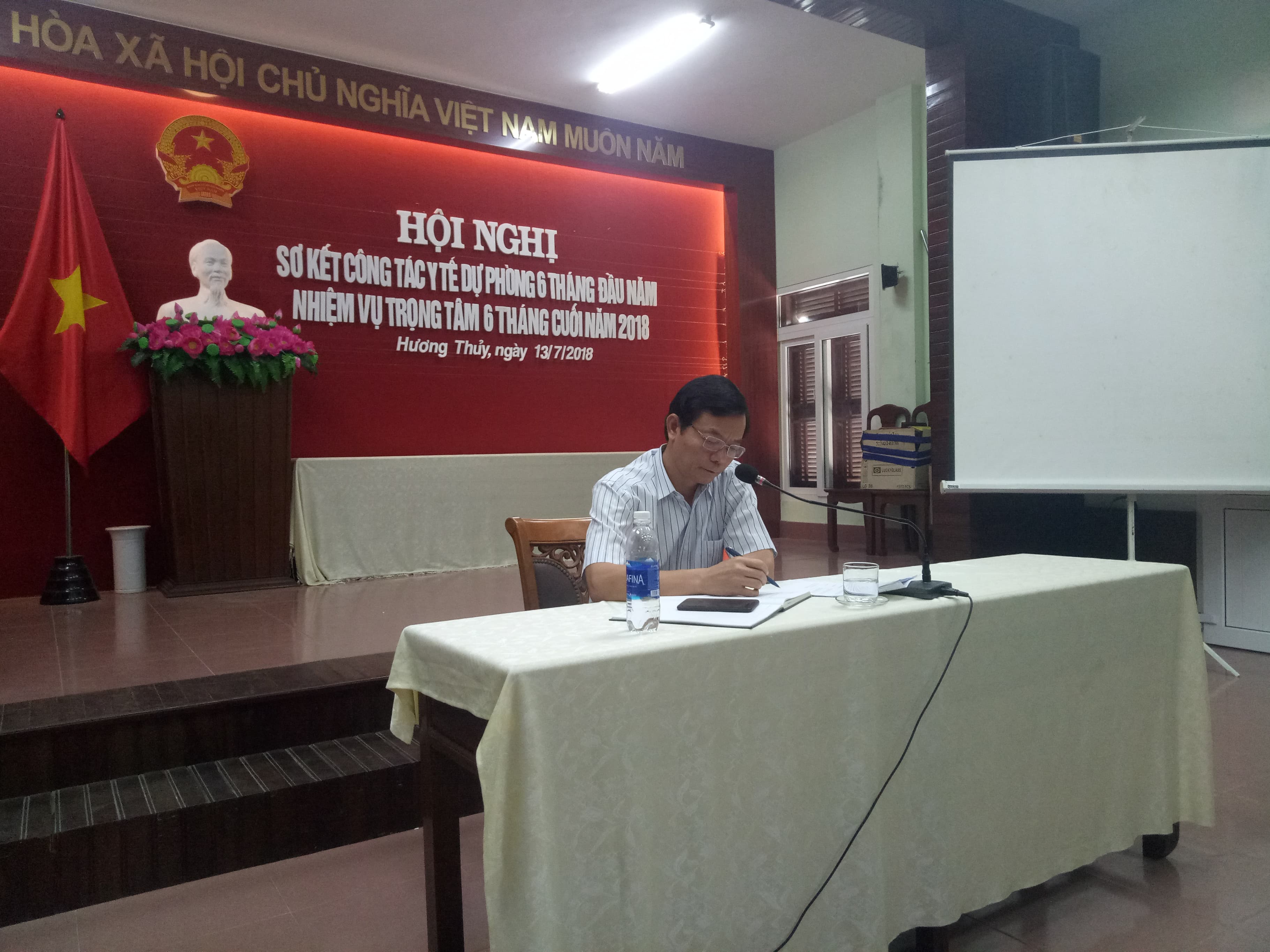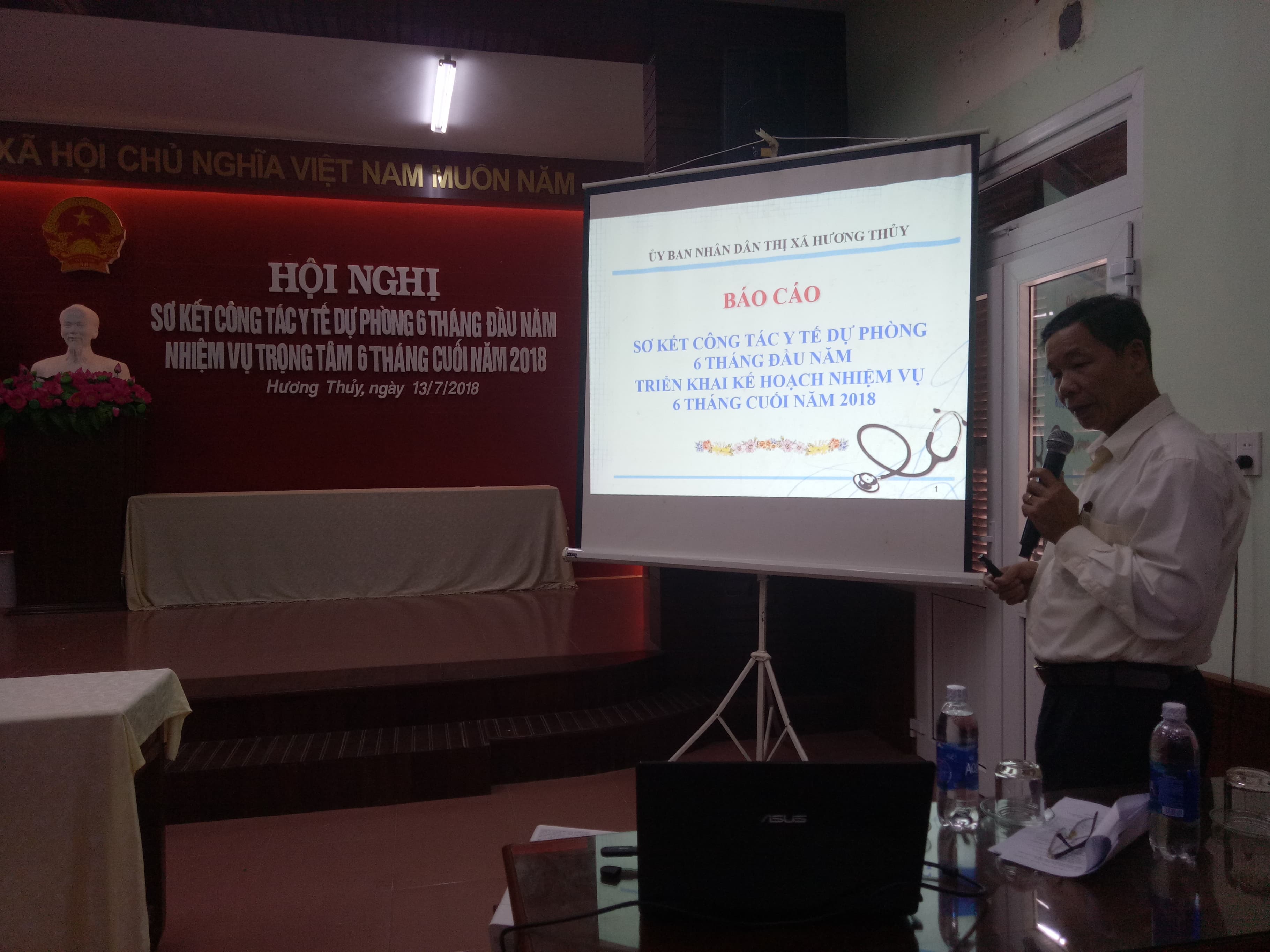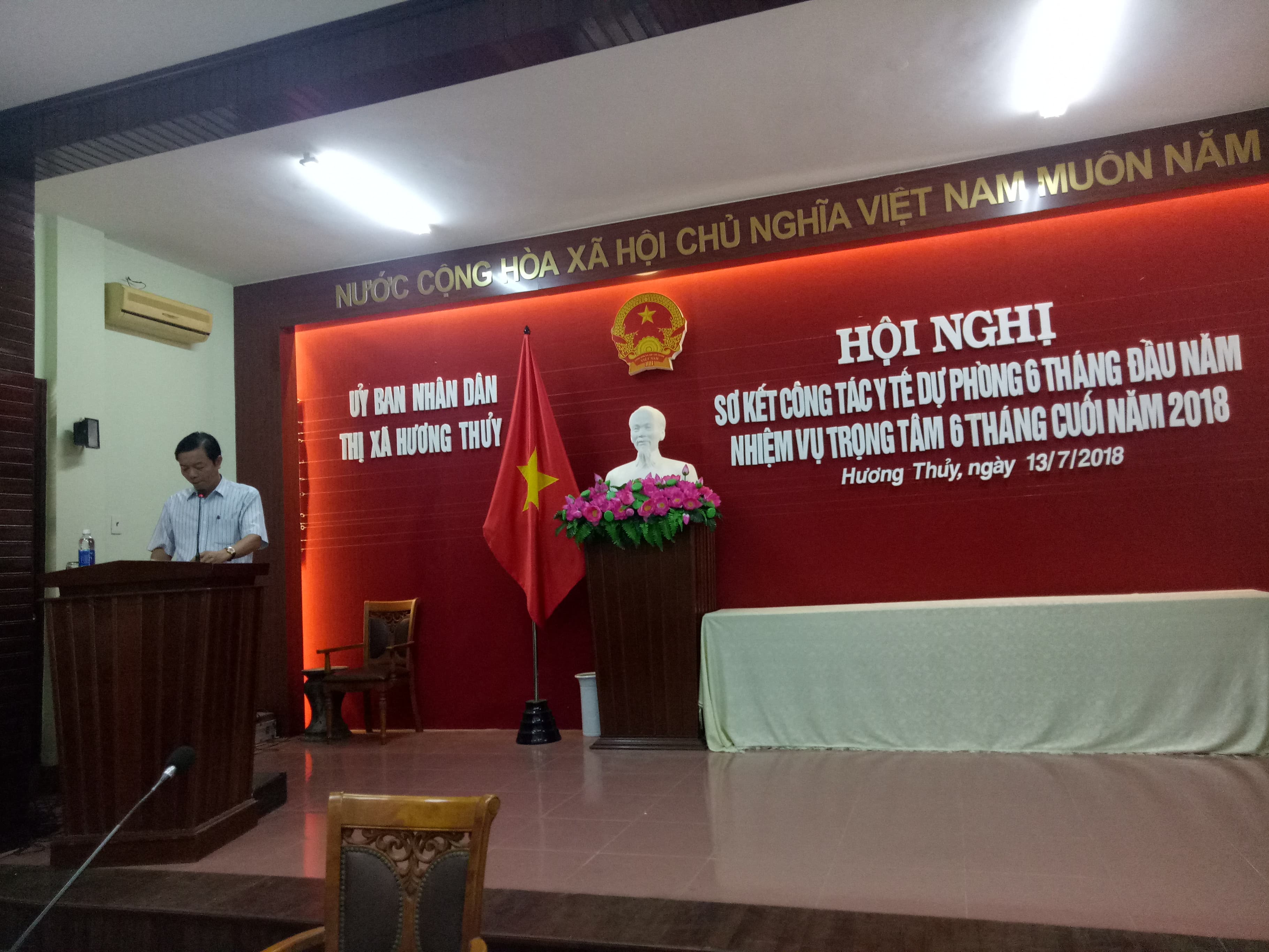 Sáng ngày 13 tháng 7 năm 2018, tại hội trường UBND thị xã Hương Thủy đã diễn ra Hội nghị sơ kết công tác Y tế dự phòng 6 tháng đầu năm và triển khai nhiệm vụ trọng tâm 6 tháng cuối năm 2018. Chủ trì Hội nghị là đồng chí Đỗ Xuân Giao – Phó chủ tịch UBND, trưởng Ban chỉ đạo liên ngành Bảo vệ, chăm sóc và nâng cao sức khỏe nhân dân thị xã Hương Thủy. Đến tham dự Hội nghị, cấp tỉnh có Ths.Bs. Phan Đăng Tâm – Phó giám đốc Trung tâm Kiểm soát bệnh tật Tỉnh Thừa Thiên Huế; cấp thị xã có Đại diện Thường trực Thị Ủy, đại diện thường trực Hội đồng nhân dân, Đại diện lãnh đạo: Ban Tuyên giáo Thị ủy, Văn phòng Thị ủy, Đại diện lãnh đạo Ban của HĐND thị xã, Đại diện lãnh đạo các phòng, ban, đoàn thể thị xã, Lãnh đạo TTYT thị xã, các thành viên Ban chỉ đạo liên ngành BV, CS và nâng cao sức khỏe nhân dân, BCĐ Phòng chống dịch bệnh, BCĐ liên ngành công tác VSATTP thị xã cùng Đại diện lãnh đạo UBND và Trưởng Trạm Y tế 12 xã, phường.