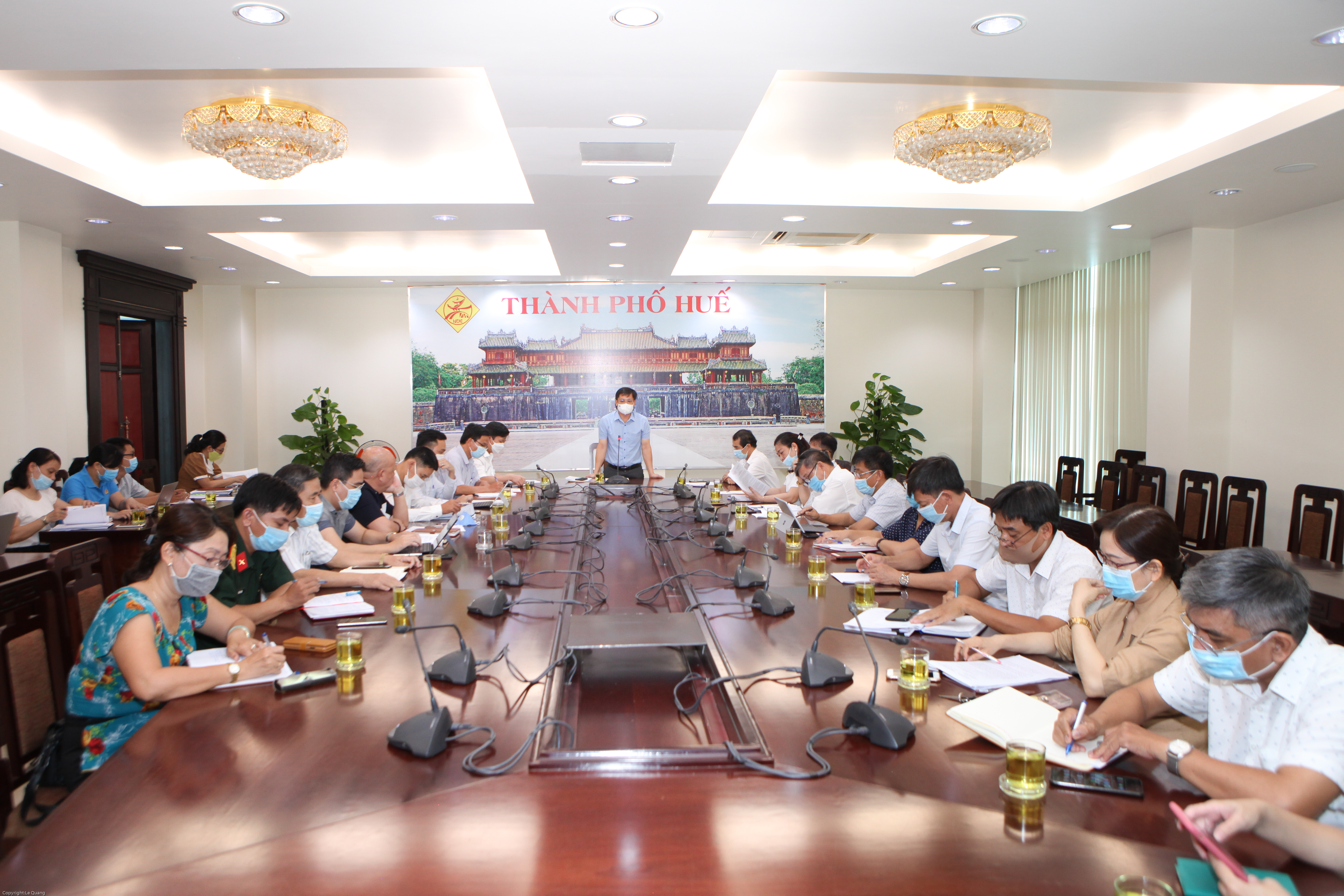 Tiếp đó, đoàn đã làm việc với UBND thành phố Huế, đoàn đã nghe đại diện UBND thành phố Huế báo cáo tình công tác phòng, chống dịch trên địa bàn, thành lập các tổ đội phản ứng nhanh phòng, chống dịch, phương án xử lý nếu F0 xảy ra.Tăng cường chỉ đạo giãn cách, hạn chế tập trung đông người, tăng cường kiểm tra, rà soát phương tiện giao thông tại các chốt đi qua thành phố Huế, đặc biệt tại thời điểm này, Thành phố Huế khá yên ổn, khiến tinh thần cảnh giác của người dân giảm sút.