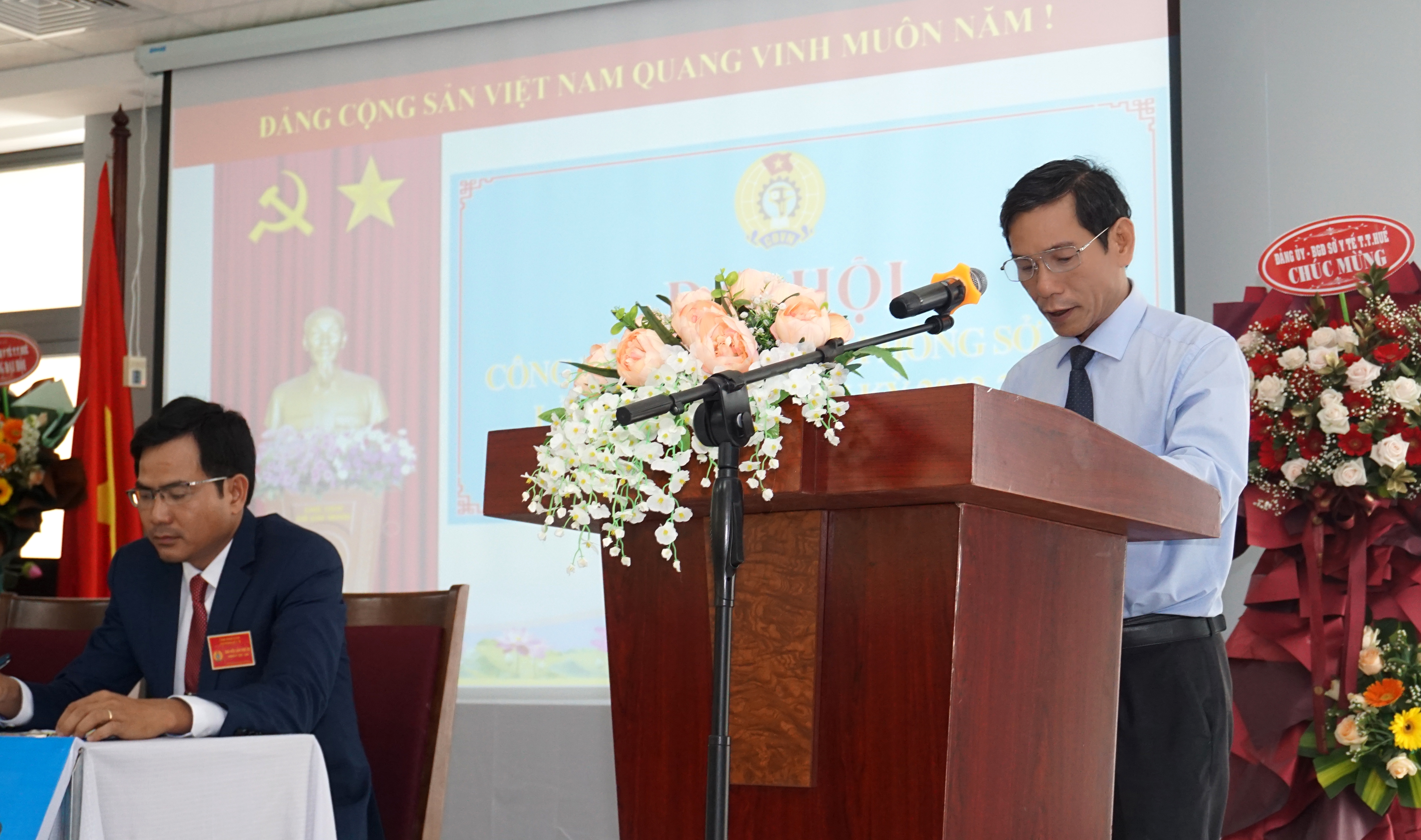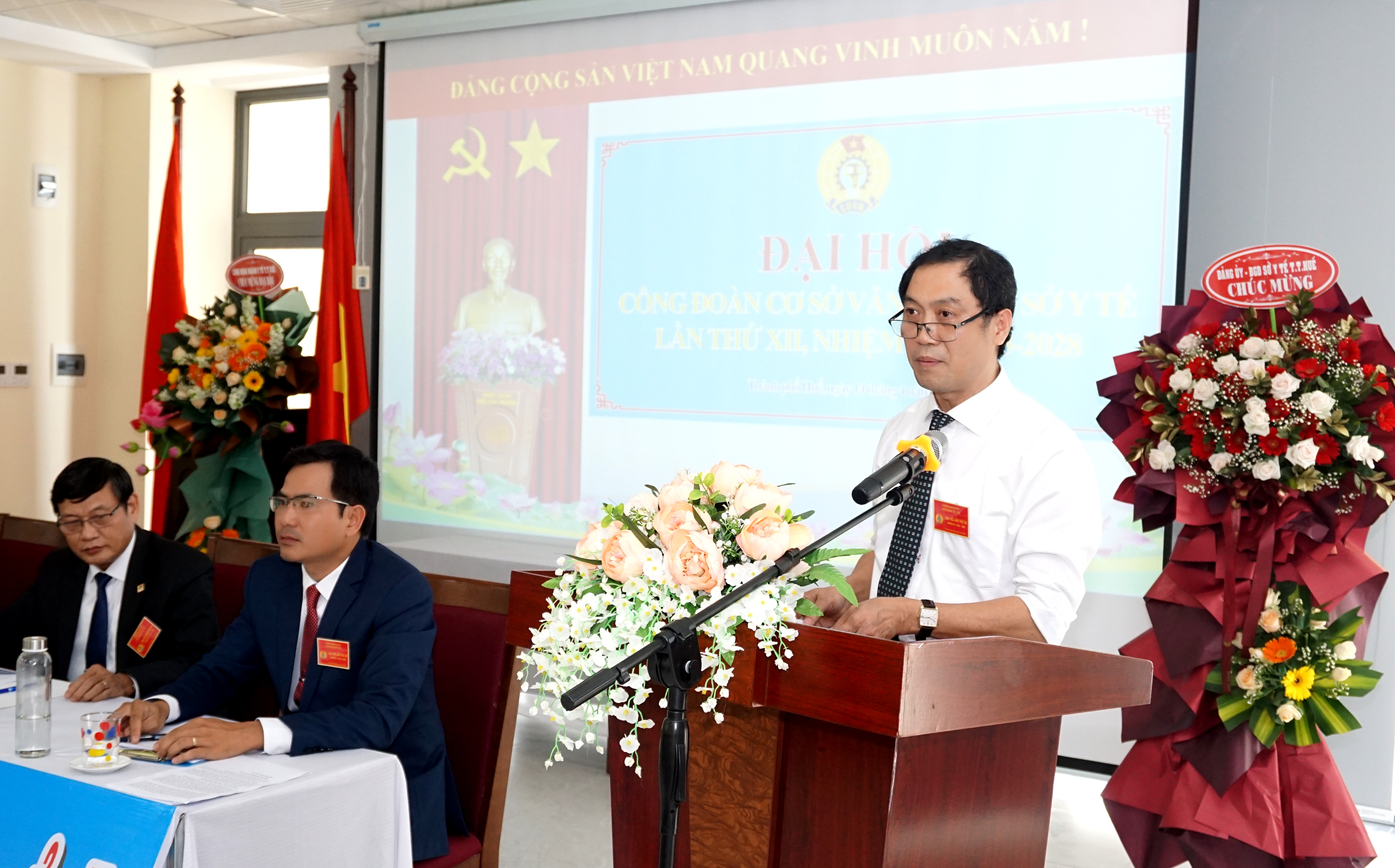PGS.TS.BS Trần Kiêm Hảo - Bí thư Đảng ủy, Giám đốc sở Y tế; DSCKI Lê Viết Bắc - Phó Bí thư Đảng ủy - Phó Giám đốc - Chủ tịch CĐ Ngành Y tế phát biểu chỉ đạo đại hội.