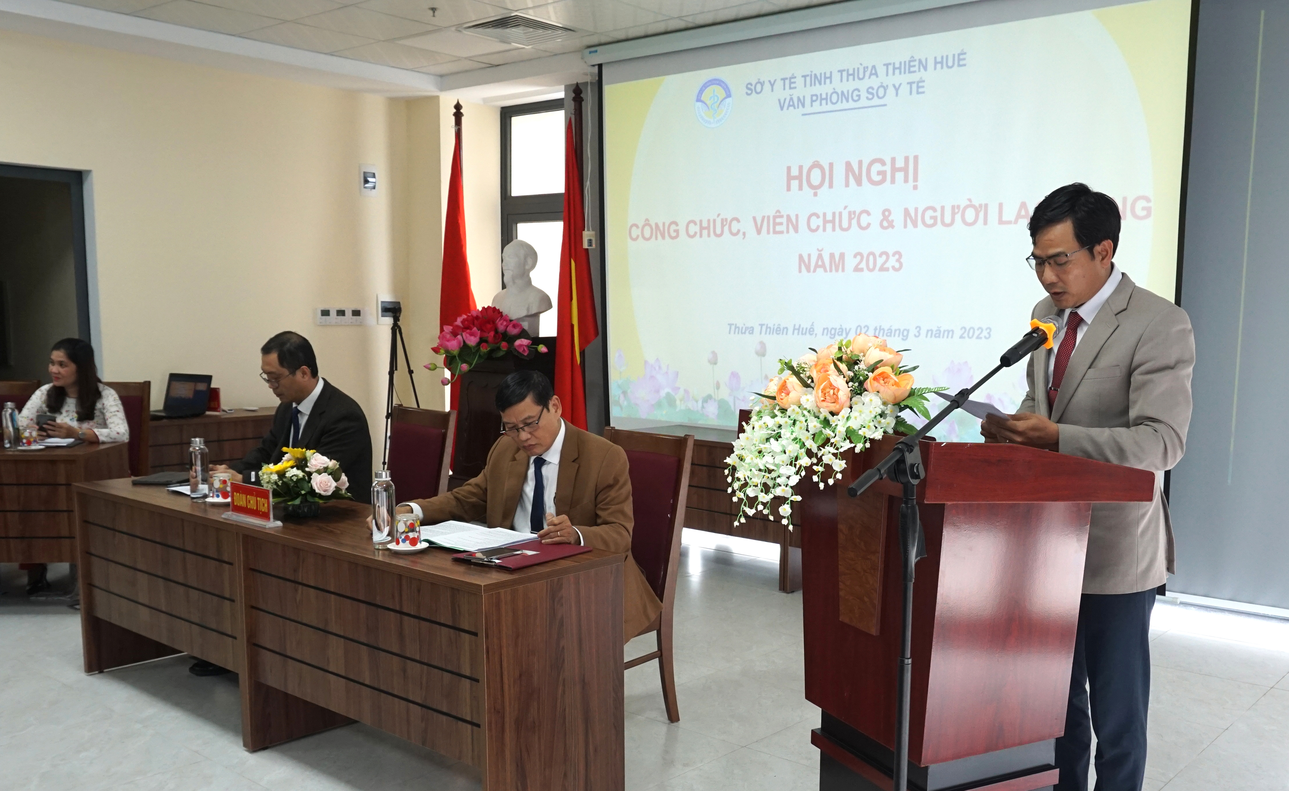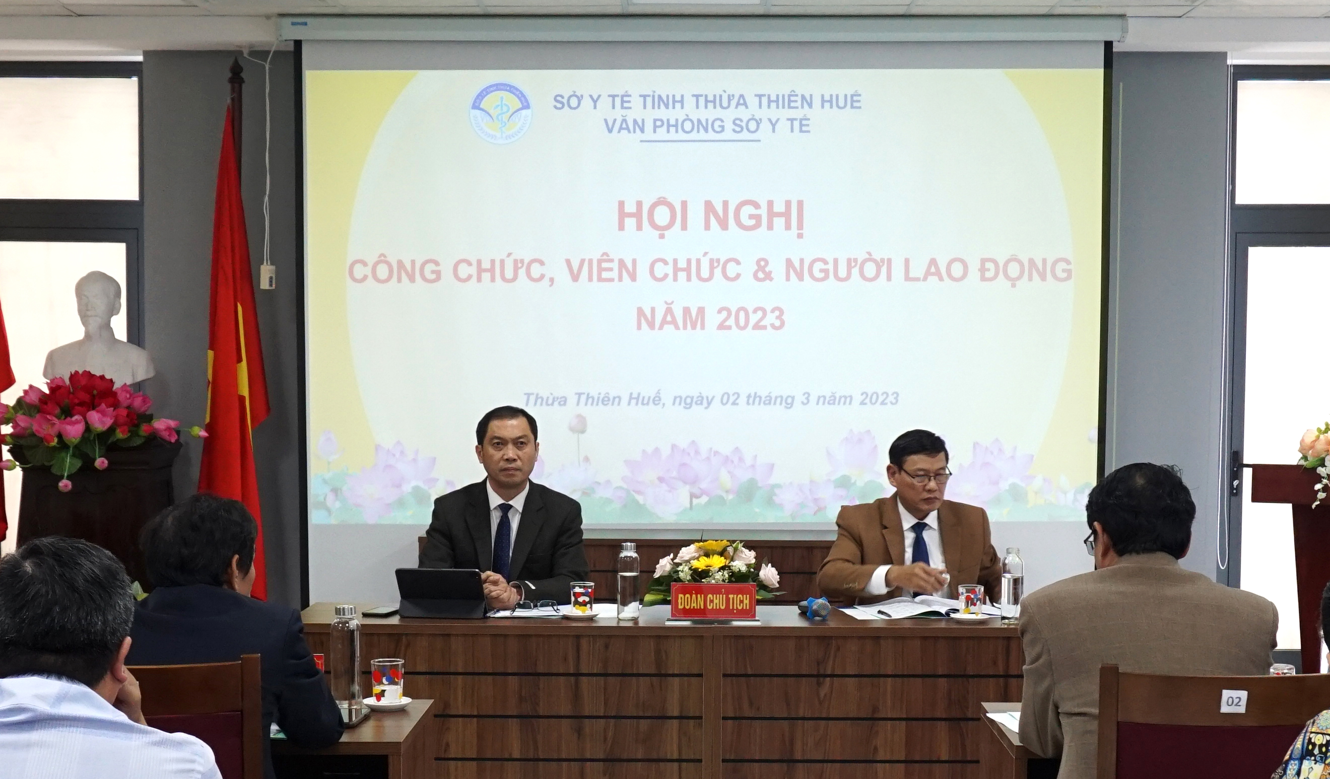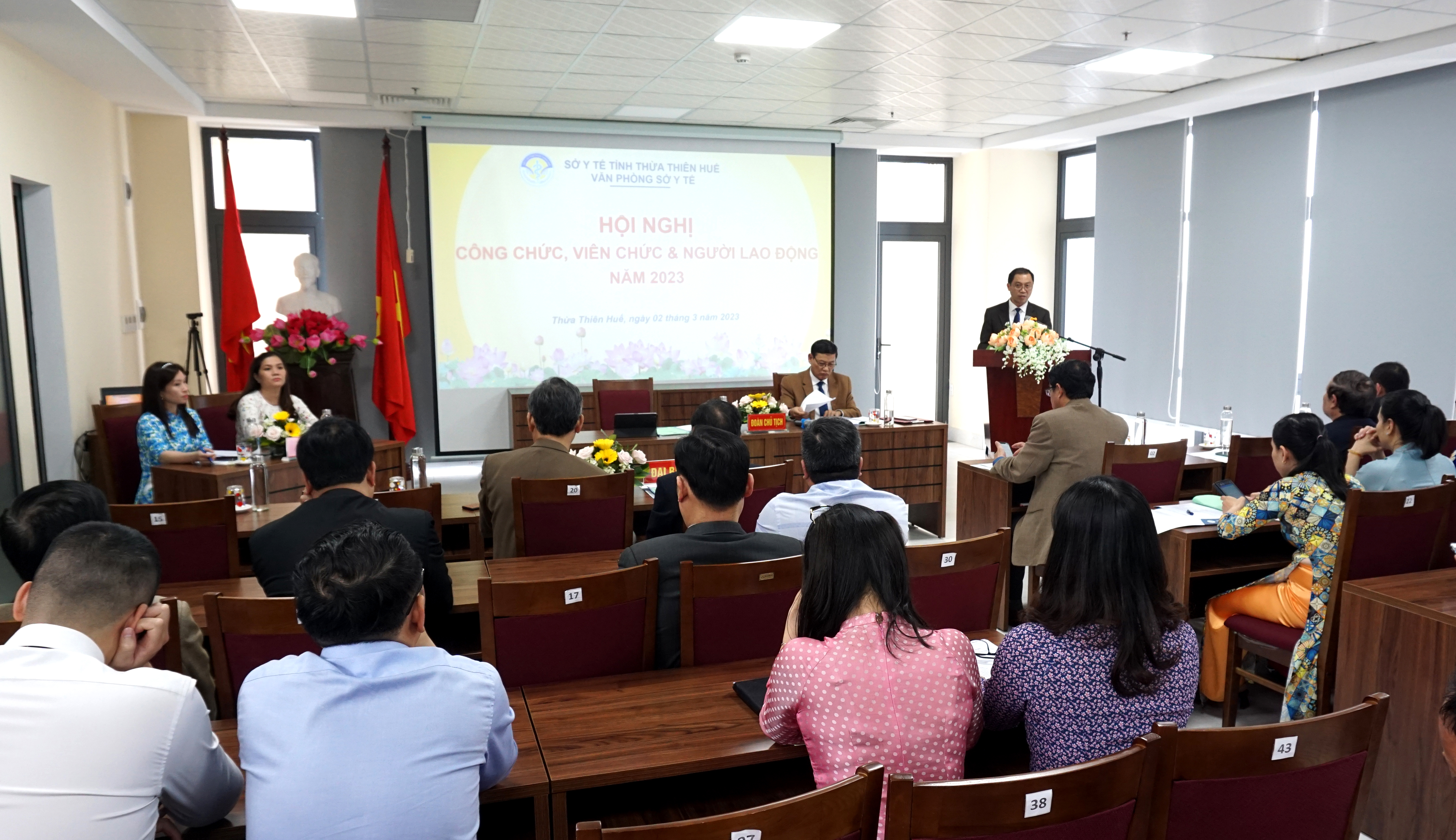 Chiều ngày 02-3-2023, Văn phòng Sở Y tế tổ chức Hội nghị Công chức, Viên chức & Người lao động (CC, VC & NLĐ) năm 2023. Đoàn Chủ tịch chủ trì hội nghị có PGS.TS.BS Trần Kiêm Hảo - Giám đốc Sở Y tế - Thủ trưởng đơn vị và ThS.DS Võ Đức Bảo - Trưởng Phòng Quản lý Dược - Chủ tịch Công đoàn Văn phòng Sở Y tế. DSCKI Lê Viết Bắc - Phó Bí thư Đảng ủy - Phó Giám đốc Sở Y tế - Chủ tịch công đoàn ngành, Trưởng/phó các Phòng cùng toàn thể CC, VC & NLĐ Văn phòng Sở Y tế cùng tham dự hội nghị.