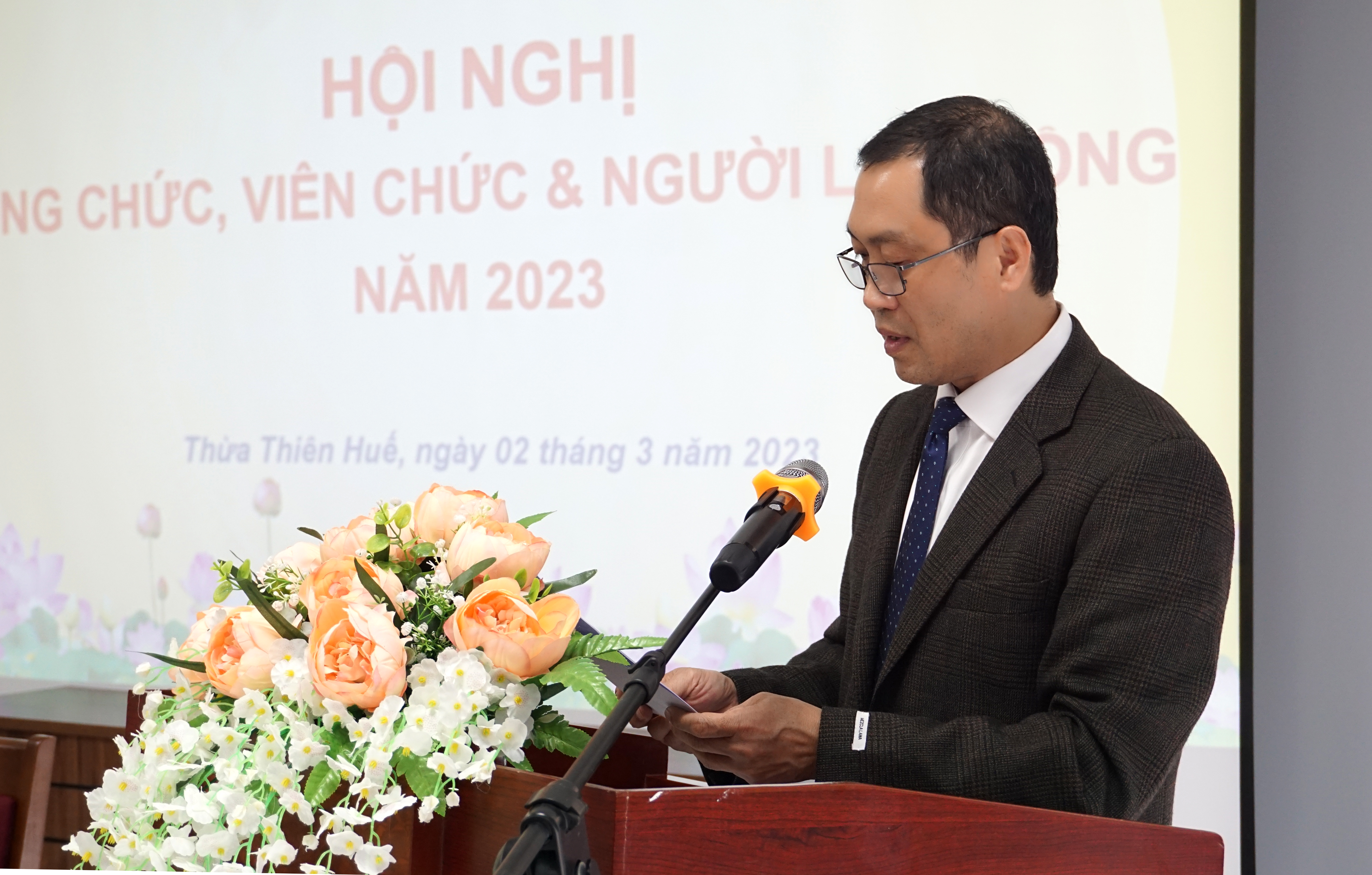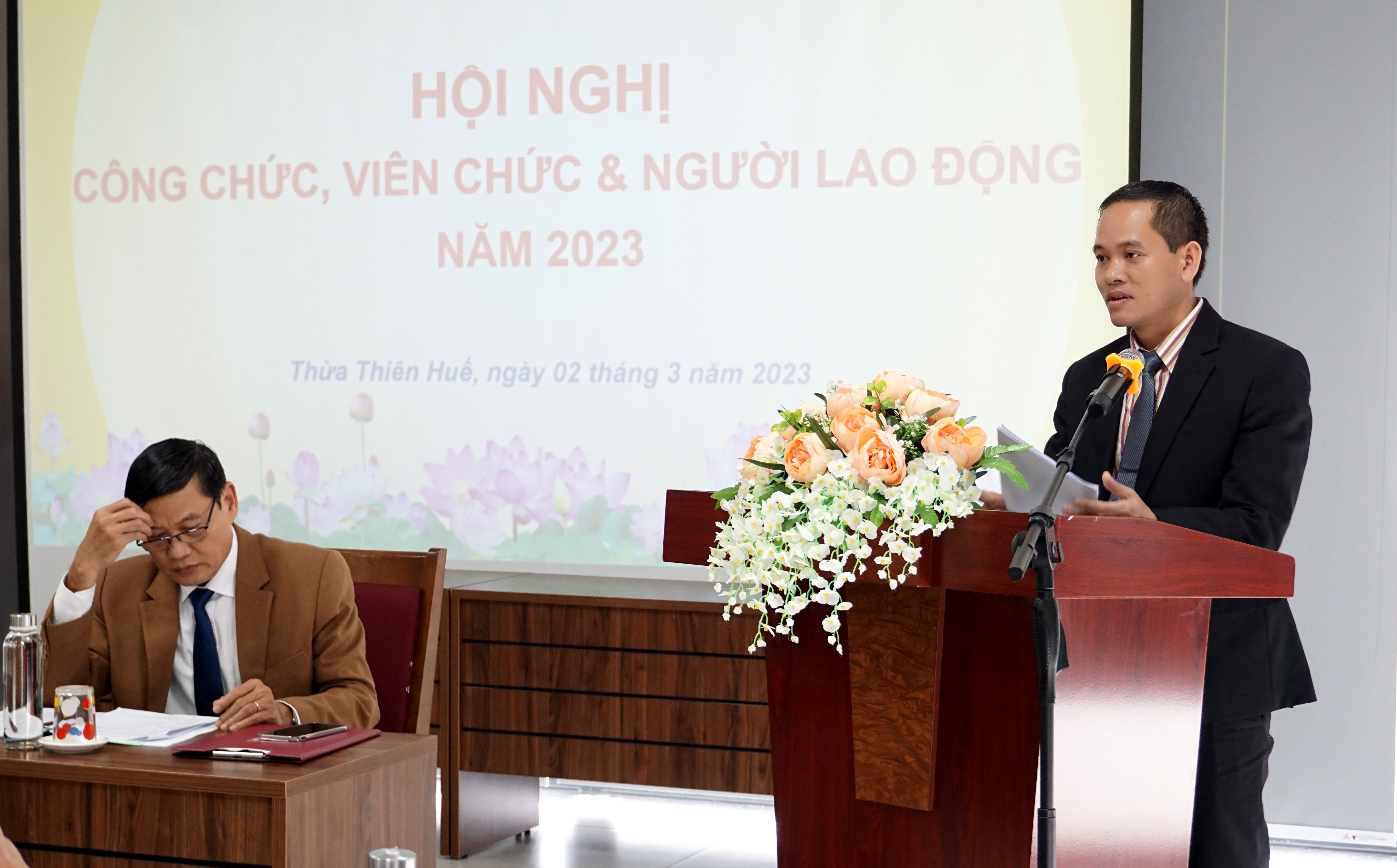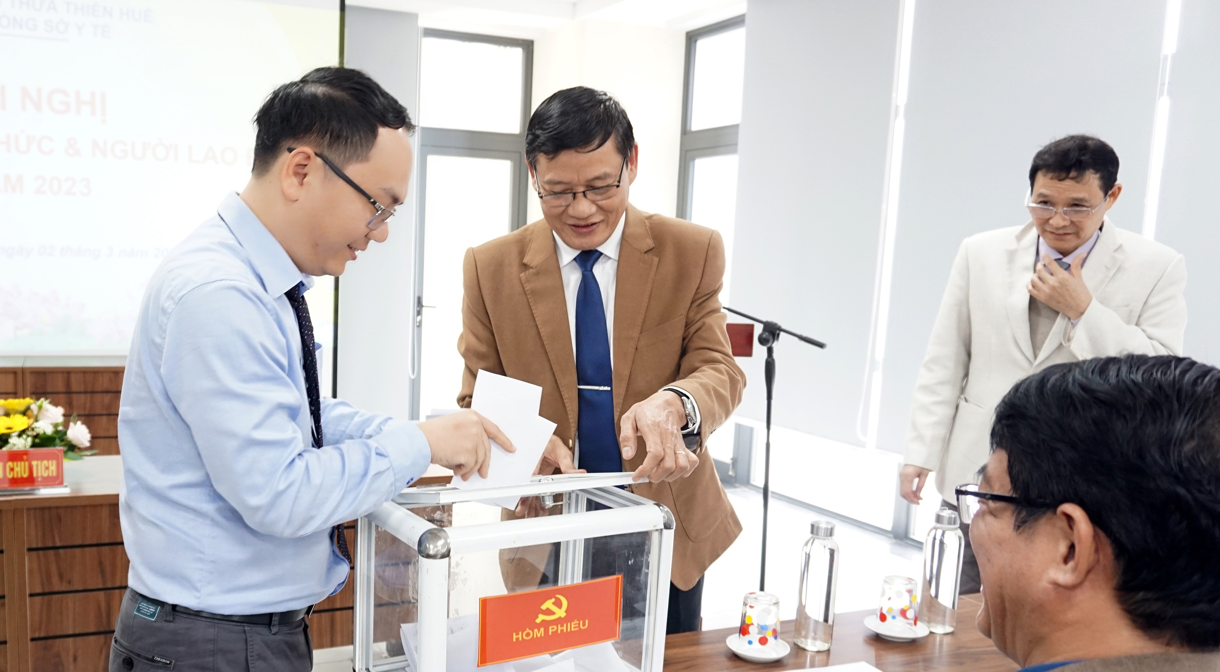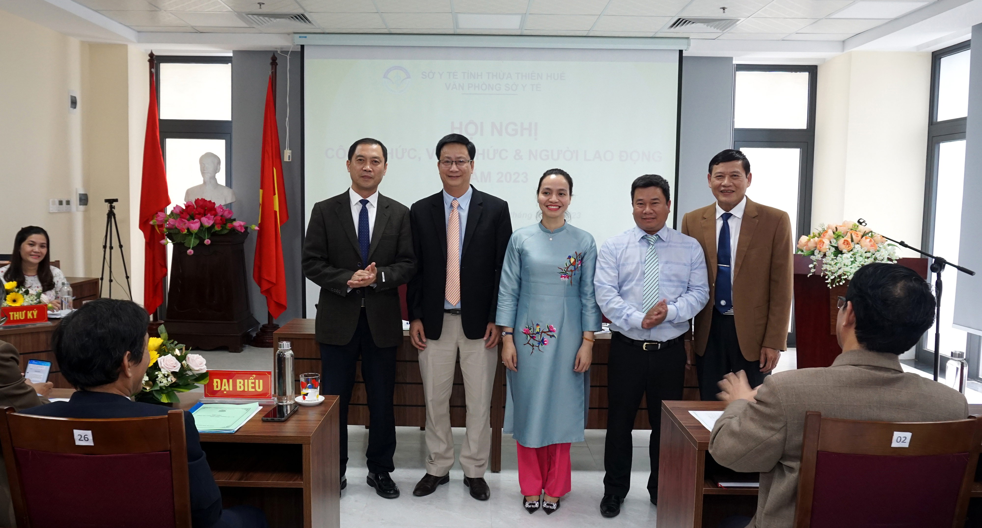 Chiều ngày 02-3-2023, Văn phòng Sở Y tế tổ chức Hội nghị Công chức, Viên chức & Người lao động (CC, VC & NLĐ) năm 2023. Đoàn Chủ tịch chủ trì hội nghị có PGS.TS.BS Trần Kiêm Hảo - Giám đốc Sở Y tế - Thủ trưởng đơn vị và ThS.DS Võ Đức Bảo - Trưởng Phòng Quản lý Dược - Chủ tịch Công đoàn Văn phòng Sở Y tế. DSCKI Lê Viết Bắc - Phó Bí thư Đảng ủy - Phó Giám đốc Sở Y tế - Chủ tịch công đoàn ngành, Trưởng/phó các Phòng cùng toàn thể CC, VC & NLĐ Văn phòng Sở Y tế cùng tham dự hội nghị.