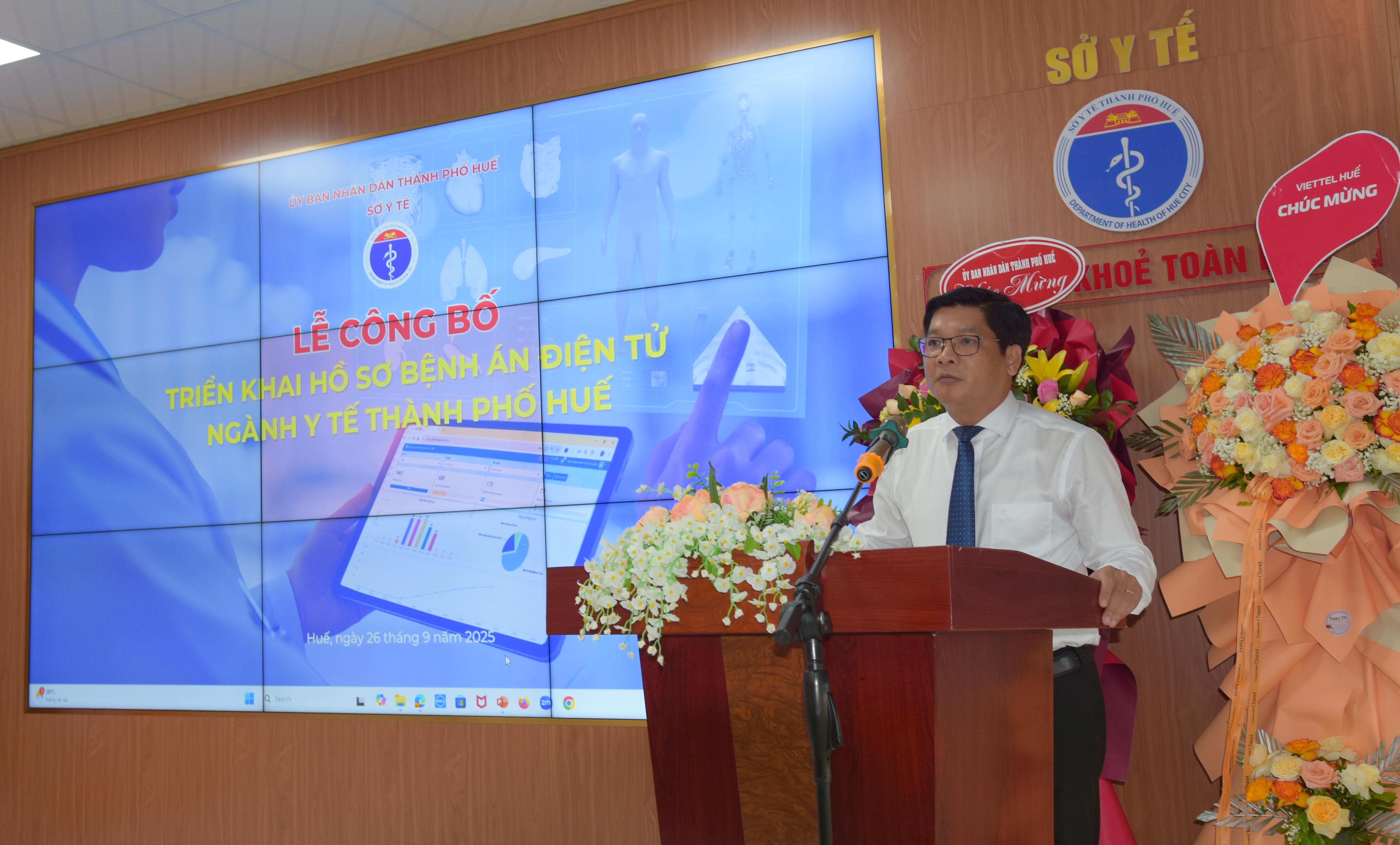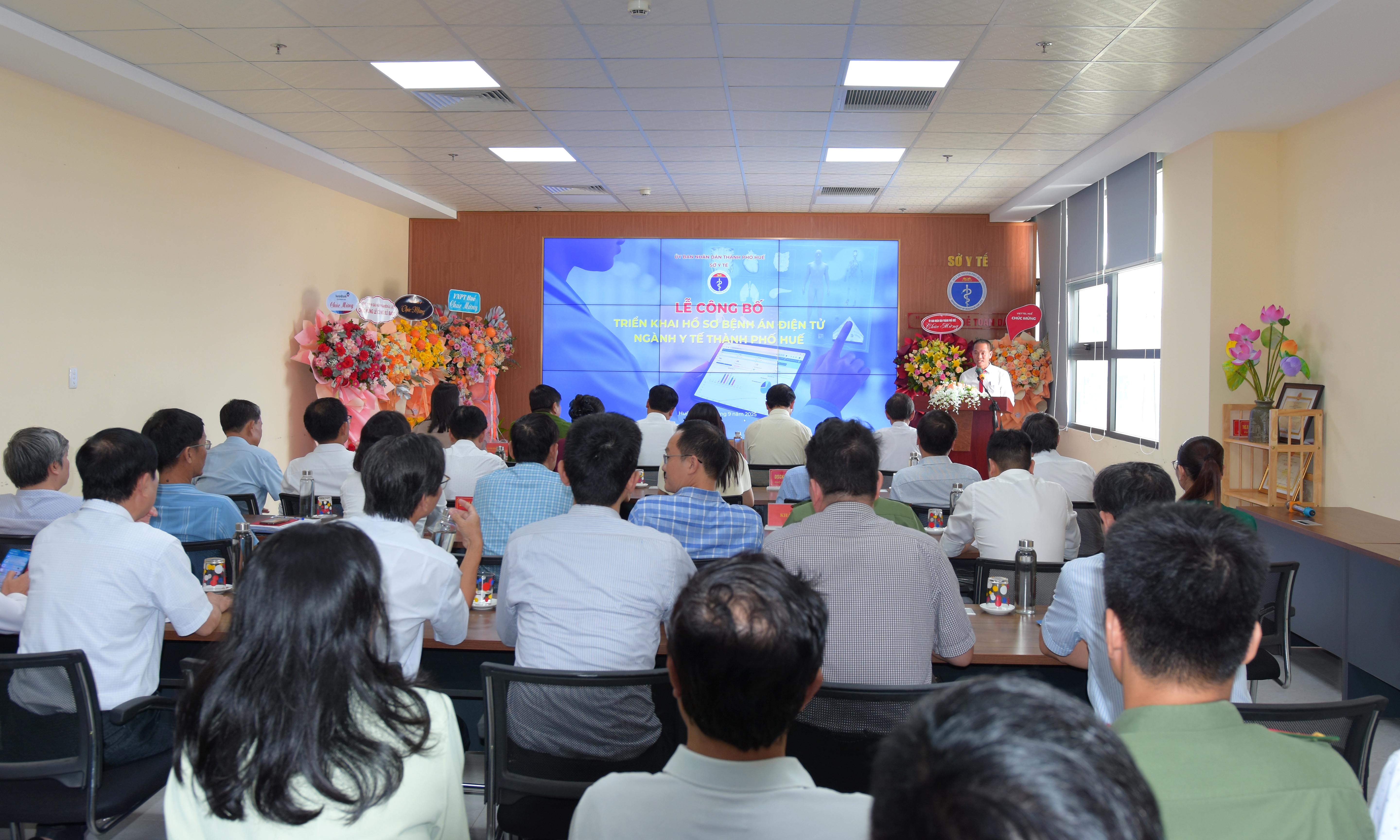Ngày 26/9, Sở Y tế tổ chức “Lễ Công bố triển khai Hồ sơ bệnh án điện tử Ngành Y tế thành phố Huế”. Đồng chí Nguyễn Chí Tài - Uỷ viên Ban Thường vụ thành uỷ - Phó Chủ tịch UBND thành phố, đại diện lãnh đạo các sở Khoa học & Công nghệ, Công An, Bảo hiểm xã hội thành phố; Ban Giám đốc, trưởng các Phòng chuyên môn/nghiệp vụ Sở Y tế; các đối tác, đơn vị viễn thông trên địa bàn, Giám đốc 9 TTYT và 8 bệnh viện đa khoa/chuyên khoa trực thuộc Sở Y tế thành phố Huế cùng tham dự.