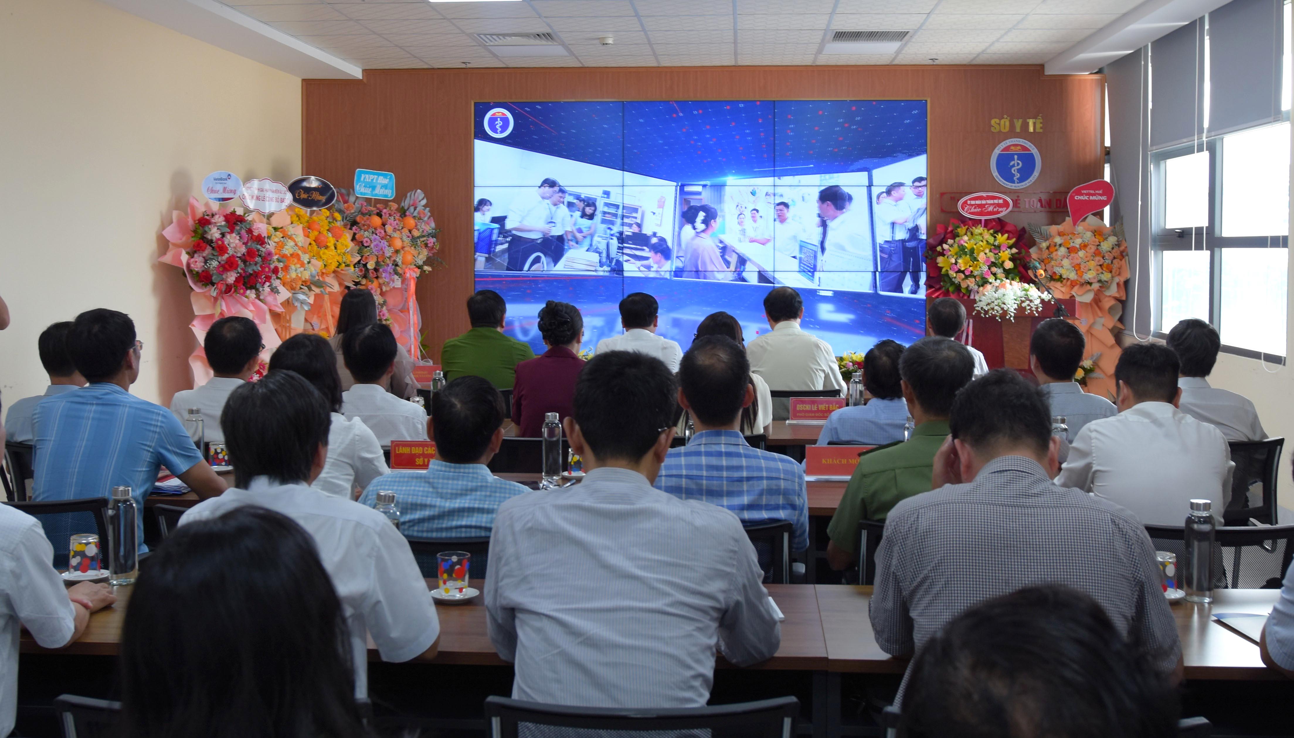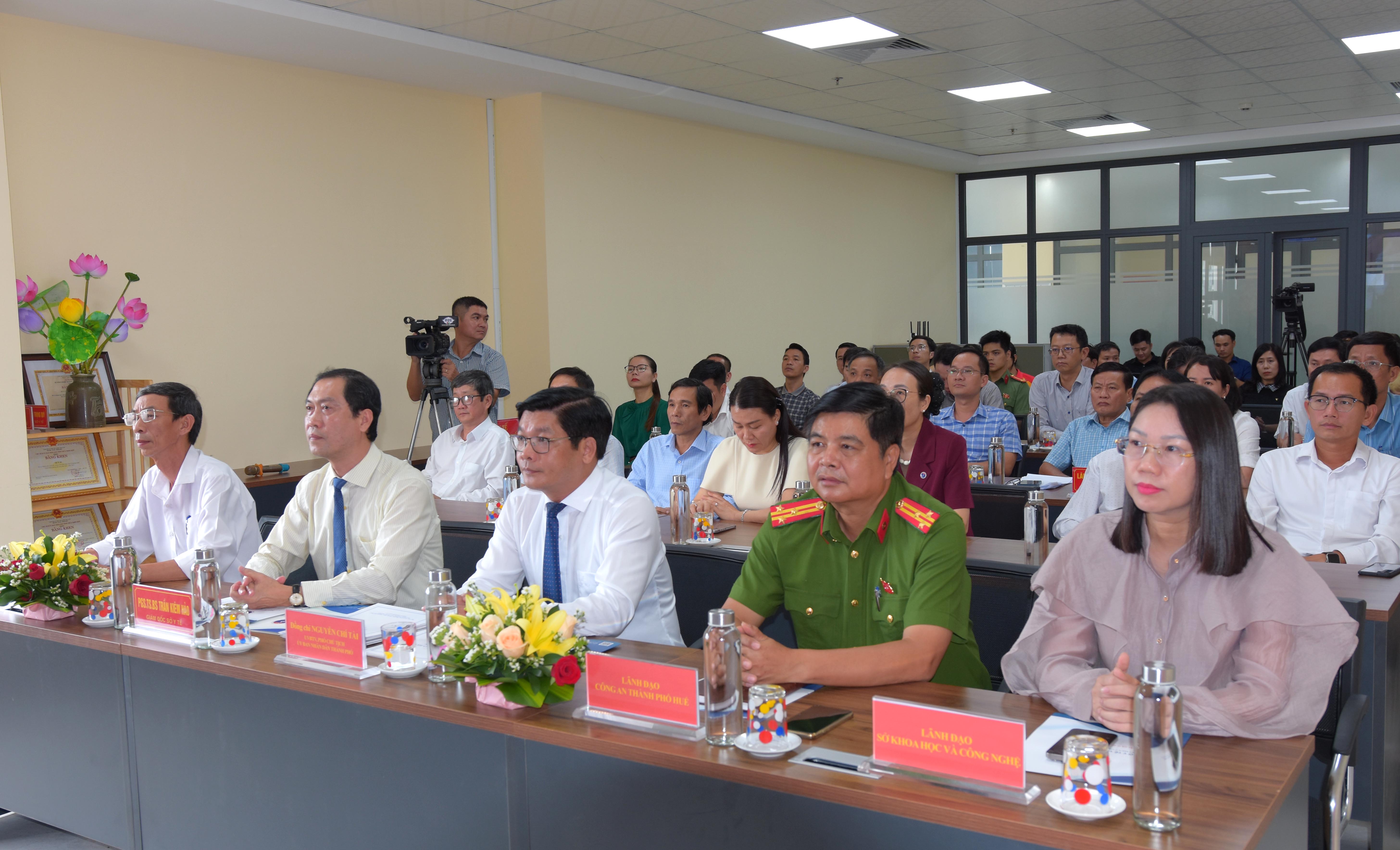 Lãnh đạo UBND, Sở KH & CN, Sở Y tế, BHXH và Công an thành phố Huế thực hiện nghi thức bấm nút vận hành Hệ thống HSBA ĐT trong toàn Ngành Y tế thành phố