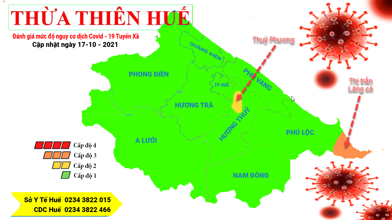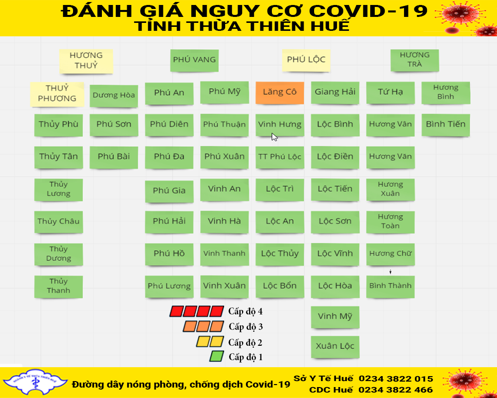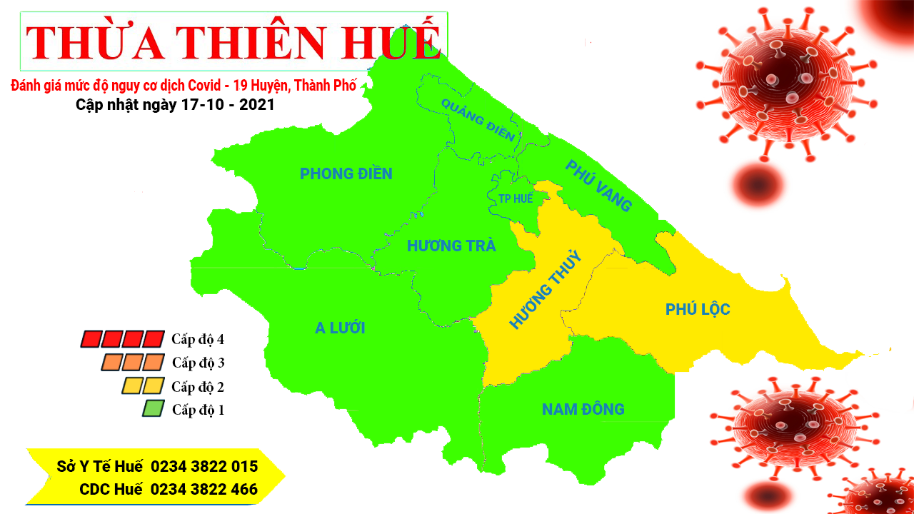 BẢNG ĐÁNH GIÁ CẤP ĐỘ NGUY CƠ COVID-19 CẬP NHẬT NGÀY 17/10/2021 - PHÂN LOẠI CẤP ĐỘ THEO NGHỊ QUYẾT 128/NQ-CP 🔴 Màu đỏ: Cấp độ 4 - Nguy cơ rất cao 🟠 Màu cam: Cấp độ 3 - Nguy cơ cao 🟡 Màu vàng: Cấp độ 2 - Nguy cơ trung bình 🟢 Màu xanh: Cấp độ 1 - Nguy cơ thấp (bình thường mới)