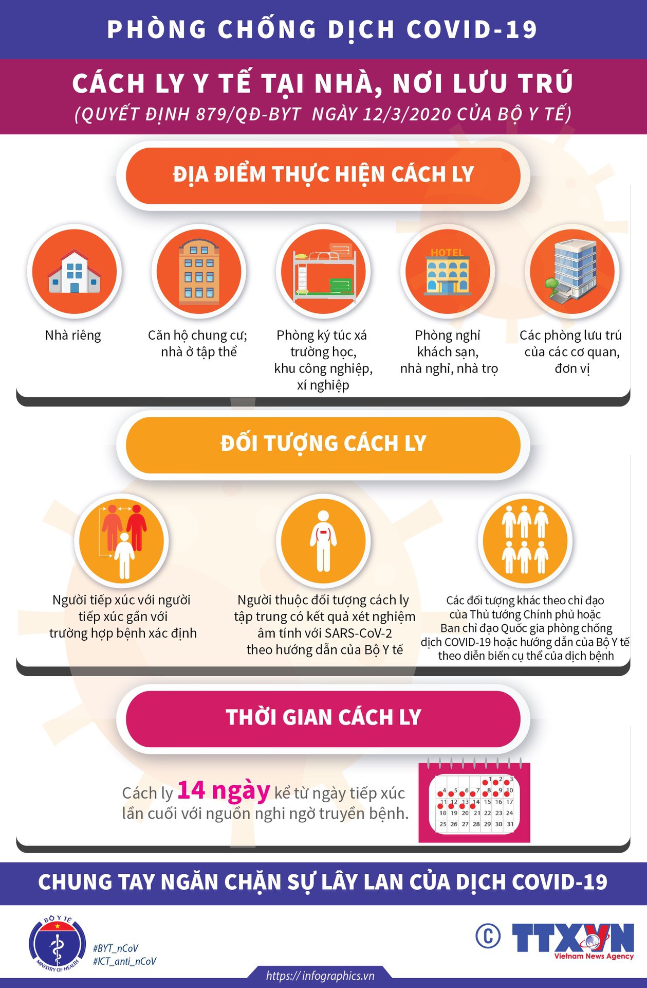 THỜI GIAN CÁCH LY: 14 ngày kể từ ngày tiếp xúc lần cuối với nguồn nghi ngờ truyền nhiễm.