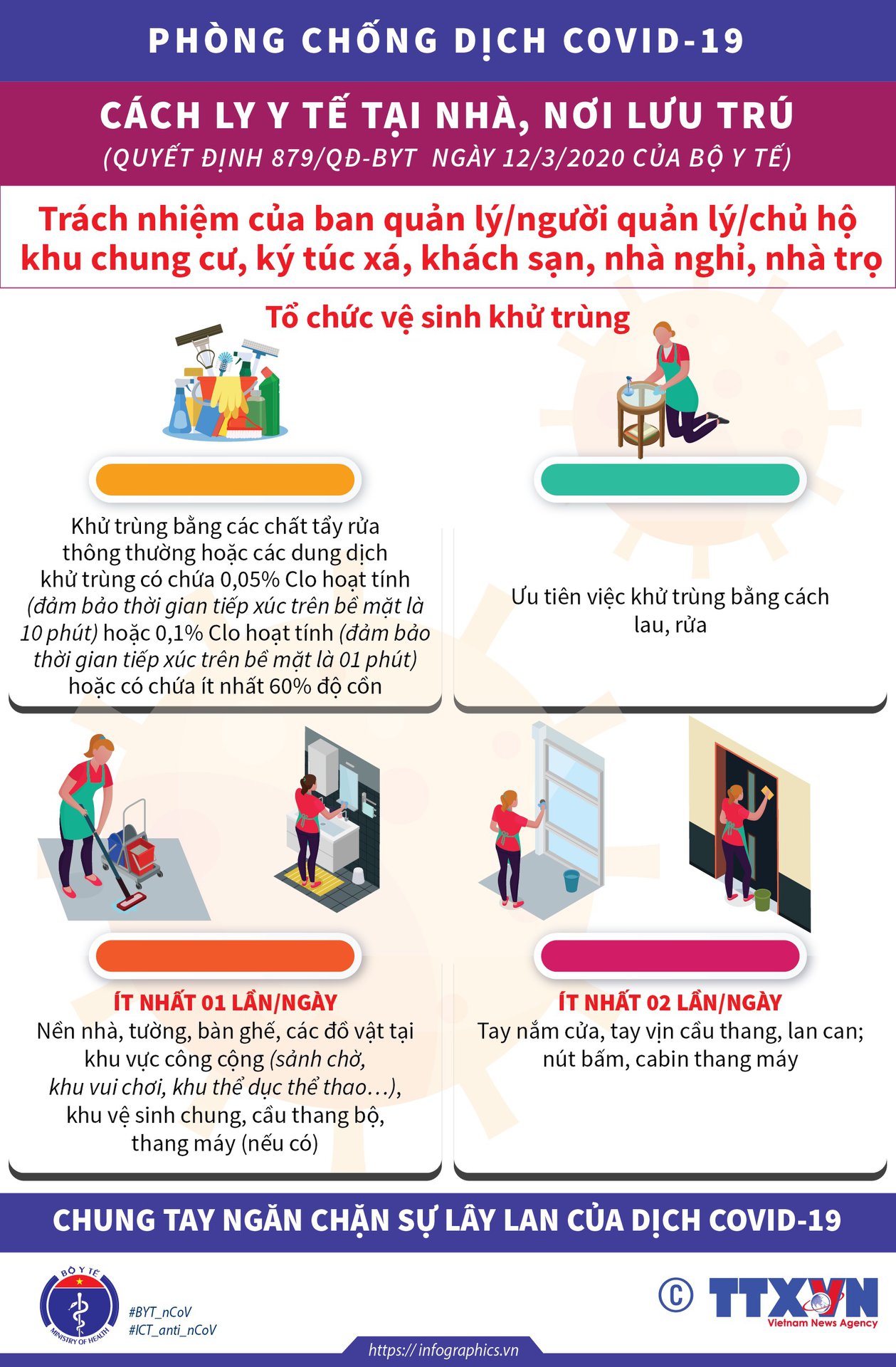 Lau nền nhà, bề mặt dụng cụ, tay nắm cửa ở nơi ở, nơi lưu trú hàng ngày bằng các chất tẩy rửa thông thường hoặc dung dịch khử trùng.
