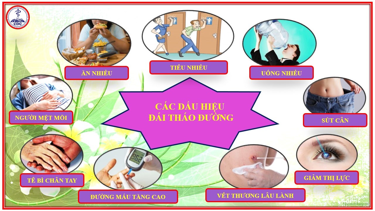Dấu hiệu nhận biết về ĐTĐ: khát nước/uống nhiều, mau đói/ăn nhiều, đi tiểu nhiều lần, xét nghiệm đường trong nước tiểu tăng cao, giảm cân, người mệt mõi, nhìn mờ, xuất hiện các vết nám hoặc tê bì chân tay, vết thương lâu lành…