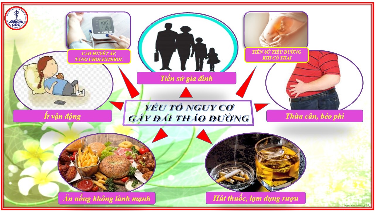 Các yếu tố nguy cơ của bệnh ĐTĐ: bao gồm di truyền, thói quen ăn uống không lành mạnh, ít vận động, béo phì, ĐTĐ thai kỳ. Chế độ ăn giàu đường và chất béo kèm theo lười vận động làm tăng nguy cơ mắc bệnh một cách đáng kể.