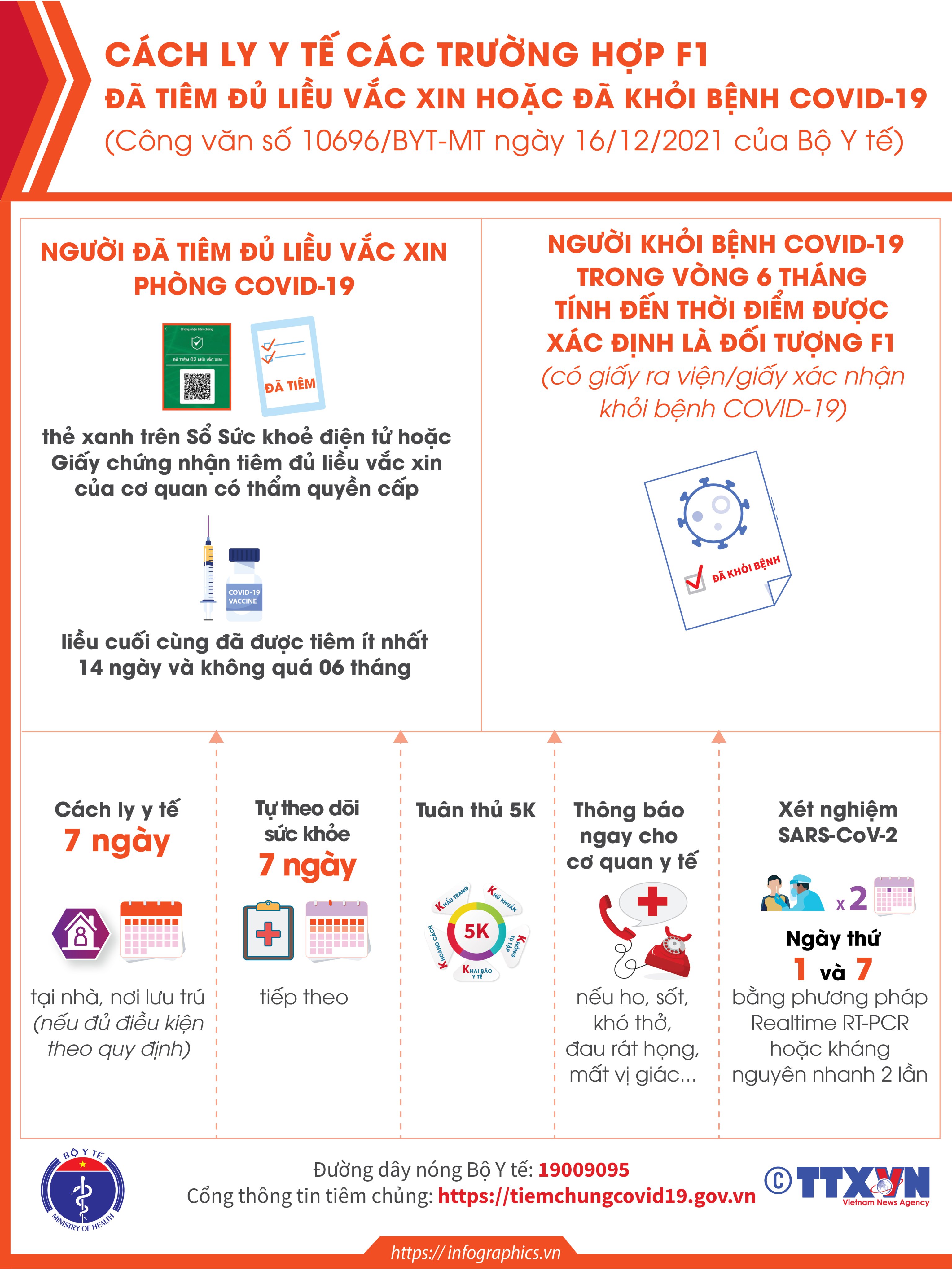 Ngày 16 tháng 12 năm 2021 Bộ Y tế ban hành công văn số: 10.696 /BYT- MT về việc cách ly y tế cho trường hợp F1 đã tiêm đủ liều vắc xin hoặc đã khỏi bệnh Covid-19 trong đó có nội dung: