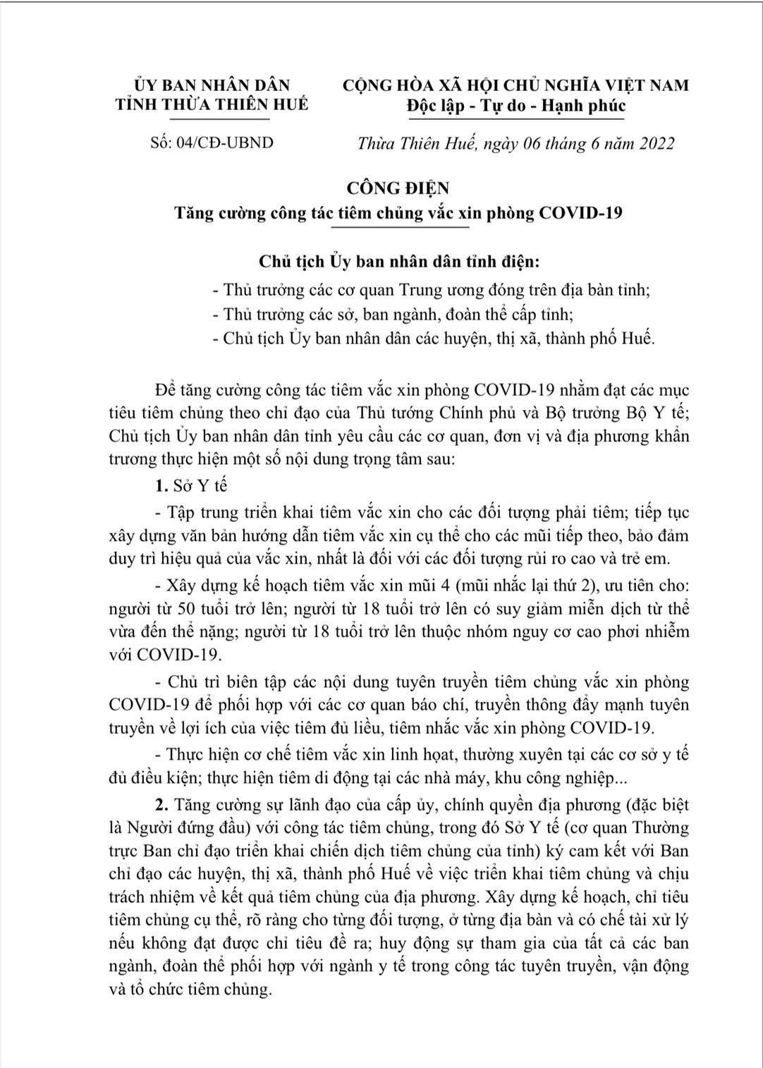 Để tăng cường công tác tiêm chủng nhằm đạt các mục tiêu tiêm chủng theo chỉ đạo của Thủ tướng Chính phủ và Bộ trưởng Bộ Y tế, UBND tỉnh Thừa Thiên Huế vừa có công điện số 04/CĐ-UBND ngày 06/6/2022 chỉ đạo các sở, ngành liên quan và các địa phương khẩn trương tăng cường công tác tiêm chủng vắc xin phòng COVID-19.