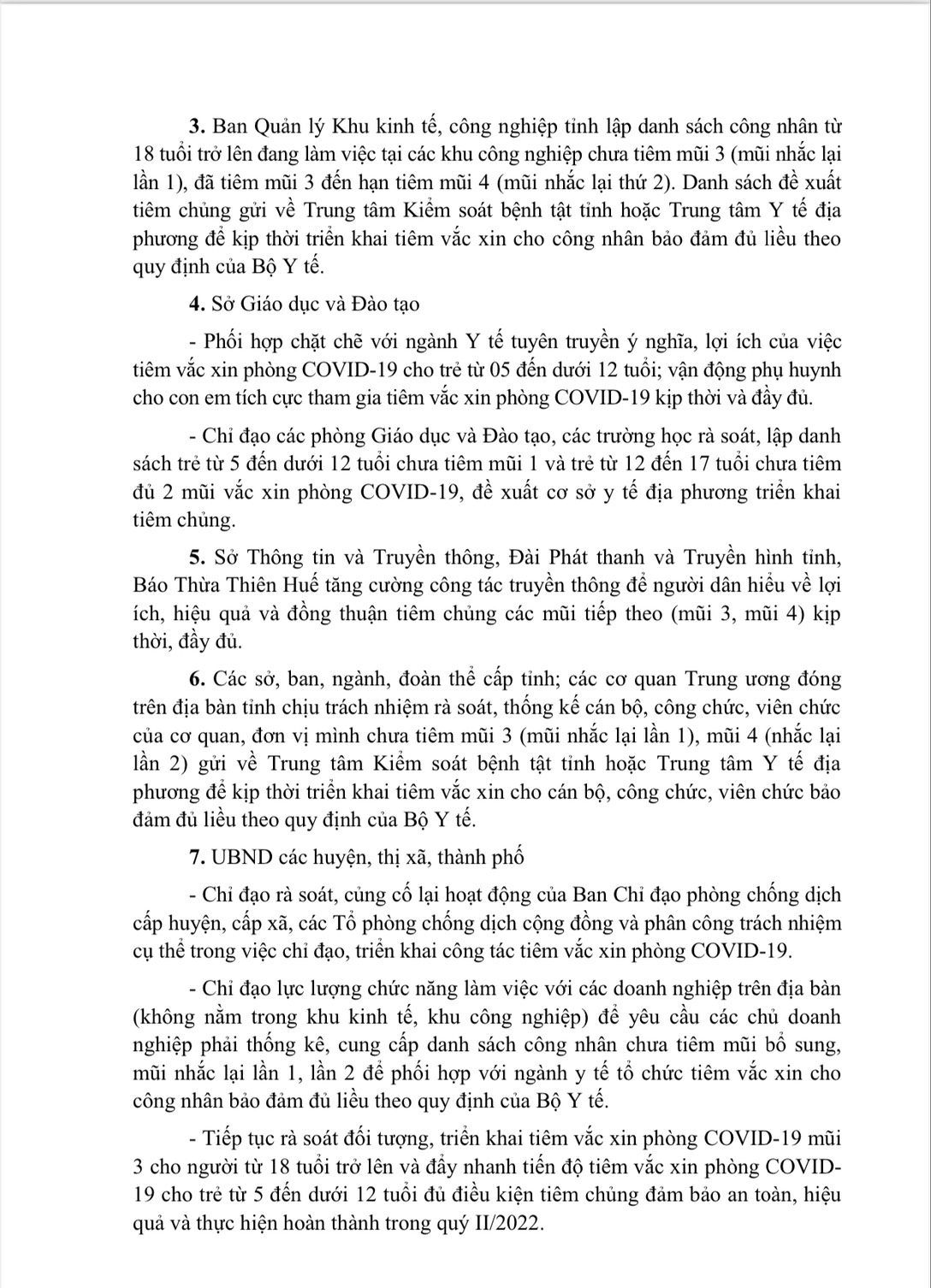 UBND các huyện, thị xã, thành phố chỉ đạo rà soát, củng cố lại hoạt động của Ban Chỉ đạo phòng chống dịch cấp huyện, cấp xã, các Tổ phòng chống dịch cộng đồng và phân công trách nhiệm cụ thể trong việc chỉ đạo, triển khai công tác tiêm vắc xin phòng Covid-19. Chỉ đạo lực lượng chức năng làm việc với các doanh nghiệp trên địa bàn (không nằm trong khu kinh tế, khu công nghiệp) để yêu cầu các chủ doanh nghiệp phải thống kê, cung cấp danh sách công nhân chưa tiêm mũi bổ sung, mũi nhắc lại lần 1, lần 2 để phối hợp với ngành y tế tổ chức tiêm vắc xin cho công nhân bảo đảm đủ liều theo quy định của Bộ Y tế. Tiếp tục rà soát đối tượng, triển khai tiêm vắc xin phòng Covid-19 mũi 3 cho người từ 18 tuổi trở lên và đẩy nhanh tiến độ tiêm vắc xin phòng Covid-19 cho trẻ từ 5 đến dưới 12 tuổi đủ điều kiện tiêm chủng đảm bả an toàn, hiệu quả và thực hiện hoàn thành trong quy II/2022. Tăng cường công tác tuyên truyền trên hệ thống đài phát thanh của địa phương để người dân hiểu về lợi ích, hiệu quả và đồng thuận tiêm chủng các mũi tiếp theo (mũi 3, mũi 4) kịp thời, đẩy đủ